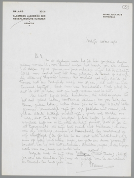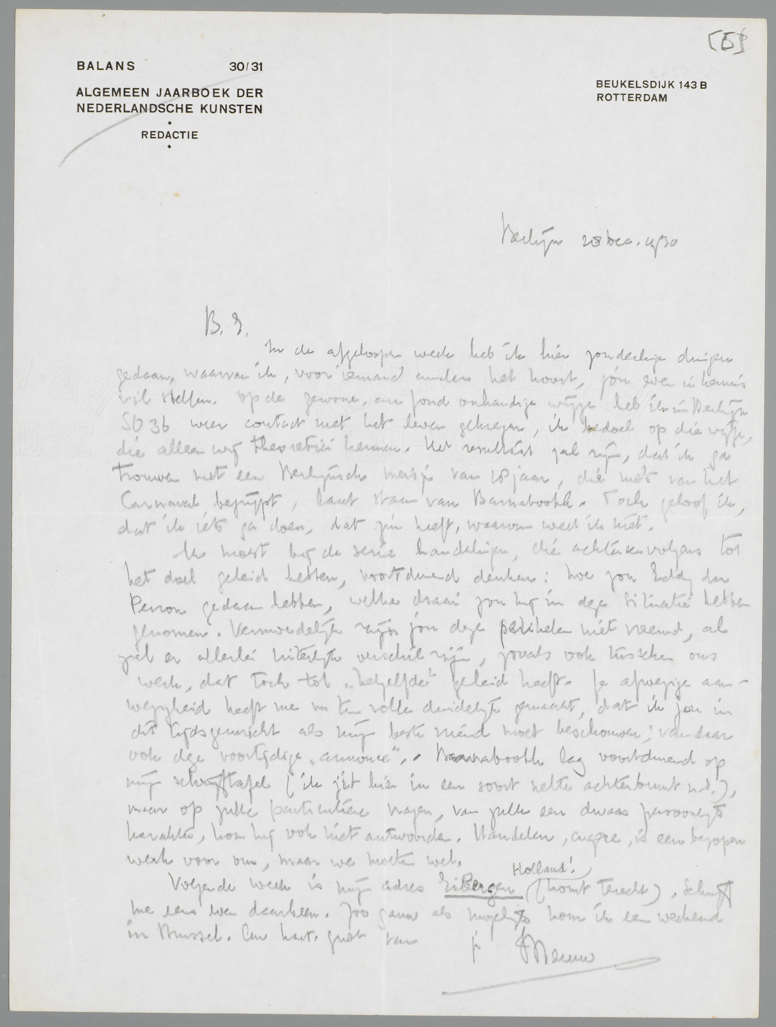 Ik moest bij de serie handelingen, die achtereenvolgens tot het doel geleid hebben, voortdurend denken: hoe zou Eddy du Perron gedaan hebben, welke draai zou hij in deze situatie hebben genomen. Vermoedelijk zijn jou deze perikelen niet vreemd, al zal er allerlei uiterlijk verschil zijn, zooals ook tusschen ons werk, dat toch tot ‘hetzelfde’ geleid heeft. Je afwezige aanwezigheid heeft me nu ten volle duidelijk gemaakt, dat ik jou in dit tijdsgewricht als mijn beste vriend moet beschouwen; vandaar ook deze voortijdige ‘annonce’. Barnabooth lag voortdurend op mijn schrijftafel (ik zit hier in een soort nette achterbuurt n.l.), maar op zulke particuliere vragen, van zulk een dwaas persoonlijk karakter, kon hij ook niet antwoorden. Handelen, agere, is een bezopen werk voor ons, maar we moeten wel.