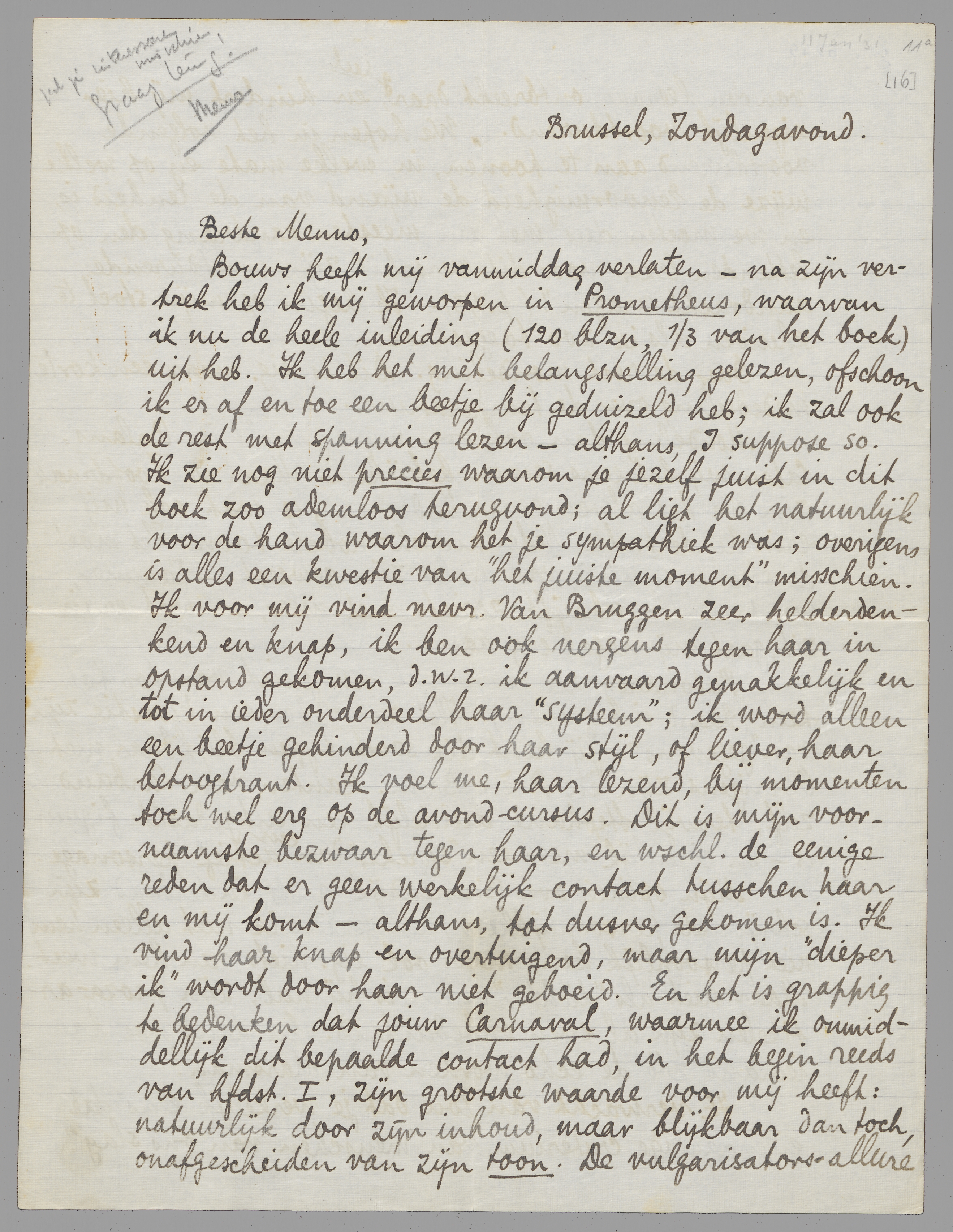 Bouws heeft mij vanmiddag verlaten - na zijn vertrek heb ik mij geworpen in Prometheus, waarvan ik nu de heele inleiding (120 blzn, 1/3 van het boek) uit heb. Ik heb het met belangstelling gelezen, ofschoon ik er af en toe een beetje bij geduizeld heb; ik zal ook de rest met spanning lezen - althans, I suppose so. Ik zie nog niet precies waarom je jezelf juist in dit boek zoo ademloos terugvond; al ligt het natuurlijk voor de hand waarom het je sympathiek was; overigens is alles een kwestie van ‘het juiste moment’ misschien. Ik voor mij vind mevr. Van Bruggen zeer helderdenkend en knap, ik ben ook nergens tegen haar in opstand gekomen, d.w.z. ik aanvaard gemakkelijk en tot in ieder onderdeel haar ‘systeem’; ik word alleen een beetje gehinderd door haar stijl, of liever, haar betoogtrant. Ik voel me, haar lezend, bij momenten toch wel erg op de avond-cursus. Dit is mijn voornaamste bezwaar tegen haar, en wschl. de eenige reden dat er geen werkelijk contact tusschen haar en mij komt - althans, tot dusver gekomen is. Ik vind haar knap en overtuigend, maar mijn ‘dieper ik’ wordt door haar niet geboeid. En het is grappig te bedenken dat jouw Carnaval, waarmee ik onmiddellijk dit bepaalde contact had, in het begin reeds van hfdst. I, zijn grootste waarde voor mij heeft: natuurlijk door zijn inhoud, maar blijkbaar dan toch, onafgescheiden van zijn toon. De vulgarisators-allure van den leraar ontbreekt daar geheel, en hindert mij hier eigenlijk voortdurend. ‘We hopen in het volgende voortdurend aan te toonen, in welke mate en op welke wijze de Eenvormigheid de vijand van de Eenheid is, en we moeten dus met den meesten aandrang den oplettenden lezer voor dit verschil zijn voortdurende aandracht vragen’. (p. 43). Ik begin op mijn stoel te schuiven als ik zoo toegesproken word.