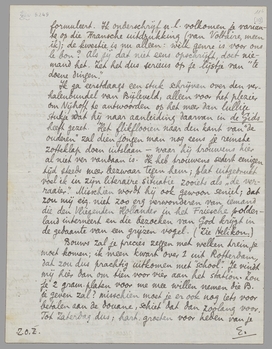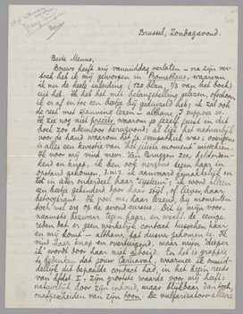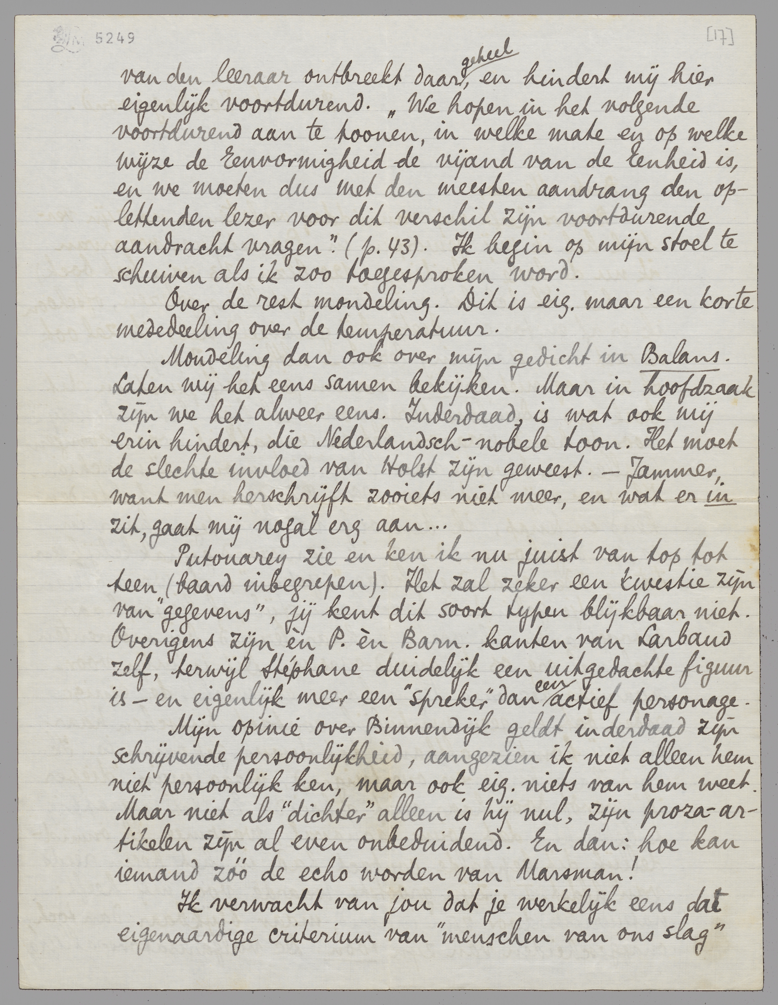 Mondeling dan ook over mijn gedicht in Balans. Laten wij het eens samen bekijken. Maar in hoofdzaak zijn we het alweer eens. Inderdaad, is wat ook mij erin hindert, die Nederlandsch-nobele toon. Het moet de slechte invloed van Holst zijn geweest. - Jammer, want men herschrijft zooiets niet meer, en wat er in zit, gaat mij nogal erg aan...