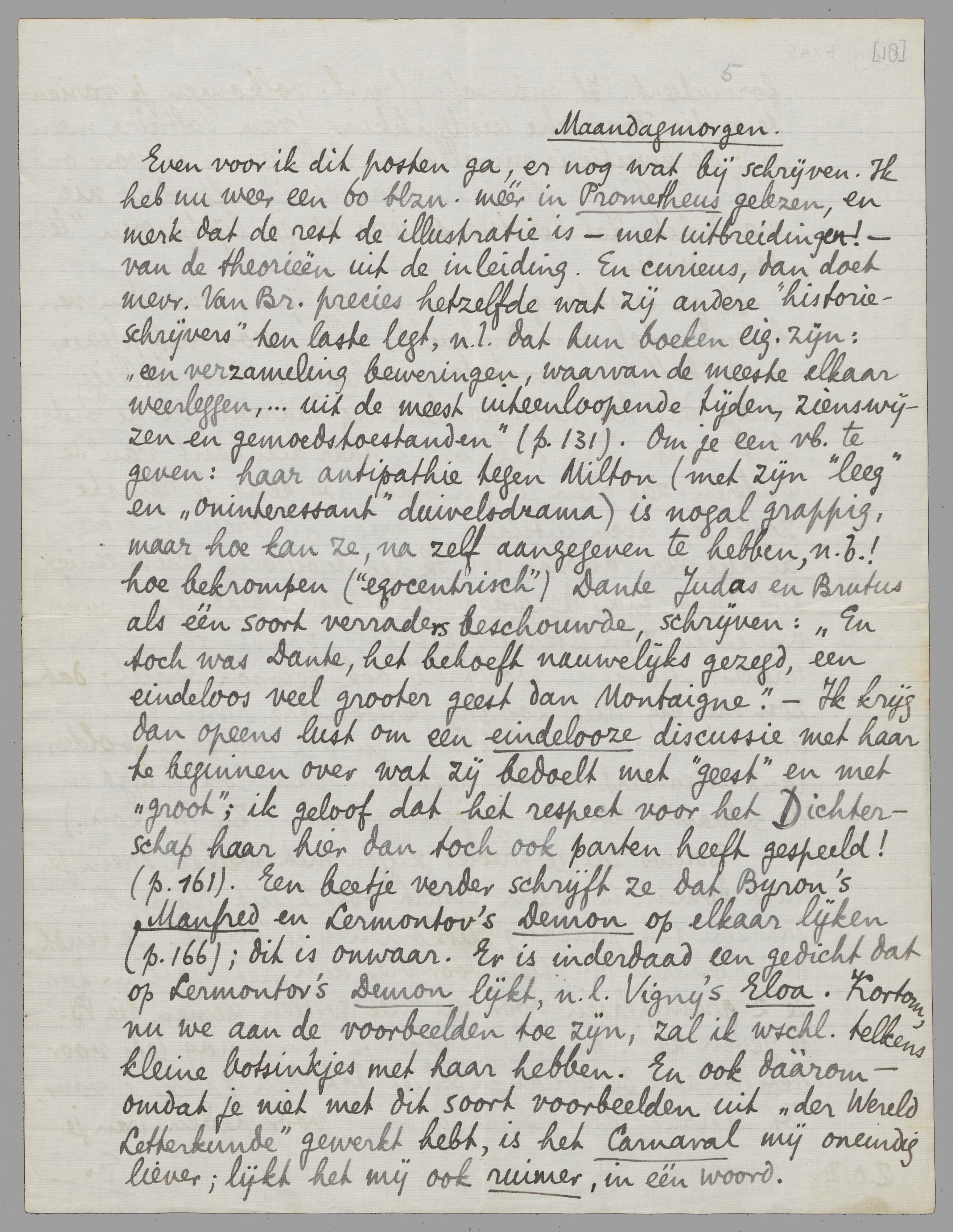 Even voor ik dit posten ga, er nog wat bij schrijven. Ik heb nu weer een 60 blzn. méér in Prometheus gelezen, en merk dat de rest de illustratie is - met uitbreidingen! - van de theorieën uit de inleiding. En curieus, dan doet mevr. Van Br. precies hetzelfde wat zij andere ‘historieschrijvers’ ten laste legt, n.l. dat hun boeken eig. zijn: een verzameling beweringen, waarvan de meeste elkaar weerleggen,... uit de meest uiteenloopende tijden, zienswijzen en gemoedstoestanden (p. 131). Om je een vb. te geven: haar antipathie tegen Milton (met zijn ‘leeg’ en ‘oninteressant’ duivelsdrama) is nogal grappig, maar hoe kan ze, na zelf aangegeven te hebben, n.b.! hoe bekrompen (‘egocentrisch’) Dante Judas en Brutus als één soort verraders beschouwde, schrijven: ‘En toch was Dante, het behoeft nauwelijks gezegd, een eindeloos veel grooter geest dan Montaigne’. - Ik krijg dan opeens lust om een eindelooze discussie met haar te beginnen over wat zij bedoelt met ‘geest’ en met ‘groot’; ik geloof dat het respect voor het Dichterschap haar hier dan toch ook parten heeft gespeeld! (p. 161). Een beetje verder schrijft ze dat Byron's Manfred en Lermontov's Demon op elkaar lijken (p. 166); dit is onwaar. Er is inderdaad een gedicht dat op Lermontov's Demon lijkt, n.l. Vigny's Eloa. Kortom, nu we aan de voorbeelden toe zijn, zal ik wschl. telkens kleine botsinkjes met haar hebben. En ook dáárom - omdat je niet met dit soort voorbeelden uit ‘der Wereld Letterkunde’ gewerkt hebt, is het Carnaval mij oneindig liever; lijkt het mij ook ruimer, in één woord.
