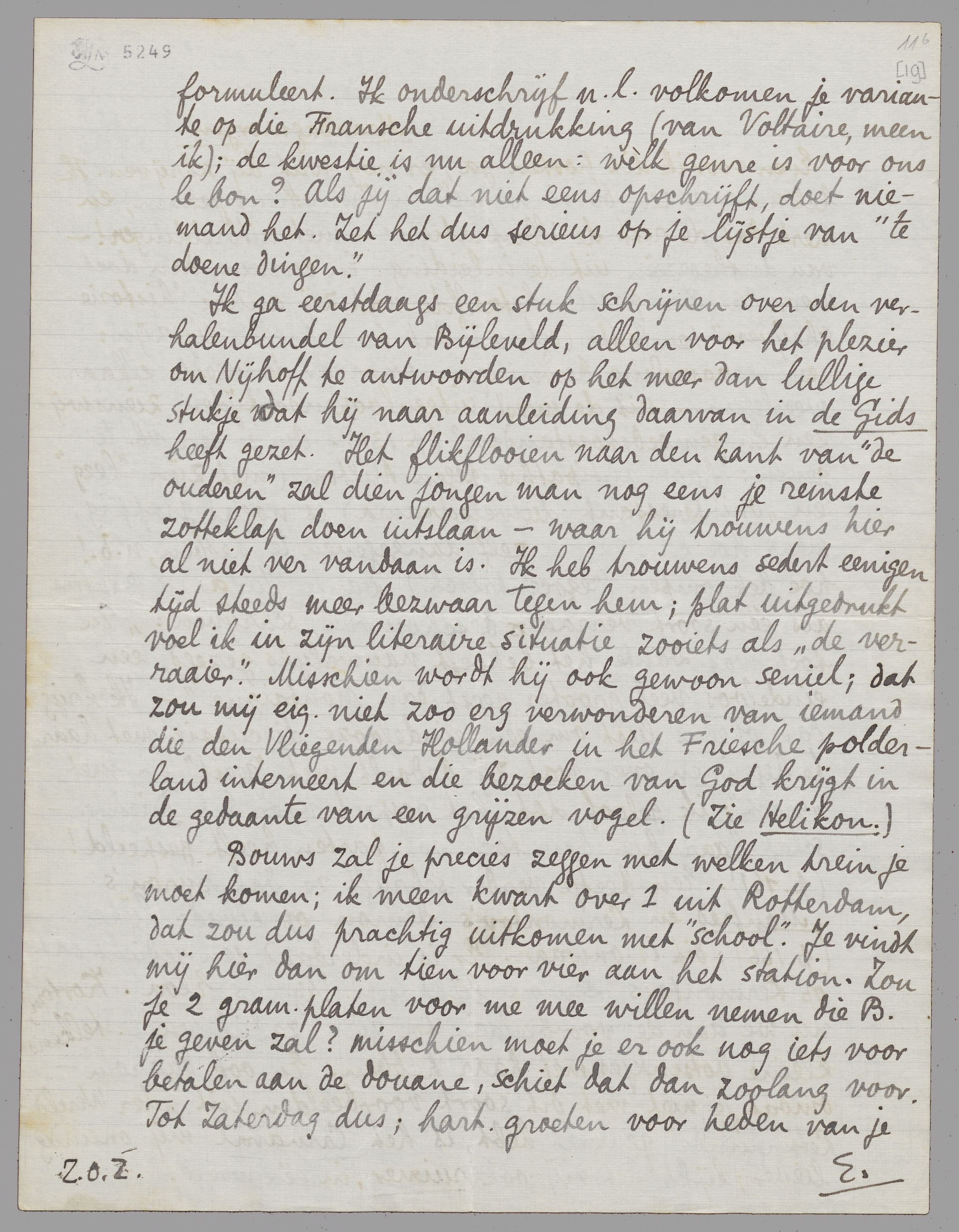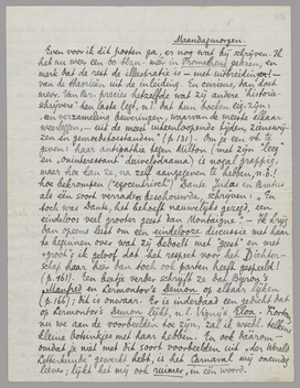 Ik ga eerstdaags een stuk schrijven over den verhalenbundel van Bijleveld, alleen voor het plezier om Nijhoff te antwoorden op het meer dan lullige stukje dat hij naar aanleiding daarvan in de Gids heeft gezet. Het flikflooien naar den kant van ‘de ouderen’ zal dien jongen man nog eens je reinste zotteklap doen uitslaan - waar hij trouwens hier al niet ver vandaan is. Ik heb trouwens sedert eenigen tijd steeds meer bezwaar tegen hem; plat uitgedrukt voel ik in zijn literaire situatie zooiets als ‘de verraaier’. Misschien wordt hij ook gewoon seniel; dat zou mij eig. niet zoo erg verwonderen van iemand die den Vliegenden Hollander in het Friesche polderland interneert en die bezoeken van God krijgt in de gedaante van een grijzen vogel. (Zie Helikon).