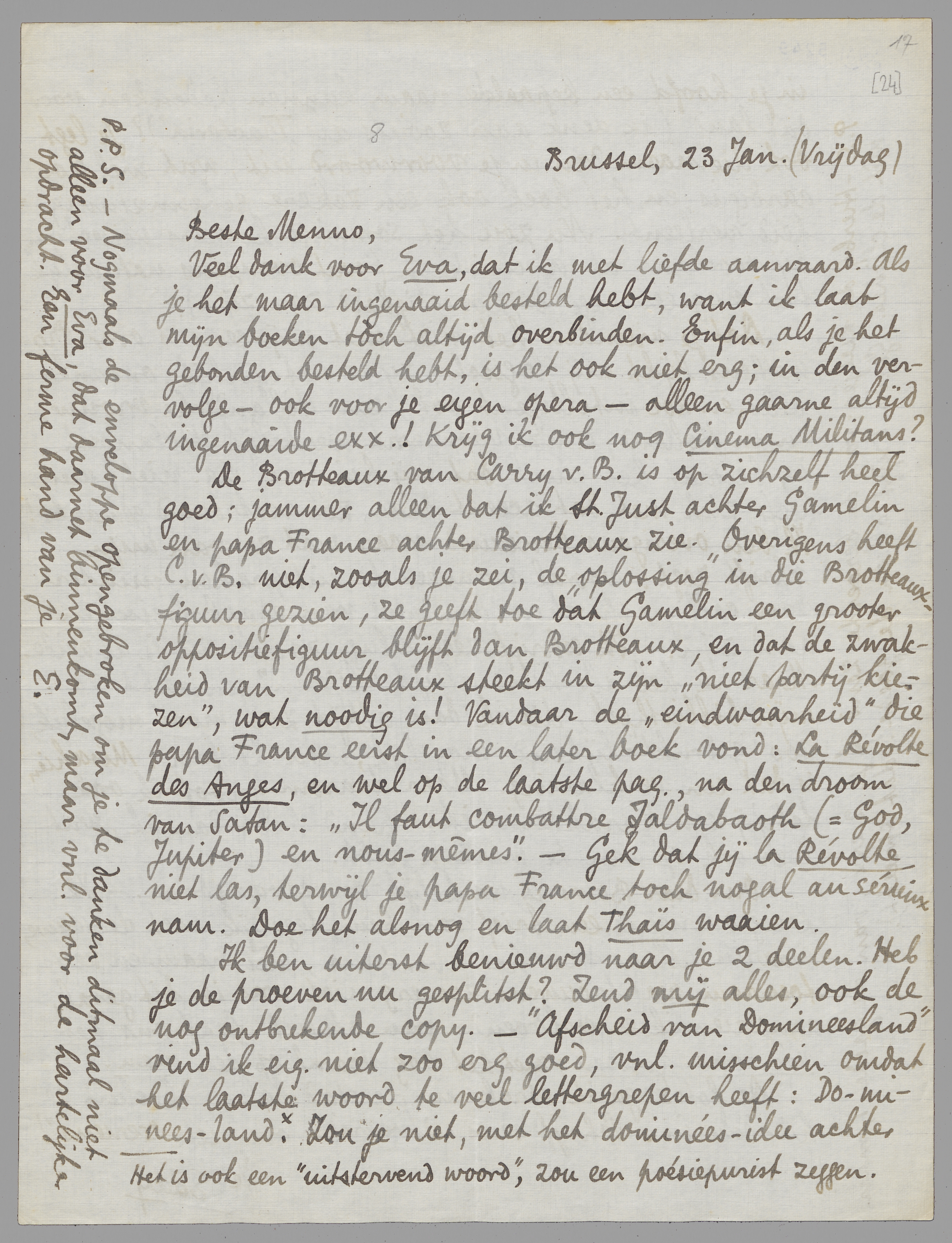 De Brotteaux van Carry v.B. is op zichzelf heel goed; jammer alleen dat ik St. Just achter Gamelin en papa France achter Brotteaux zie. Overigens heeft C.v.B. niet, zooals je zei, de ‘oplossing’ in die Brotteaux-figuur gezien, ze geeft toe dat Gamelin een grooter oppositiefiguur blijft dan Brotteaux, en dat de zwakheid van Brotteaux steekt in zijn ‘niet partij kiezen’, wat noodig is! Vandaar de ‘eindwaarheid’, die papa France eerst in een later boek vond: La Révolte des Anges, en wel op de laatste pag., na den droom van Satan: ‘Il faut combattre Jaldabaoth (= God, Jupiter) en nous-mêmes’. - Gek dat jij la Révolte niet las, terwijl je papa France toch nogal au sérieux nam. Doe het alsnog en laat Thaïs waaien.