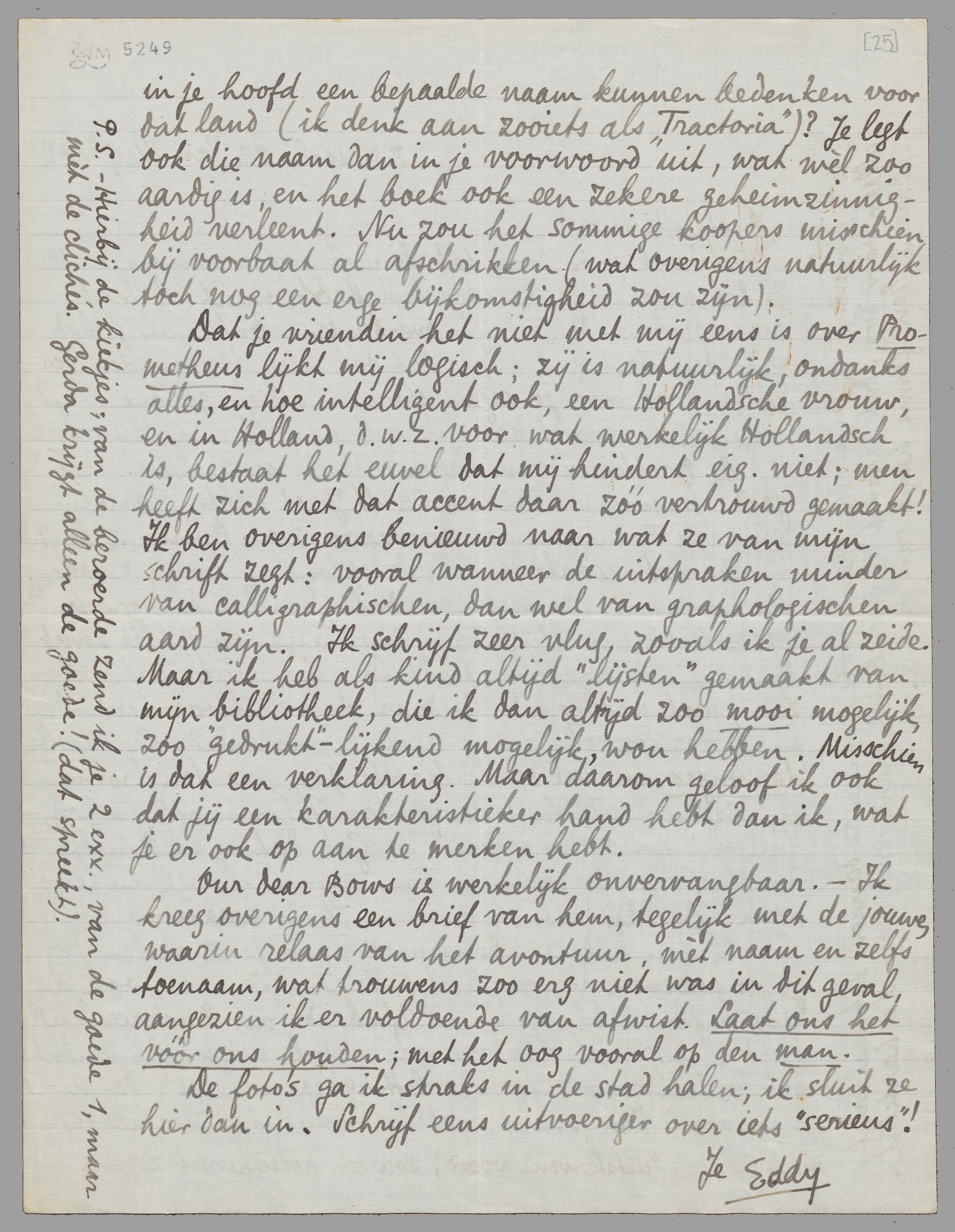 Dat je vriendin het niet met mij eens is over Prometheus lijkt mij logisch; zij is natuurlijk, ondanks alles, en hoe intelligent ook, een Hollandsche vrouw, en in Holland, d.w.z. voor wat werkelijk Hollandsch is, bestaat het euvel dat mij hindert eig. niet; men heeft zich met dat accent daar zóó vertrouwd gemaakt! Ik ben overigens benieuwd naar wat ze van mijn schrift zegt: vooral wanneer de uitspraken minder van calligraphischen, dan wel van graphologischen aard zijn. Ik schrijf zeer vlug, zooals ik je al zeide. Maar ik heb als kind altijd ‘lijsten’ gemaakt van mijn bibliotheek, die ik dan altijd zoo mooi mogelijk, zoo ‘gedrukt’-lijkend mogelijk, wou hebben. Misschien is dat een verklaring. Maar daarom geloof ik ook dat jij een karakteristieker hand hebt dan ik, wat je er ook op aan te merken hebt. Our dear Bows is werkelijk onvervangbaar. - Ik kreeg overigens een brief van hem, tegelijk met de jouwe, waarin relaas van avontuur, met naam en zelfs toenaam, wat trouwens zoo erg niet was in dit geval, aangezien ik er voldoende van afwist. Laat ons het vóór ons houden; met het oog vooral op den man.