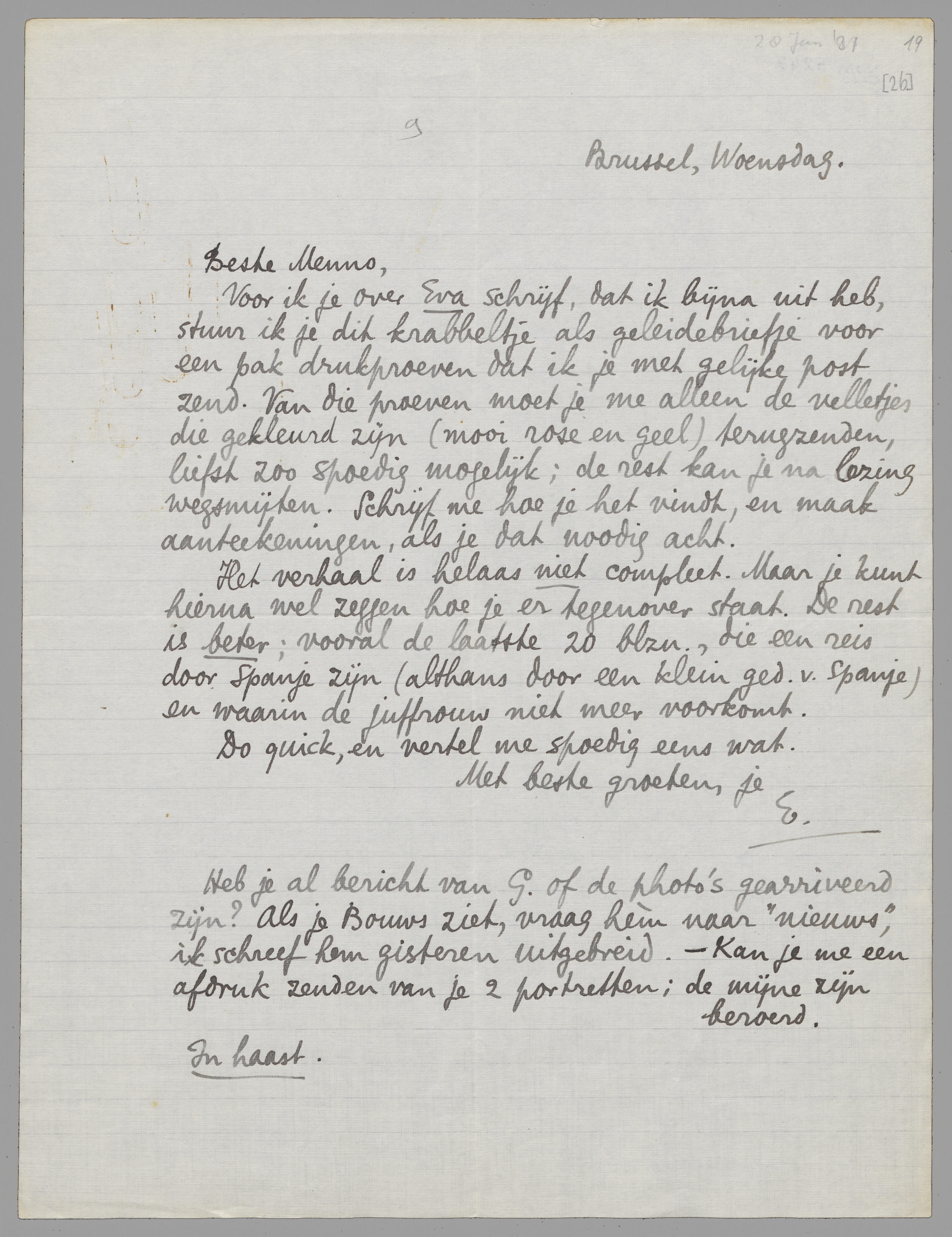 Voor ik je over Eva schrijf, dat ik bijna uit heb, stuur ik je dit krabbeltje als geleidebriefje voor een pak drukproeven dat ik je met gelijke post zend. Van die proeven moet je me alleen de velletjes die gekleurd zijn (mooi rose en geel) terugzenden, liefst zoo spoedig mogelijk; de rest kan je na lezing wegsmijten. Schrijf me hoe je het vindt, en maak aanteekeningen, als je dat noodig acht.