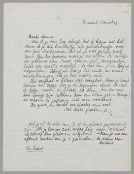 Heb je al bericht van G. of de photo's gearriveerd zijn? Als je Bouws ziet, vraag hèm naar ‘nieuws’, ik schreef hem gisteren uitgebreid. - Kan je me een afdruk zenden van je 2 portretten; de mijne zijn beroerd.