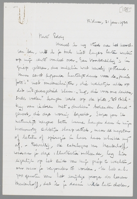 Zoodra ik weer beter ben, maak ik alles voor Domineesland in orde. Alles is daarvoor gezet, ook De Wegen, behalve dan de inleiding, die ik nog schrijven moet. - Dat je het stukje over Coolidge hebt laten zetten, is stout, want ik had het verdoemd, maar het kan wel in deel 2, als een entrefiletje. Het is m.i. niet onaardig en heeft destijds zelfs een prijsvraag in het vrijzinnig-protestantsch weekblad De Stroom ontketend; maar ik moet het dan toch ietwat serreeren. -
