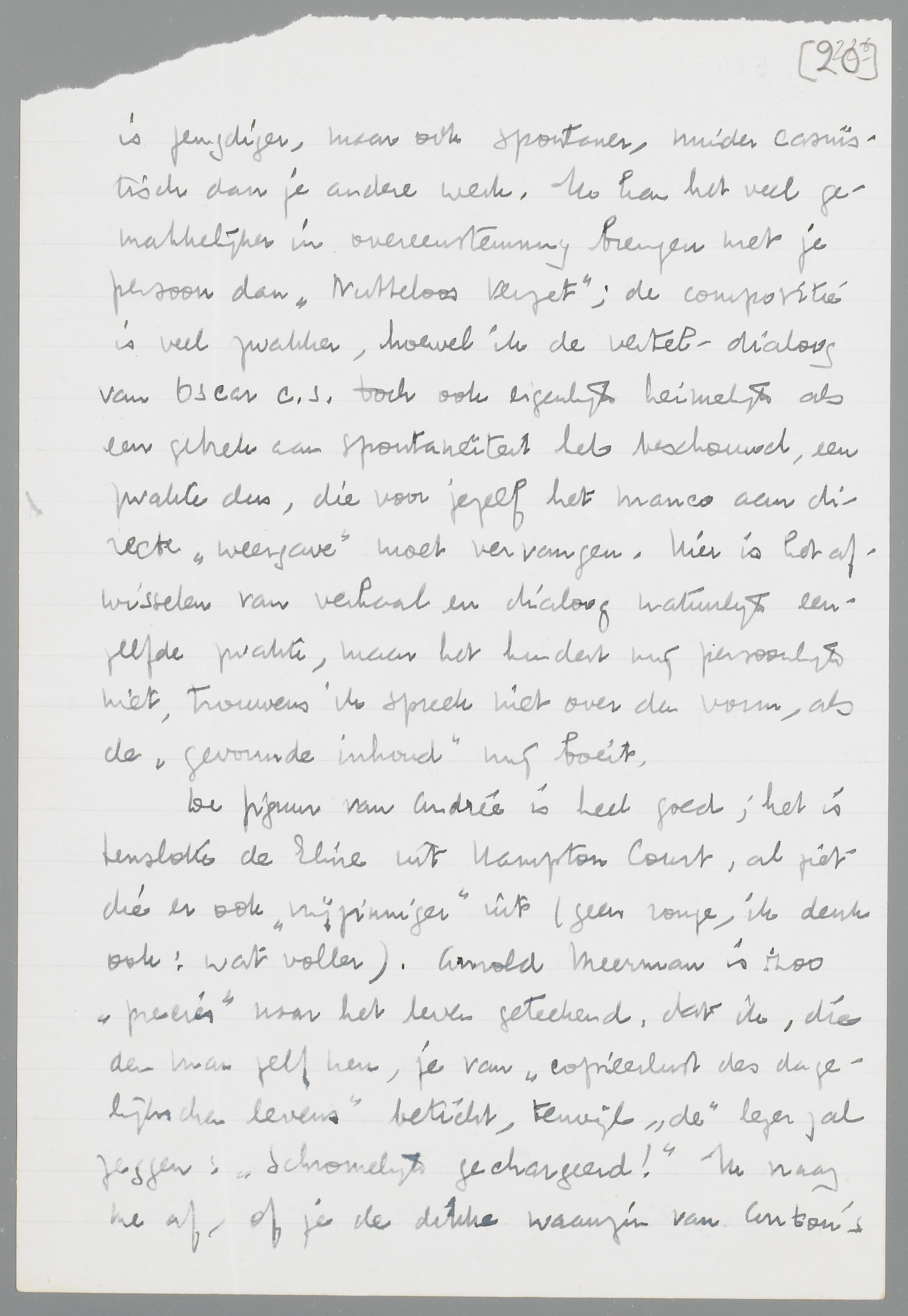 Nu Een Voorbereiding. Ik aanvaard de opdracht graag. Niet, omdat ik het een meesterwerk vind, maar omdat de sfeer mij eigenlijk nader staat, verwanter is dan die van Nutteloos Verzet b.v. (In de andere boeken lees ik juist, schrijf ik later over). Vooral, omdat het mutatis mutandis de algeheele parallel van Hampton Court is, dat ik graag aan je had opgedragen, maar dat al voor ik je kende, beloofd was aan het model voor den hoofdschurk van Haaften, zekere Jacques de Thouars. Doet er niet toe, de verwantschap is er toch, het verschil is er ook. - Een Voorbereiding is jeugdiger, maar ook spontaner, minder casuïstisch dan je andere werk. Ik kan het veel gemakkelijker in overeenstemming brengen met je persoon dan Nutteloos Verzet; de compositie is veel zwakker, hoewel ik de vertel-dialoog van Oscar c.s. toch ook eigenlijk heimelijk als een gesprek aan spontanïteit heb beschouwd, een zwakte dus, die voor jezelf het manco aan directe ‘weergave’ moet vervangen. Hier is het afwisselen van verhaal en dialoog natuurlijk eenzelfde zwakte, maar het hindert mij persoonlijk niet, trouwens ik spreek niet over den vorm, als de ‘gevormde inhoud’ mij boeit.