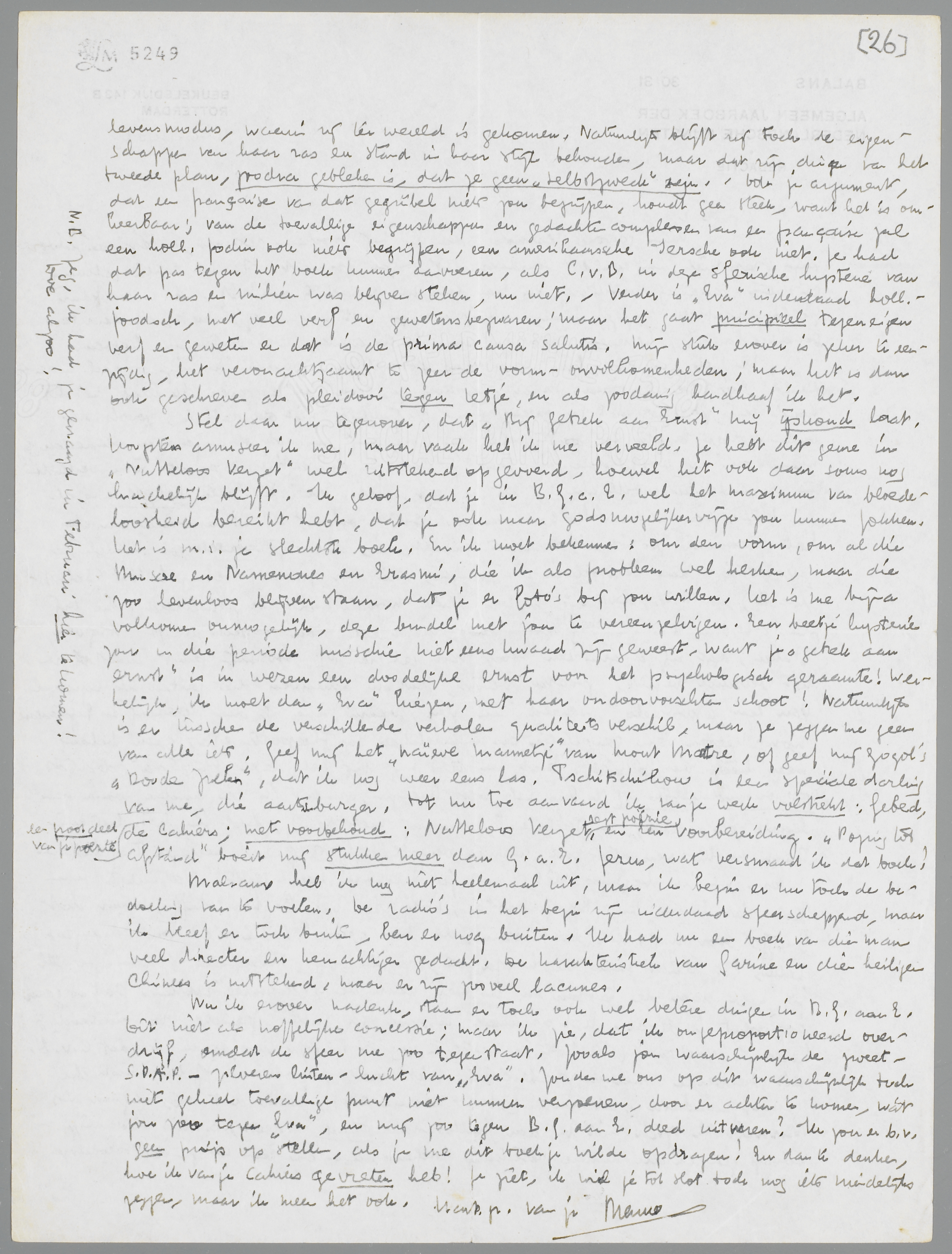 Nu ik erover nadenk, staan er toch ook wel betere dingen in B.G. aan E. Dit niet als hoffelijke concessie; maar ik zie, dat ik ongeproportioneerd overdrijf, omdat de sfeer me zoo tegenstaat. Zooals jou waarschijnlijk de zweet-S.D.A.P.-zilveren linten-lucht van Eva. Zouden we ons op dit waarschijnlijk toch niet geheel toevallige punt niet kunnen verzoenen, door er achter te komen, wat jou zoo tegen Eva, en mij zoo tegen B.G. aan E. deed uitvaren? Ik zou er b.v. geen prijs op stellen, als je me dit boekje wilde opdragen! En dan te denken, hoe ik van je Cahiers gevreten heb! Je ziet, ik wil je tot slot toch nog iets vriendelijks zeggen, maar ik meen het ook. Hart. gr. van je