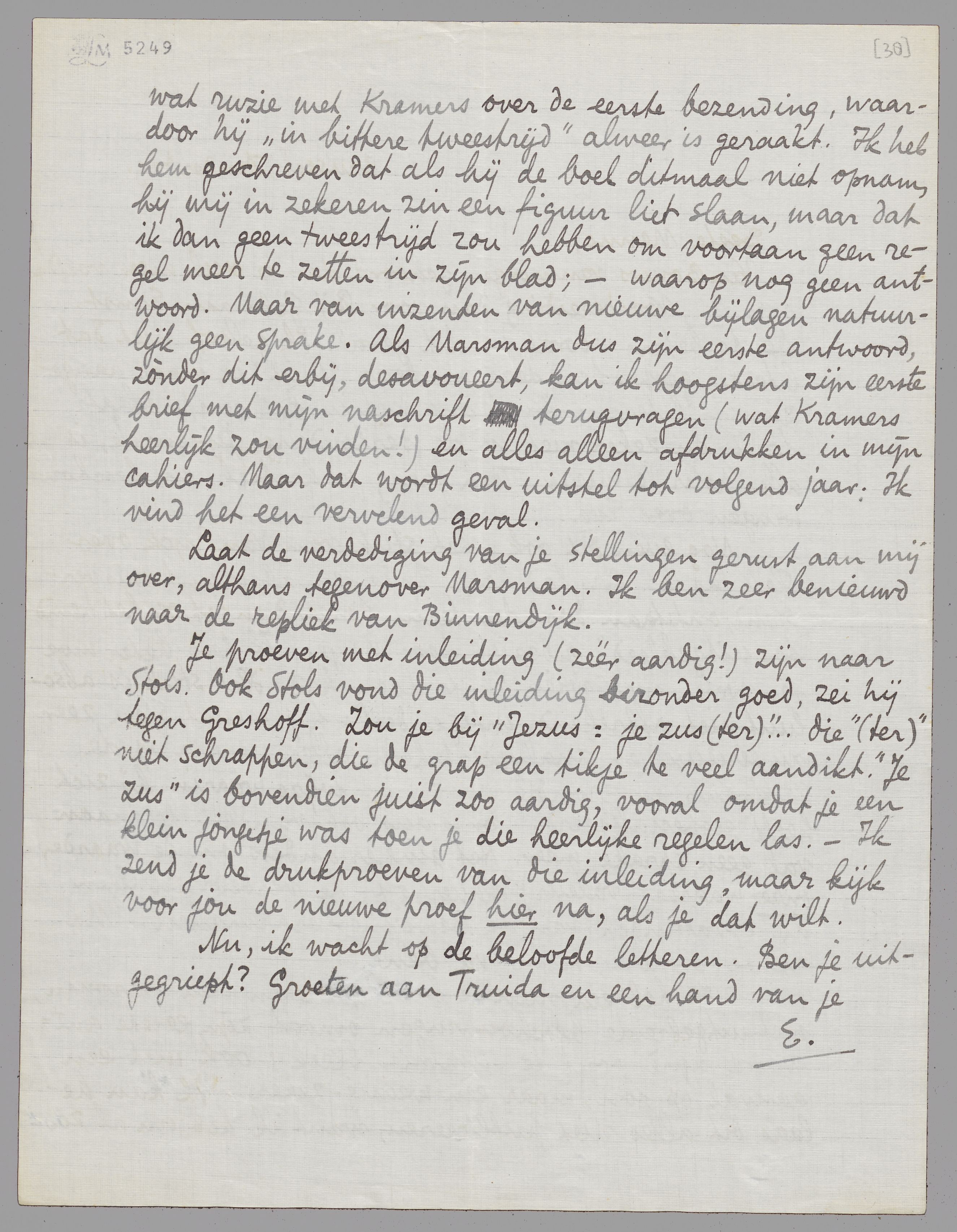 Ik heb een nieuwe brief gekregen van Marsman, met uitgebreide beschouwingen omdat zijn eerste antwoord après tout te summier bleek; ook met een aanval op jou, maar een weinig-zekere. Ik kan helaas dit alles niet publiceeren, want ik heb nu al zoowat ruzie met Kramers over de eerste bezending, waardoor hij ‘in bittere tweestrijd’ alweer is geraakt. Ik heb hem geschreven dat als hij de boel ditmaal niet opnam, hij mij in zekeren zin een figuur liet slaan, maar dat ik dan geen tweestrijd zou hebben om voortaan geen regel meer te zetten in zijn blad; - waarop nog geen antwoord. Maar van inzenden van nieuwe bijlagen natuurlijk geen sprake. Als Marsman dus zijn eerste antwoord, zònder dit erbij, desavoueert, kan ik hoogstens zijn eerste brief met mijn naschrift terugvragen (wat Kramers heerlijk zou vinden!) en alles alleen afdrukken in mijn cahiers. Maar dat wordt een uitstel tot volgend jaar. Ik vind het een vervelend geval.