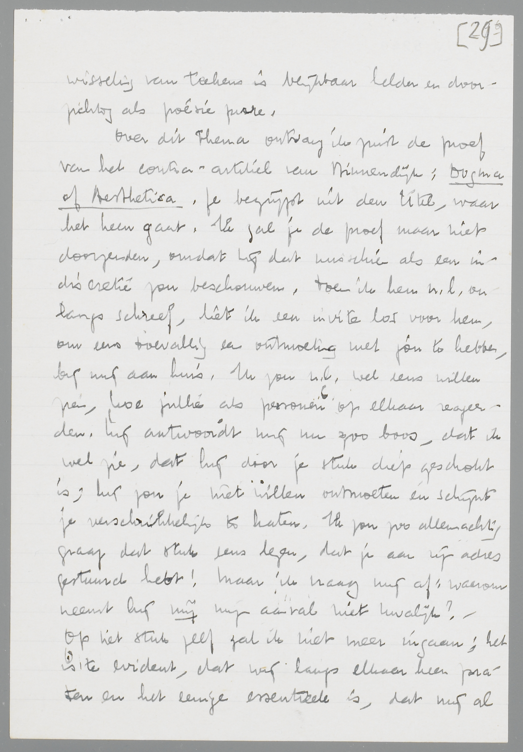 Over dit thema ontvang ik juist de proef van het contra-artikel van Binnendijk: Dogma of Aesthetica. Je begrijpt uit den titel, waar het heen gaat. Ik zal je de proef maar niet doorzenden, omdat hij dat misschien als een indiscretie zou beschouwen. Toen ik hem n.l. onlangs schreef, liet ik een invite los voor hem, om eens toevallig een ontmoeting met jou te hebben, bij mij aan huis. Ik zou n.l. wel eens willen zien, hoe jullie als personen op elkaar reageerden. Hij antwoordt mij nu zoo boos, dat ik wel zie, dat hij door je stuk diep geschokt is; hij zou je niet willen ontmoeten en schijnt je verschrikkelijk te haten. Ik zou zoo allemachtig graag dat stuk eens lezen, dat je aan zijn adres gestuurd hebt! Maar ik vraag mij af: waarom neemt hij mij mijn aanval niet kwalijk? - Op het stuk zelf zal ik niet meer ingaan; het is te evident, dat wij langs elkaar heen praten en het eenige essentieele is, dat mij al die schoonheid niets schelen kan, als ze niet afschaduwing is van een vent, terwijl hij het kleinste graantje schoonheid (in de poëzie dan) zorgvuldig op wil pikken. Enfin, je moet het zelf maar lezen. De kern van mijn carnavalsmoraal ontgaat hem. Hij beschuldigt mij trouwens ook van onoorspronkelijkheid. ‘Moet ik zeggen, dat het Carn. d. Burgers verre van oorspronkelijk is, juist als idee? Dat b.v. Carry v. Bruggen (Prometheus, Hedendaagsch Fetichisme) aan de geboorte een meer dan zedelijk aandeel heeft gehad?’ Dat is natuurlijk waar, maar ik vind die verhouding toch niet dezelfde als b.v. Marsman: Gabriel Smit.