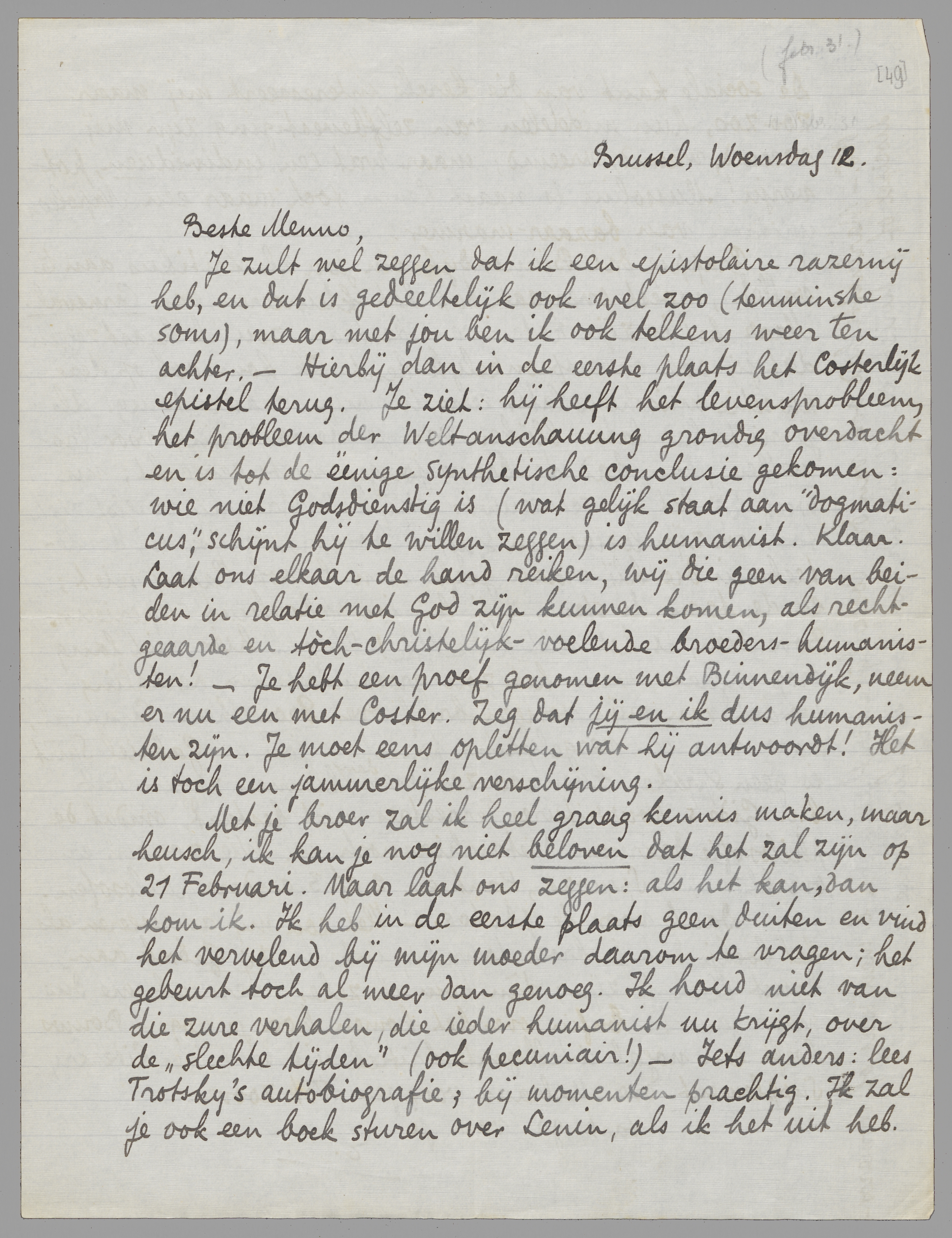 Met je broer zal ik heel graag kennis maken, maar heus, ik kan je nog niet beloven dat het zal zijn op 21 Februari. Maar laat ons zeggen: als het kan, dan kom ik. Ik heb in de eerste plaats geen duiten en vind het vervelend bij mijn moeder daarom te vragen; het gebeurt toch al meer dan genoeg. Ik houd niet van die zure verhalen, die ieder humanist nu krijgt, over de ‘slechte tijden’ (ook pecuniair!) - Iets anders: lees Trotsky's autobiografie; bij momenten prachtig. Ik zal je ook een boek sturen over Lenin, als ik het uit heb. De sociale kant van die kerels interesseert mij maar zoo-zoo, hun middelen van zelfbevestiging zijn mij vreemd, vreemd, vreemd; maar wat een individuen, potverju! Mussolini is naast Lenin toch maar een Napoleon-imitatie van bazaar-marmer.