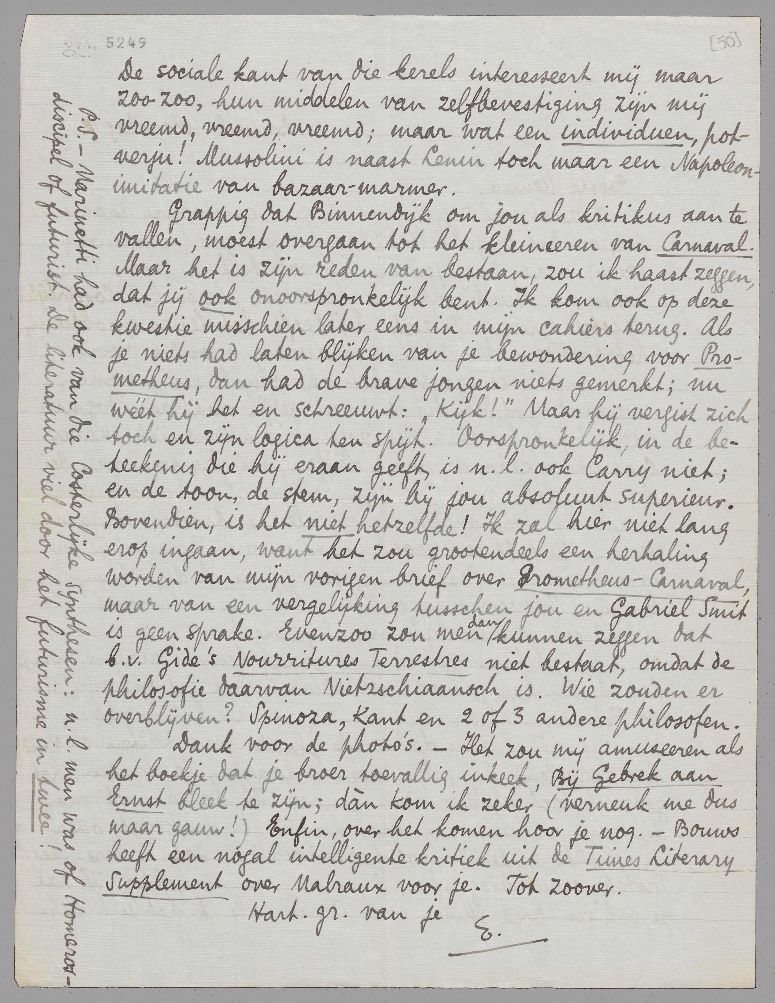 Grappig dat Binnendijk om jou als kritikus aan te vallen, moest overgaan tot het kleineeren van Carnaval. Maar het is zijn reden van bestaan, zou ik haast zeggen, dat jij ook onoorspronkelijk bent. Ik kom ook op deze kwestie misschien later eens in mijn cahiers terug. Als je niets had laten blijken van je bewondering voor Prometheus, dan had de brave jongen niets gemerkt; nu wéét hij het en schreeuwt: ‘Kijk!’ Maar hij vergist zich toch en zijn logica ten spijt. Oorspronkelijk, in de beteekenis die hij eraan geeft, is n.l. ook Carry niet; en de toon, de stem, zijn bij jou absoluut superieur. Bovendien, is het niet hetzelfde! Ik zal hier niet lang erop ingaan, want het zou grootendeels een herhaling worden van mijn vorigen brief over Prometheus-Carnaval, maar van een vergelijking tusschen jou en Gabriel Smit is geen sprake. Evenzoo zou men dan kunnen zeggen dat b.v. Gide's Nourritures Terrestres niet bestaat, omdat de philosofie daarvan Nietzschiaansch is. Wie zouden er overblijven? Spinoza, Kant en 2 of 3 andere philosofen.