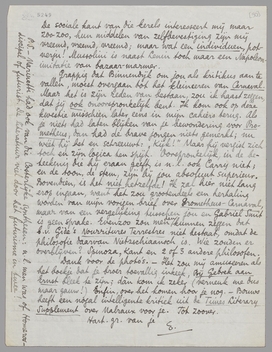 Je zult wel zeggen dat ik een epistolaire razernij heb, en dat is gedeeltelijk ook wel zoo (tenminste soms), maar met jou ben ik ook telkens weer ten achter. - Hierbij dan in de eerste plaats het Costerlijk epistel terug. Je ziet: hij heeft het levensprobleem, het probleem der Weltanschauung grondig overdacht en is tot de éénige synthetische conclusie gekomen: wie niet Godsdienstig is (wat gelijk staat aan ‘dogmaticus’, schijnt hij te willen zeggen) is humanist. Klaar. Laat ons elkaar de hand reiken, wij die geen van beiden in relatie met God zijn kunnen komen, als rechtgeaarde en tòch-christelijk-voelende broeders-humanisten! - Je hebt een proef genomen met Binnendijk, neem er nu een met Coster. Zeg dat jij en ik dus humanisten zijn. Je moet eens opletten wat hij antwoordt! Het is toch een jammerlijke verschijning.