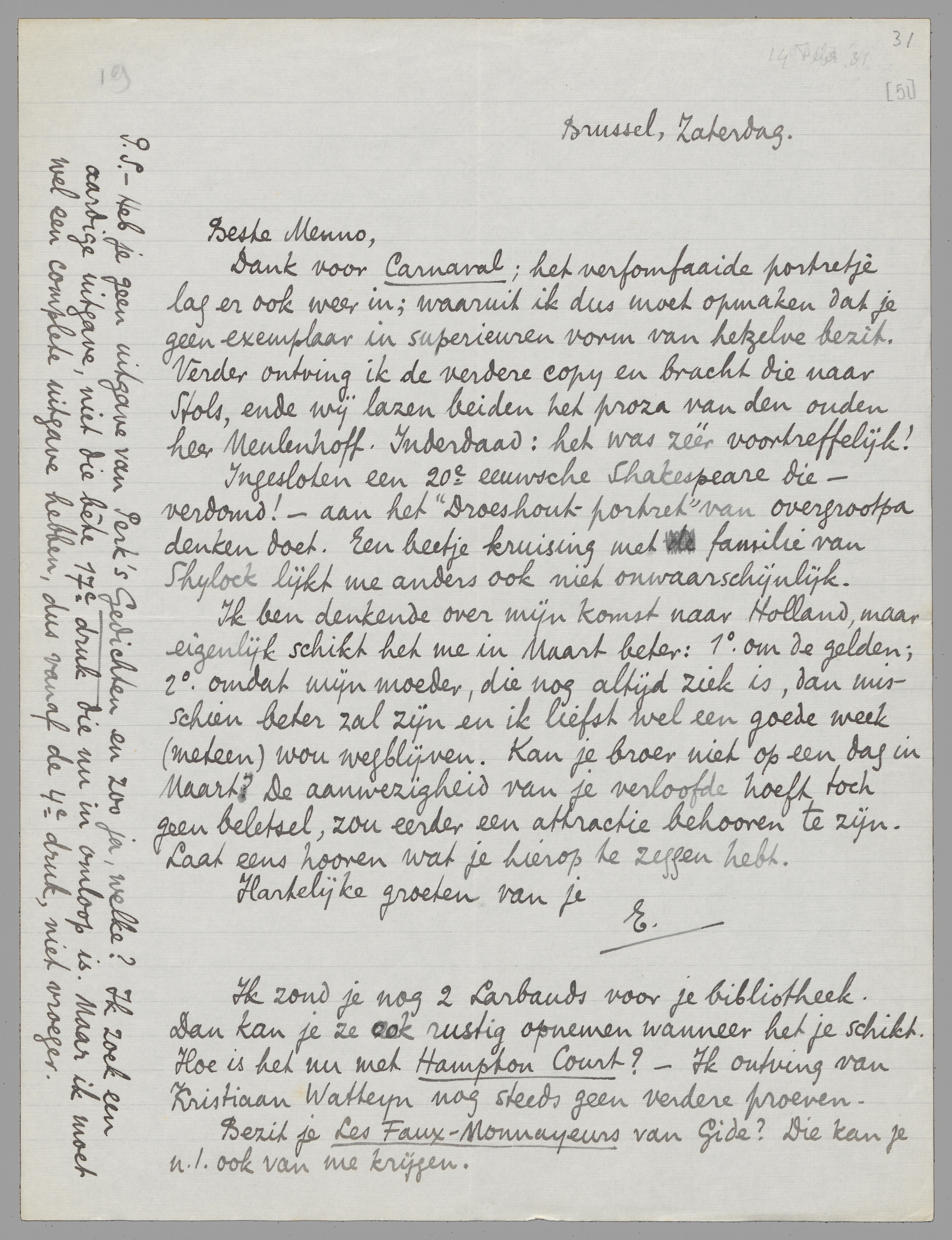 Ik zond je nog 2 Larbauds voor je bibliotheek. Dan kan je ze ook rustig opnemen wanneer het je schikt. Hoe is het nu met Hampton Court? - Ik ontving van Kristiaan Watteyn nog steeds geen verdere proeven.