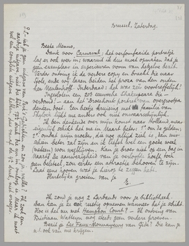 Ik ben denkende over mijn komst naar Holland, maar eigenlijk schikt het me in Maart beter: 1o. om de gelden; 2o. omdat mijn moeder, die nog altijd ziek is, dan misschien beter zal zijn en ik liefst wel een goede week (meteen) wou wegblijven. Kan je broer niet op een dag in Maart? De aanwezigheid van je verloofde hoeft toch geen beletsel, zou eerder een attractie behooren te zijn. Laat eens hooren wat je hierop te zeggen hebt. Hartelijke groeten van je