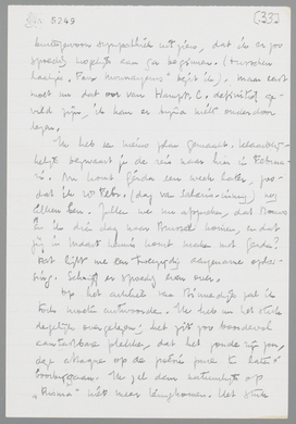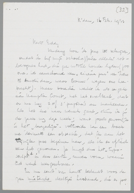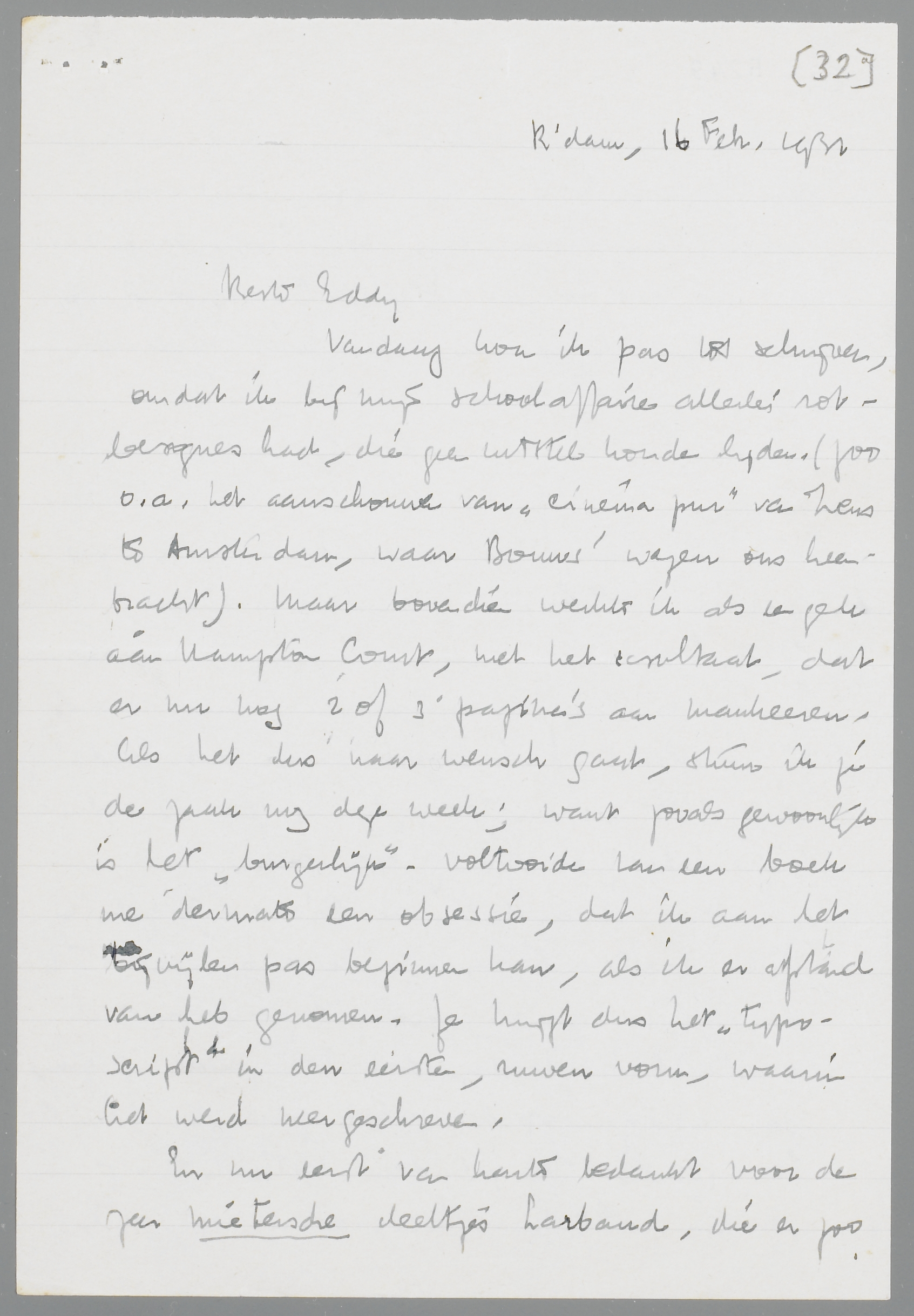 Vandaag kom ik pas tot schrijven, omdat ik bij mijn schoolaffaire allerlei rotbesognes had, die geen uitstel konden lijden, (zoo o.a. het aanschouwen van ‘cinéma pur’ van Ivens te Amsterdam, waar Bouws' wagen ons heenbracht). Maar bovendien werkte ik als een gek aan Hampton Court, met het resultaat, dat er nu nog 2 of 3 pagina's aan mankeeren. Als het dus naar wensch gaat, stuur ik je de zaak nog deze week; want zooals gewoonlijk is het ‘burgerlijk’-voltooide van een boek me dermate een obsessie, dat ik aan het bijvijlen pas beginnen kan, als ik er afstand van heb genomen. Je krijgt dus het ‘typoscript’ in den eersten, ruwen vorm, waarin het werd neergeschreven.