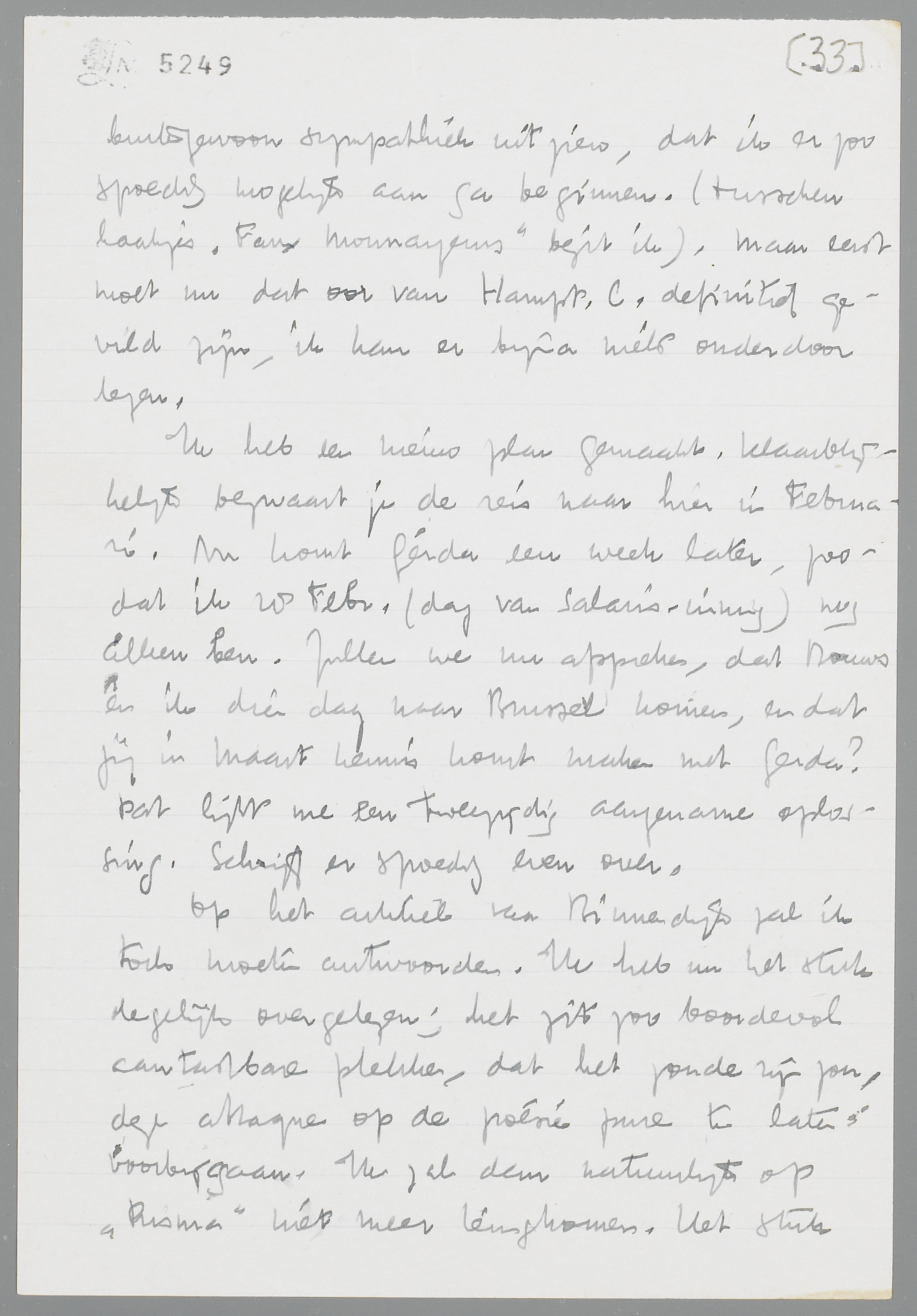 Ik heb een nieuw plan gemaakt. Klaarblijkelijk bezwaart je de reis naar hier in Februari. Nu komt Gerda een week later, zoodat ik 28 Febr. (dag van salaris-inning) nog alleen ben. Zullen we nu afspreken, dat Bouws en ik dien dag naar Brussel komen, en dat jij in Maart kennis komt maken met Gerda? Dat lijkt me een tweezijdig aangename oplossing. Schrijf er spoedig even over.