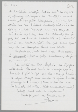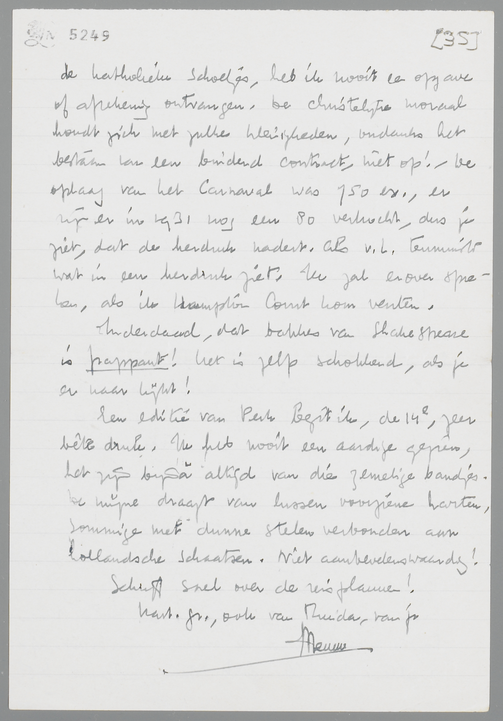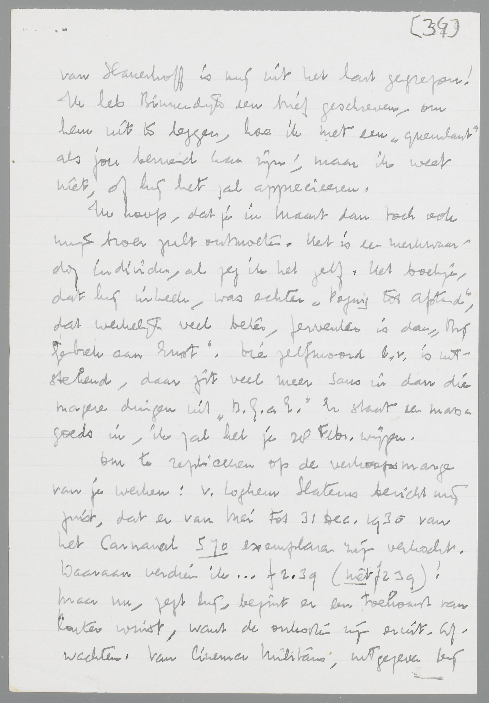 Om te repliceeren op de verkoopsmarge van je werken: v. Loghem Slaterus bericht mij juist, dat er van Mei tot 31 Dec. 1930 van het Carnaval 570 exemplaren zijn verkocht. Daaraan verdien ik... ƒ 2.39 (niet ƒ 239)! Maar nu, zegt hij, begint er een toekomst van louter winst, want de onkosten zijn eruit. Afwachten. Van Cinema Militans, uitgegeven bij de katholieke schoeljes, heb ik nooit een opgave of afrekening ontvangen. De christelijke moraal houdt zich met zulke kleinigheden, ondanks het bestaan van een bindend contract, niet op! - De oplaag van het Carnaval was 750 ex., er zijn er in 1931 nog een 80 verkocht, dus je ziet, dat de herdruk nadert. Als v.L. tenminste wat in een herdruk ziet. Ik zal erover spreken, als ik Hampton Court kom venten.