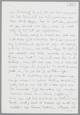 Ik hoop, dat je in Maart dan toch ook mijn broer zult ontmoeten. Het is een merkwaardig individu, al zeg ik het zelf. Het boekje, dat hij inkeek, was echter Poging tot Afstand, dat werkelijk veel beter, ferventer is dan Bij Gebrek aan Ernst. Die zelfmoord b.v. is uitstekend, daar zit veel meer saus in dan die magere dingen uit B.G.a.E. Er staat een massa goeds in, ik zal het je 28 Febr. wijzen.
