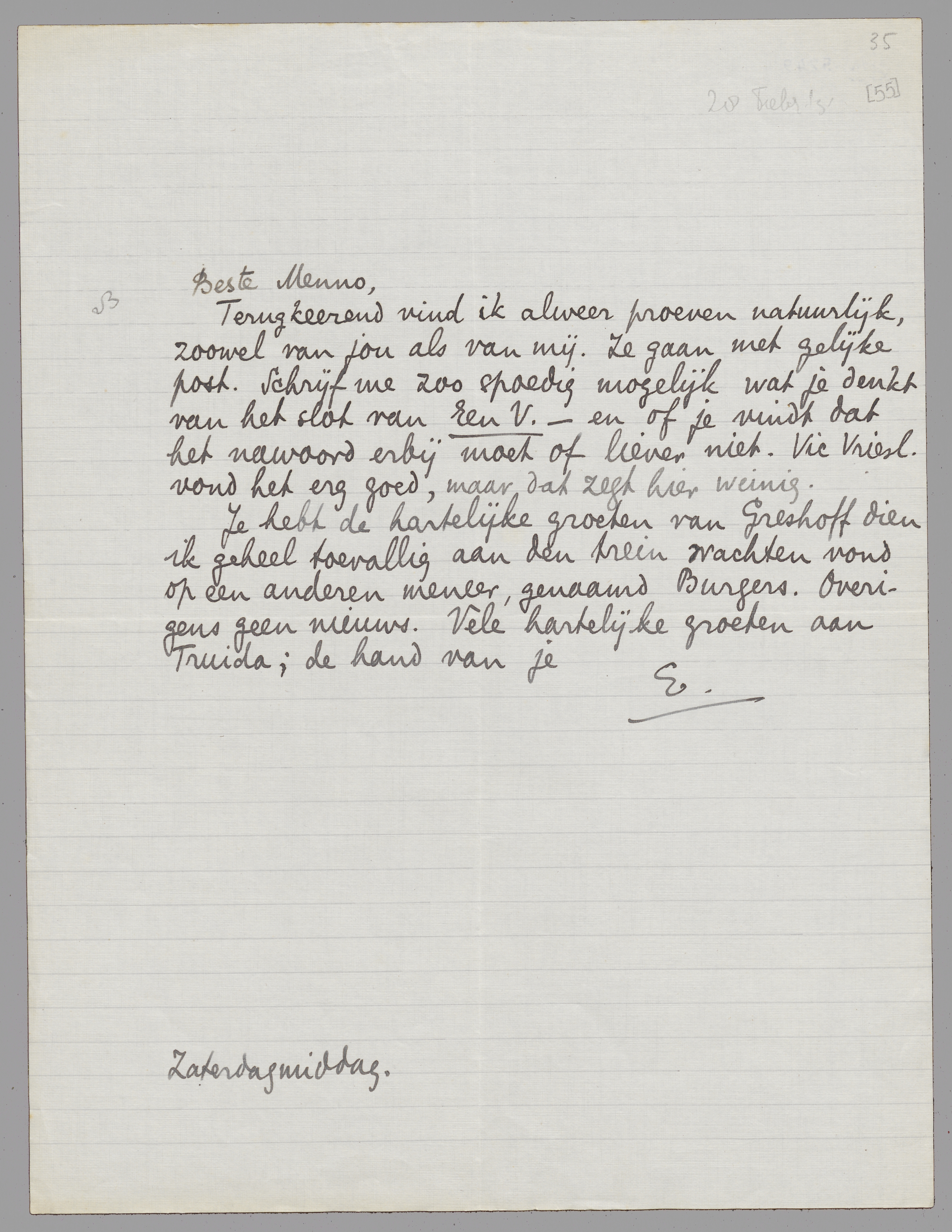 Terugkeerend vind ik alweer proeven natuurlijk, zoowel van jou als van mij. Ze gaan met gelijke post. Schrijf me zoo spoedig mogelijk wat je denkt van het slot van Een V. - en of je vindt dat het nawoord erbij moet of liever niet. Vic Vriesl. vond het erg goed, maar dat zegt hier weinig.