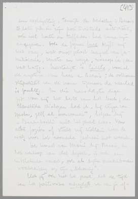Eén grove fout in het boek vind ik het proces Dreyfus, dat de spanning, door het ‘proces-Barois’ gewekt, tijdelijk totaal verbreekt. Het interesseert mij, in dit verband, allerminst, het relaas te hooren (stenografisch juist nog wel!) van een rechtzitting, terwijl de bedoeling: Barois te laten zien in zijn positivistische activiteit, ook wel korter en treffender had kunnen zijn aangegeven. Ook de figuur Luce blijft mij wat vaag, wat onopgelost mengsel van familievader, senator en wijze, waarop ik geen vat krijg. Meesterlijk is Cecile, vooral de rupture van haar en Barois; de volkomen stupiditeit van de vrouw tegenover de waarheid is prachtig. In die menschelijke dingen zit voor mij het beste van het boek; de theoretische dialogen had ik, bij wijze van spreken, zelf al ‘overwonnen’, hetgeen bij Barnabooth niet het geval was. Van abbé Joziers af steekt mij niettemin weer de walg voor het roomsche gedraai met woorden.