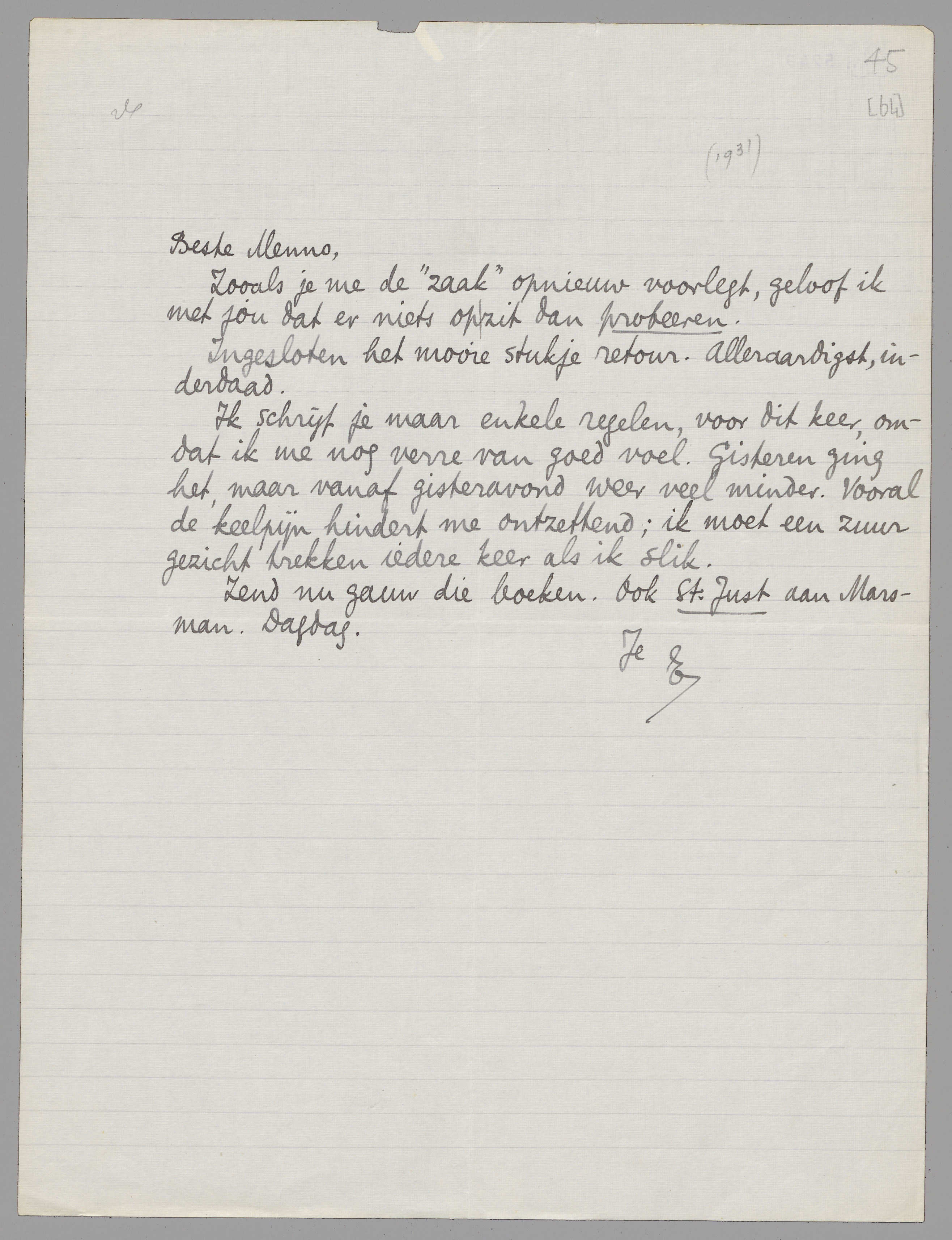 Ik schrijf je maar enkele regelen, voor dit keer, omdat ik me nog verre van goed voel. Gisteren ging het, maar vanaf gisteravond weer veel minder. Vooral de keelpijn hindert me ontzettend; ik moet een zuur gezicht trekken iedere keer als ik slik.