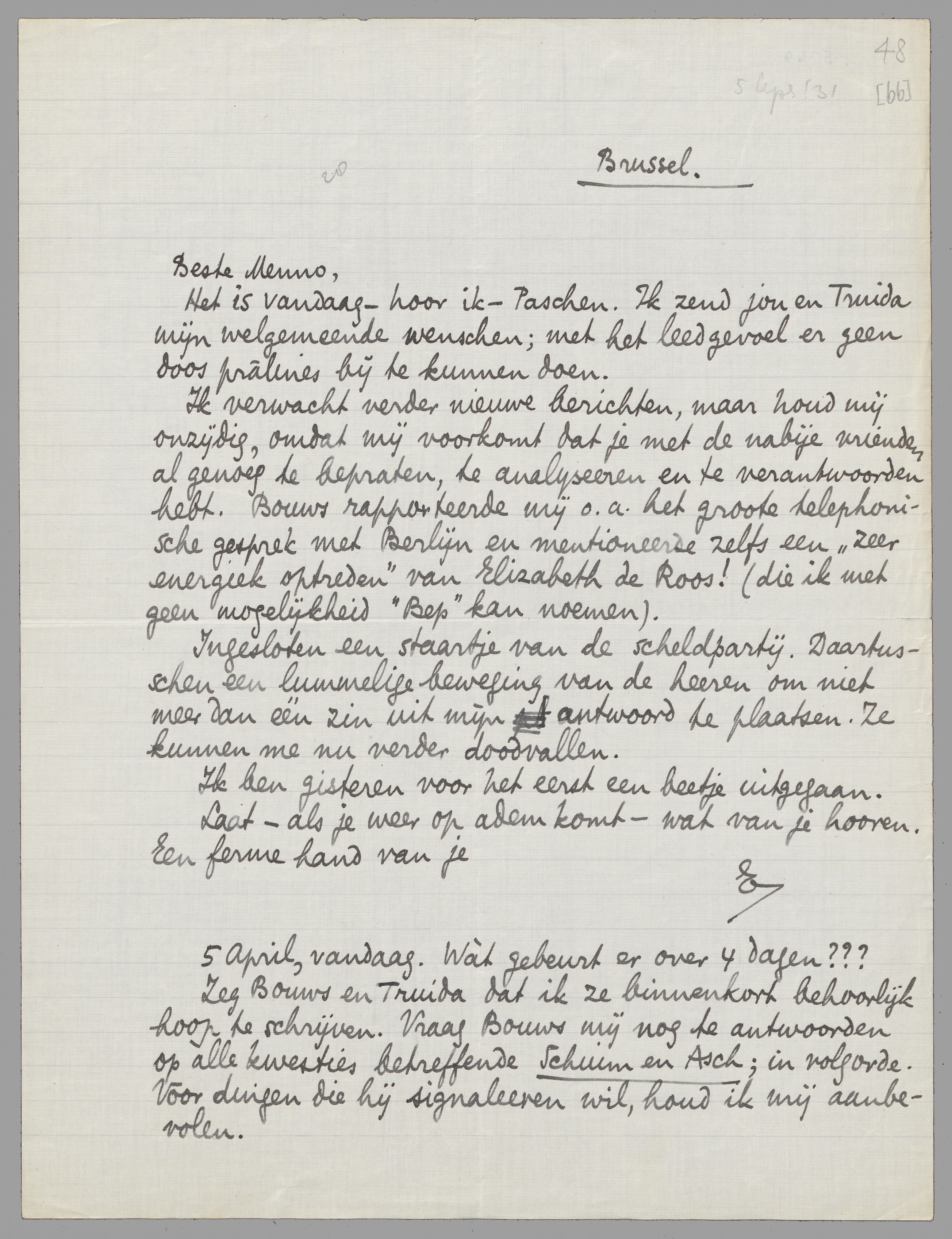 Ik verwacht verder nieuwe berichten, maar houd mij onzijdig, omdat mij voorkomt dat je met de nabije vrienden al genoeg te bepraten, te analyseeren en te verantwoorden hebt. Bouws rapporteerde mij o.a. het groote telephonische gesprek met Berlijn en mentioneerde zelfs een ‘zeer energiek optreden’ van Elizabeth de Roos! (die ik met geen mogelijkheid ‘Bep’ kan noemen).