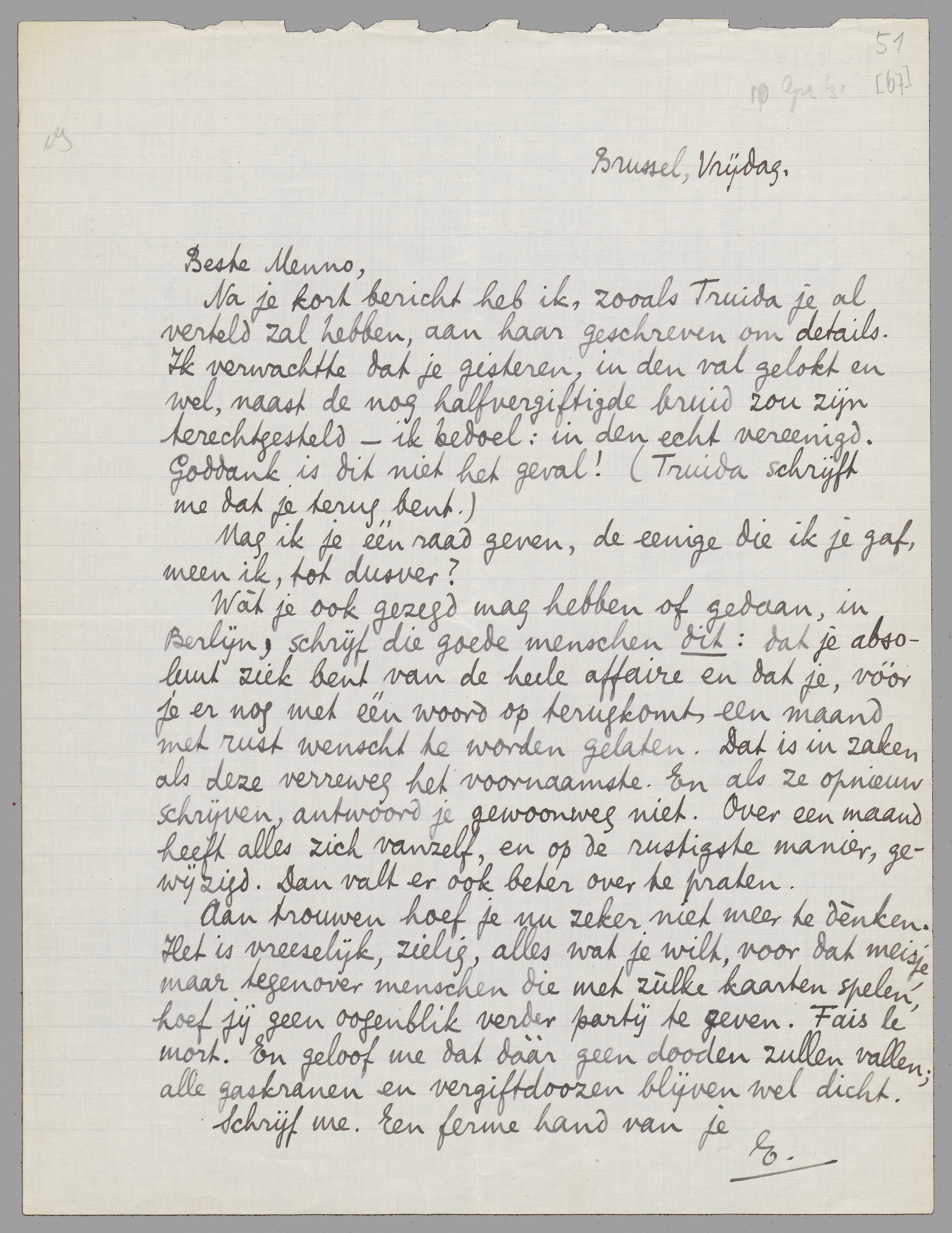 Aan trouwen hoef je nu zeker niet meer te dènken. Het is vreeselijk, zielig, alles wat je wilt, voor dat meisje, maar tegenover menschen die met zùlke kaarten spelen hoef jij geen oogenblik verder partij te geven. Fais le mort. En geloof me dat dààr geen dooden zullen vallen; alle gaskranen en vergiftdoozen blijven wel dicht.