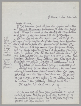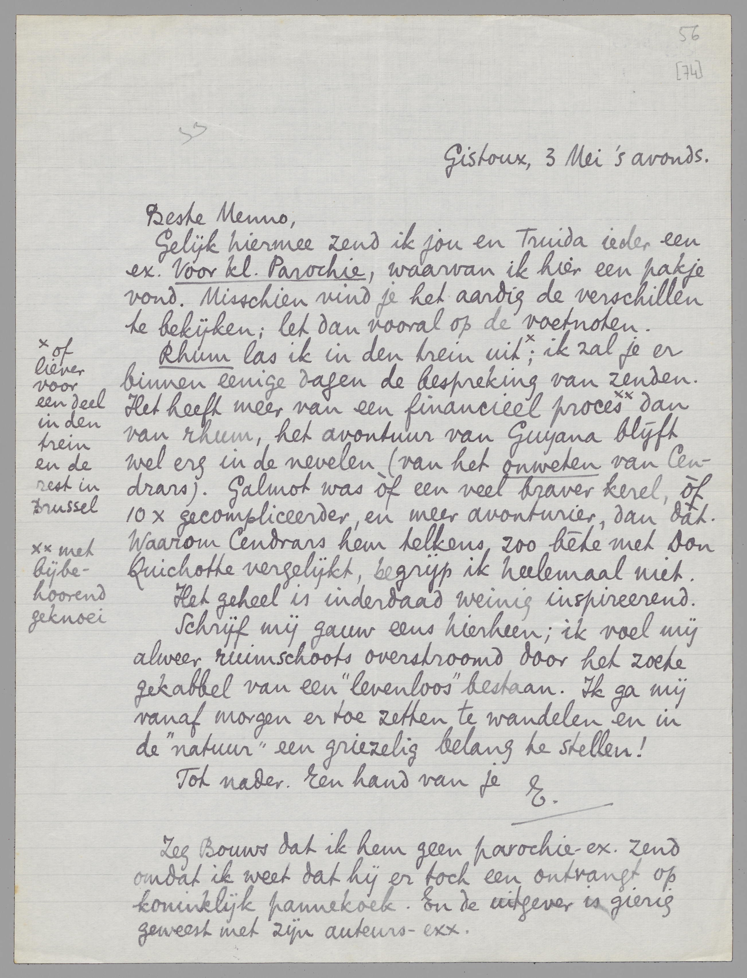 Rhum las ik in den trein uit [of liever voor een deel in den trein en de rest in Brussel]; ik zal je er binnen eenige dagen de bespreking van zenden. Het heeft meer van een financieel proces met bijbehoorend geknoei dan van rhum, het avontuur van Guyana blijft wel erg in de nevelen (van het onweten van Cendrars). Galmot was òf een veel braver kerel, òf 10 × gecompliceerder, en meer avonturier, dan dàt. Waarom Cendrars hem telkens zoo bète met Don Quichotte vergelijkt, begrijp ik heelemaal niet.