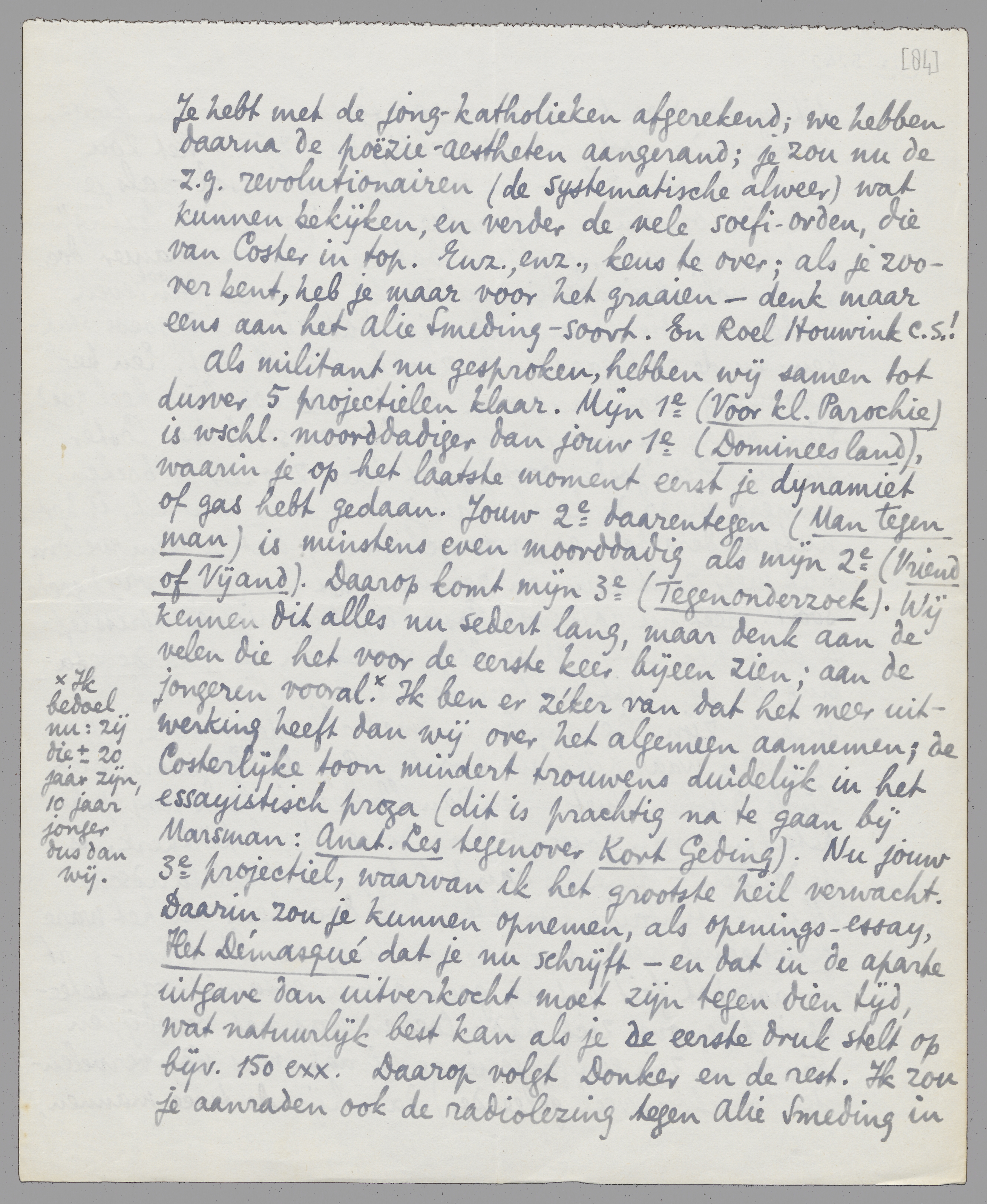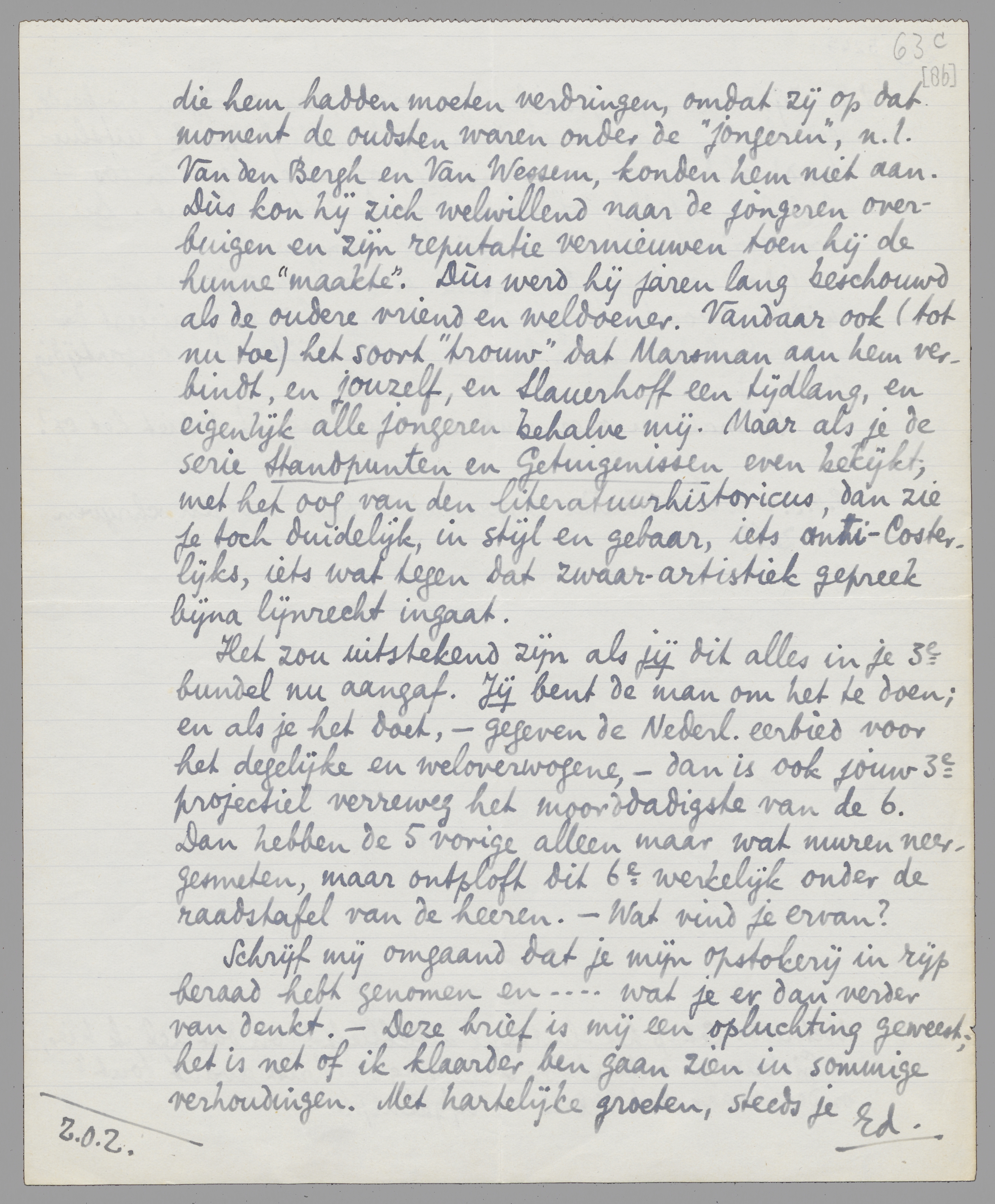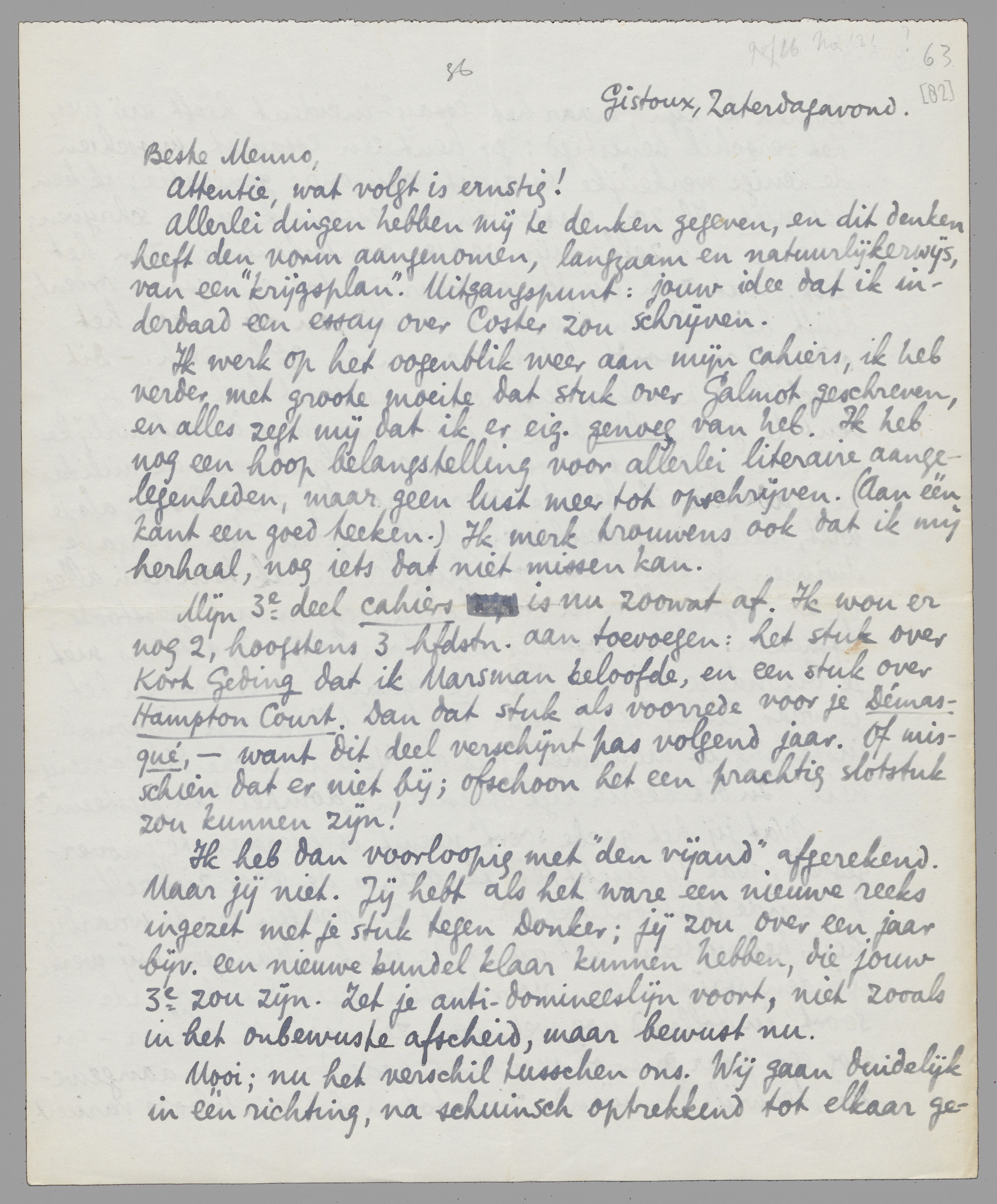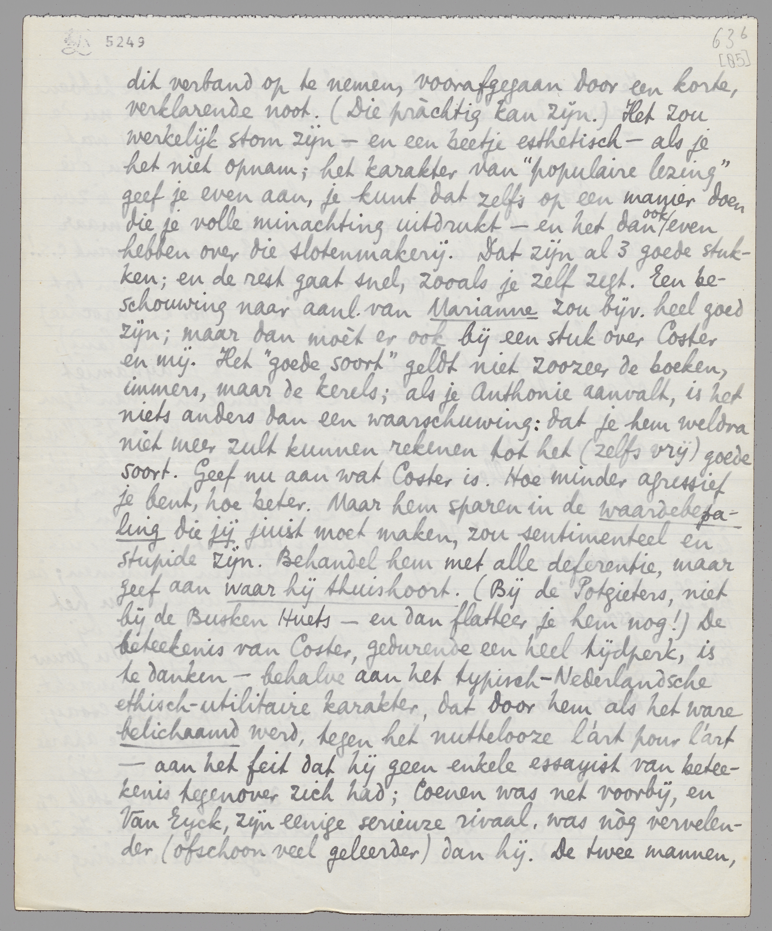 Als militant nu gesproken, hebben wij samen tot dusver 5 projectielen klaar. Mijn 1e (Voor kl. Parochie) is wschl. moorddadiger dan jouw 1e (Domineesland), waarin je op het laatste moment eerst je dynamiet of gas hebt gedaan. Jouw 2e daarentegen (Man tegen man) is minstens even moorddadig als mijn 2e (Vriend of Vijand). Daarop komt mijn 3e (Tegenonderzoek). Wij kennen dit alles nu sedert lang, maar denk aan de velen die het voor de eerste keer bijeen zien; aan de jongeren vooral. Ik bedoel nu: zij die ± 20 jaar zijn, 10 jaar jonger dus dan wij. Ik ben er zéker van dat het meer uitwerking heeft dan wij over het algemeen aannemen; de Costerlijke toon mindert trouwens duidelijk in het essayistisch proza (dit is prachtig na te gaan bij Marsman; Anat. Les tegenover Kort Geding). Nu jouw 3e projectiel, waarvan ik het grootste heil verwacht. Daarin zou je kunnen opnemen, als openings-essay, Het Démasqué dat je nu schrijft - en dat in de aparte uitgave dan uitverkocht moet zijn tegen dien tijd, wat natuurlijk best kan als je de eerste druk stelt op bijv. 150 exx. Daarop volgt Donker en de rest. Ik zou je aanraden ook de radiolezing tegen Alie Smeding in dit verband op te nemen, voorafgegaan door een korte, verklarende noot. (Die pràchtig kan zijn.) Het zou werkelijk stom zijn - en een beetje esthetisch - als je het niet opnam; het karakter van ‘populaire lezing’ geef je even aan, je kunt dat zelfs op een manier doen die je volle minachting uitdrukt - en het dan ook even hebben over die slotenmakerij. Dat zijn al 3 goede stukken; en de rest gaat snel, zooals je zelf zegt. Een beschouwing naar aanl. van Marianne zou bijv. heel goed zijn; maar dan moèt er ook bij een stuk over Coster en mij. Het ‘goede soort’ geldt niet zoozeer de boeken, immers, maar de kerels; als je Anthonie aanvalt, is het niets anders dan een waarschuwing: dat je hem weldra niet meer zult kunnen rekenen tot het (zelfs vrij) goede soort. Geef nu aan wat Coster is. Hoe minder agressief je bent, hoe beter. Maar hem sparen in de waardebepaling die jij juist moet maken, zou sentimenteel en stupide zijn. Behandel hem met alle deferentie, maar geef aan waar hij thuishoort. (Bij de Potgieters, niet bij de Busken Huets - en dan flatteer je hem nog!) De beteekenis van Coster, gedurende een heel tijdperk, is te danken - behalve aan het typisch-Nederlandsche ethisch-utilitaire karakter, dat door hem als het ware belichaamd werd, tegen het nuttelooze l'art pour l'art - aan het feit dat hij geen enkele essayist van beteekenis tegenover zich had; Coenen was net voorbij, en Van Eyck, zijn eenige serieuze rivaal, was nòg vervelender (ofschoon veel geleerder) dan hij. De twee mannen, die hem hadden moeten verdringen, omdat zij op dat moment de oudsten waren onder de ‘jongeren’, n.l. Van den Bergh en Van Wessem, konden hem niet aan. Dùs kon hij zich welwillend naar de jongeren overbuigen en zijn reputatie vernieuwen toen hij de hunne ‘maakte’. Dùs werd hij jaren lang beschouwd als de oudere vriend en weldoener. Vandaar ook (tot nu toe) het soort ‘trouw’ dat Marsman aan hem verbindt, en jouzelf, en Slauerhoff een tijdlang, en eigenlijk alle jongeren behalve mij. Maar als je de serie Standpunten en Getuigenissen even bekijkt, met het oog van den literatuurhistoricus, dan zie je toch duidelijk, in stijl en gebaar, iets anti-Costerlijks, iets wat tegen dat zwaar-artistiek gepreek bijna lijnrecht ingaat.