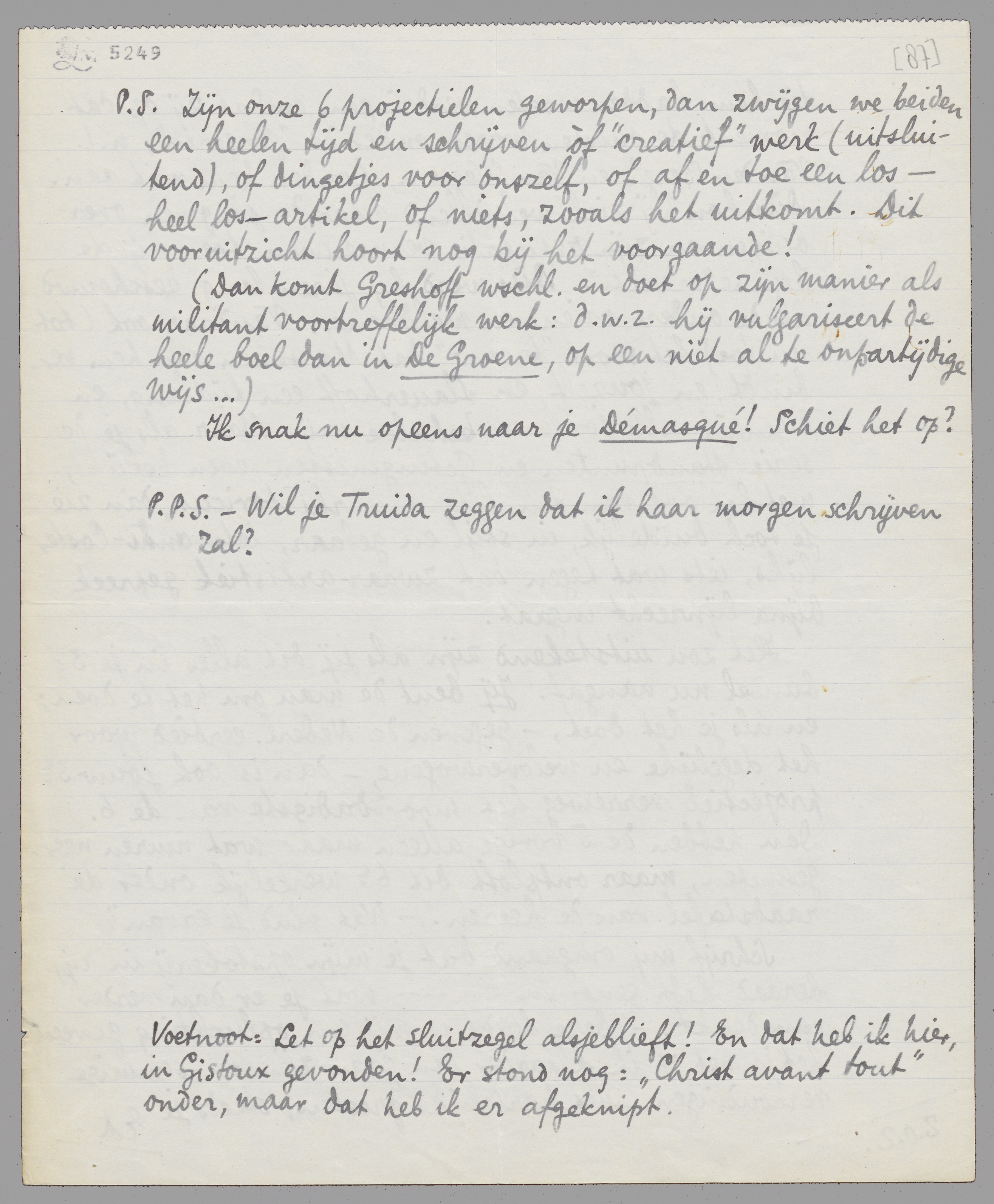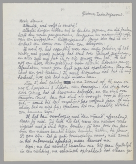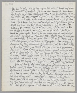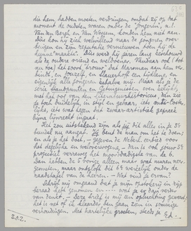 Mijn 3e deel cahiers is nu zoowat af. Ik wou er nog 2, hoogstens 3 hfdst. aan toevoegen: het stuk over Kort Geding dat ik Marsman beloofde, en een stuk over Hampton Court. Dan dat stuk als voorrede voor je Démasqué, - want dit deel verschijnt pas volgend jaar. Of misschien dat er niet bij; ofschoon het een prachtig slotstuk zou kunnen zijn!