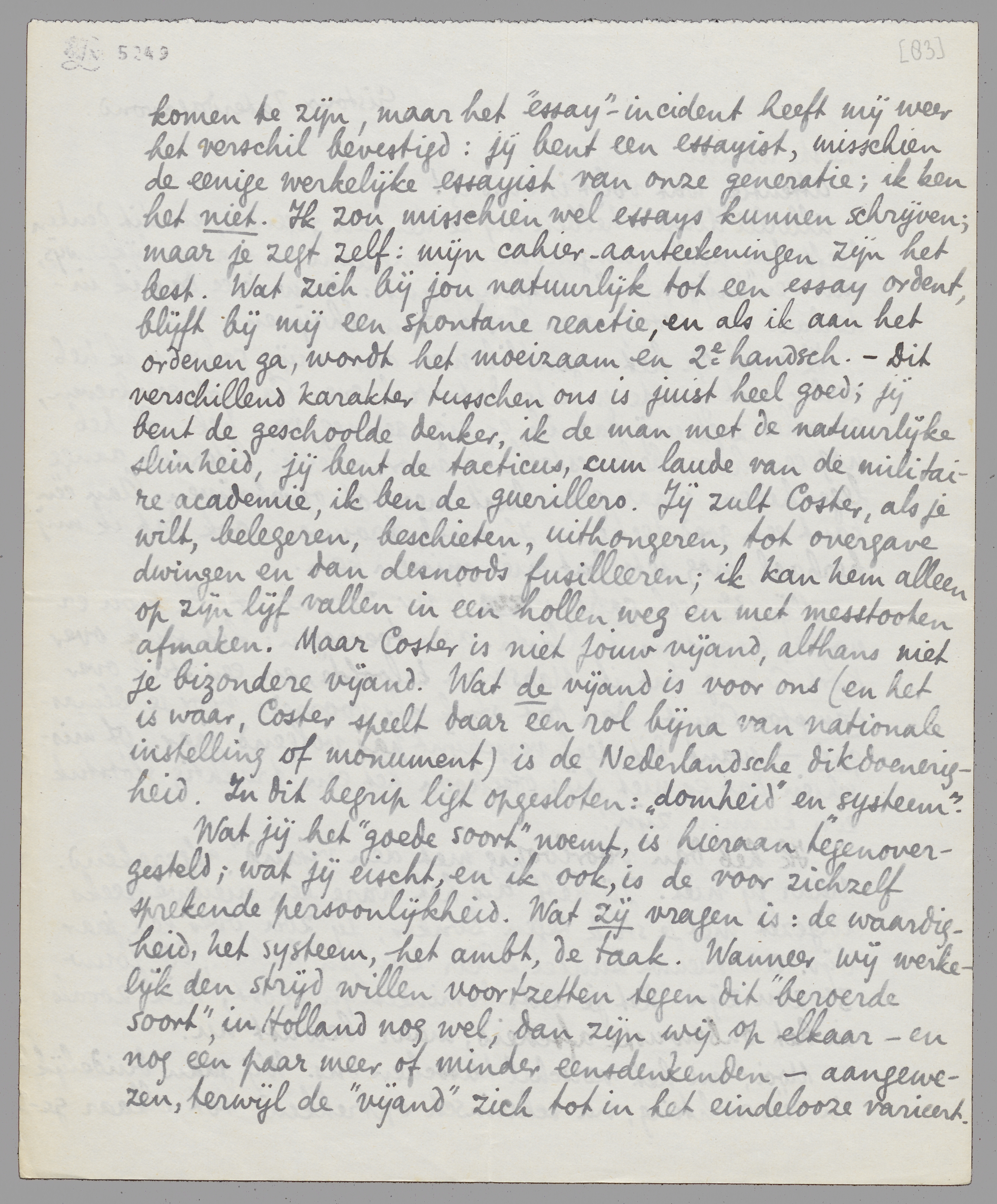 Mooi; nu het verschil tusschen ons. Wij gaan duidelijk in één richting, na schuinsch optrekkend tot elkaar gekomen te zijn, maar het ‘essay’-incident heeft mij weer het verschil bevestigd: jij bent een essayist, misschien de eenige werkelijke essayist van onze generatie; ik ben het niet. Ik zou misschien wel essays kunnen schrijven; maar je zegt zelf: mijn cahier-aanteekeningen zijn het best. Wat zich bij jou natuurlijk tot een essay ordent, blijft bij mij een spontane reactie, en als ik aan het ordenen ga, wordt het moeizaam en 2e handsch. - Dit verschillend karakter tusschen ons is juist heel goed; jij bent de geschoolde denker, ik de man met de natuurlijke slimheid, jij bent de tacticus, cum laude van de militaire academie, ik ben de guerillero. Jij zult Coster, als je wilt, belegeren, beschieten, uithongeren, tot overgave dwingen en dan desnoods fusilleeren; ik kan hem alleen op zijn lijf vallen in een hollen weg en met messtooten afmaken. Maar Coster is niet jouw vijand, althans niet je bizondere vijand. Wat de vijand is voor ons (en het is waar, Coster speelt daar een rol bijna van nationale instelling of monument) is de Nederlandsche dikdoenerigheid. In dit begrip ligt opgesloten: ‘domheid’ en ‘systeem’.
