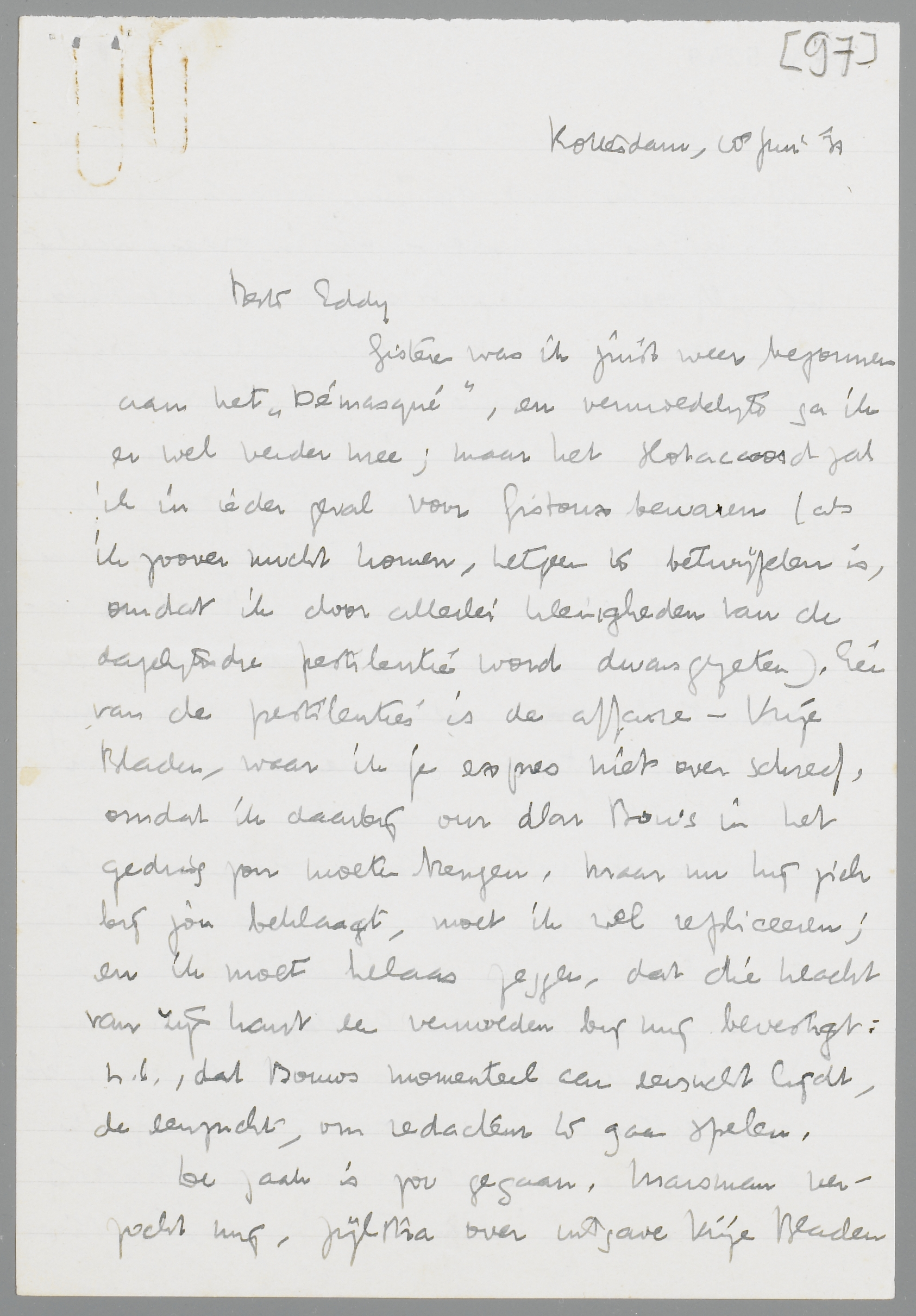 Gisteren was ik juist weer begonnen aan het Démasqué, en vermoedelijk ga ik er wel verder mee; maar het slotaccoord zal ik in ieder geval voor Gistoux bewaren (als ik zoover mocht komen, hetgeen te betwijfelen is, omdat ik door allerlei kleinigheden van de dagelijkse pestilentie word dwarsgezeten). Eén van de pestilenties is de affaire-Vrije Bladen, waar ik je expres niet over schreef, omdat ik daarbij our dear Bows in het geding zou moeten brengen. Maar nu hij zich bij jou beklaagt, moet ik wel repliceeren; en ik moet helaas zeggen, dat die klacht van zijn kant een vermoeden bij mij bevestigt: n.l., dat Bouws momenteel aan eerzucht lijdt, de eerzucht, om redacteur te gaan spelen.
