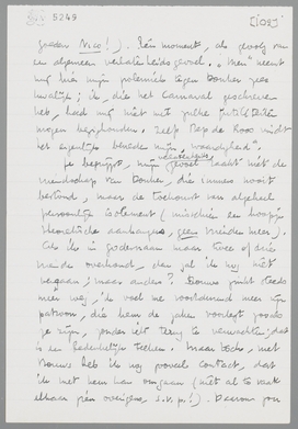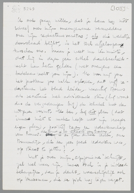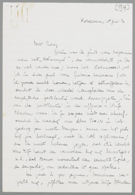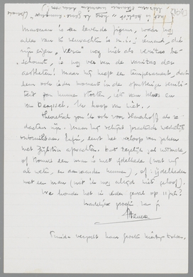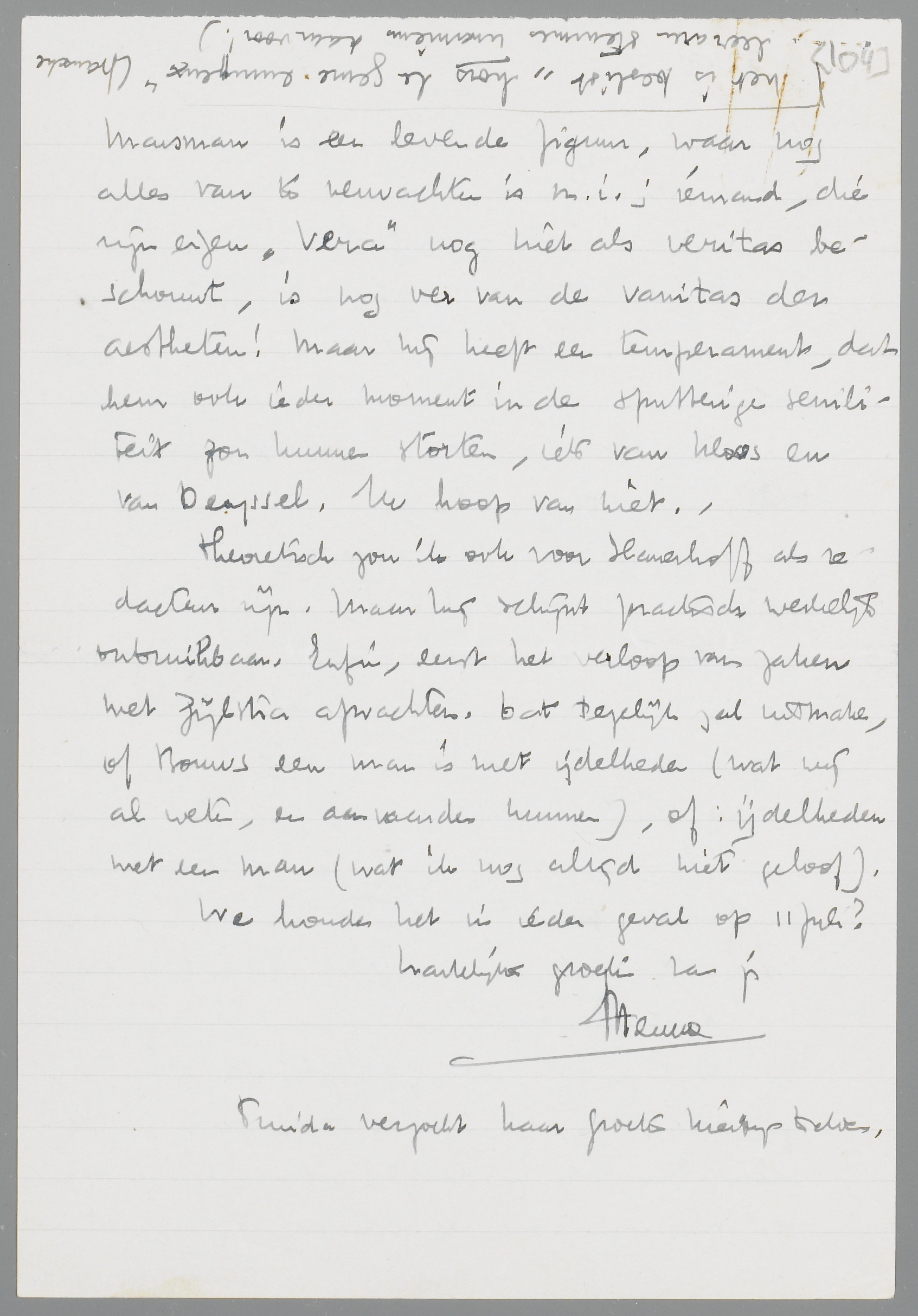 Wat je over mijn ‘epigonisme’ schrijft, zal wel waar zijn, maar toch is je invloed belangrijker, dan je denkt, waarschijnlijk ook op Marsman, die er zich nog tegen verzet. Marsman is een levende figuur, waar nog alles van te verwachten is m.i.; iemand, die zijn eigen Vera nog niet als veritas beschouwt, is nog ver van de vanitas der aestheten! Maar hij heeft een temperament, dat hem ook ieder moment in de sputterige seniliteit zou kunnen storten, iets van Kloos en van Deyssel. Ik hoop van niet.