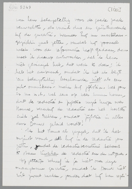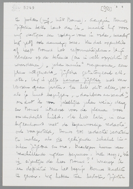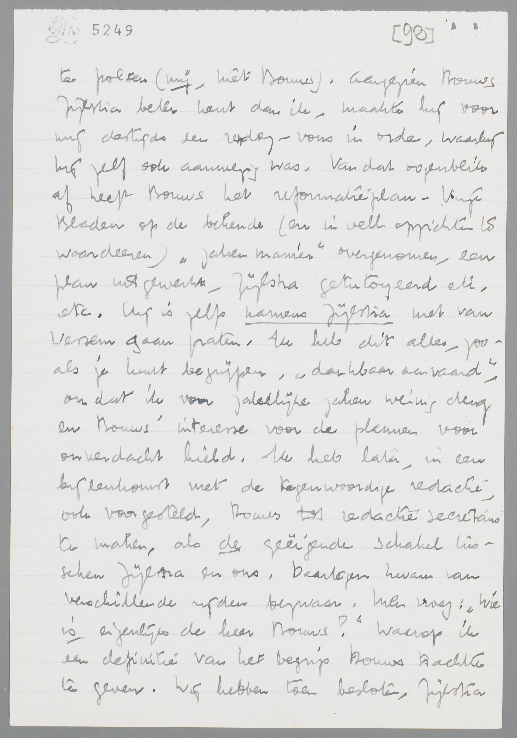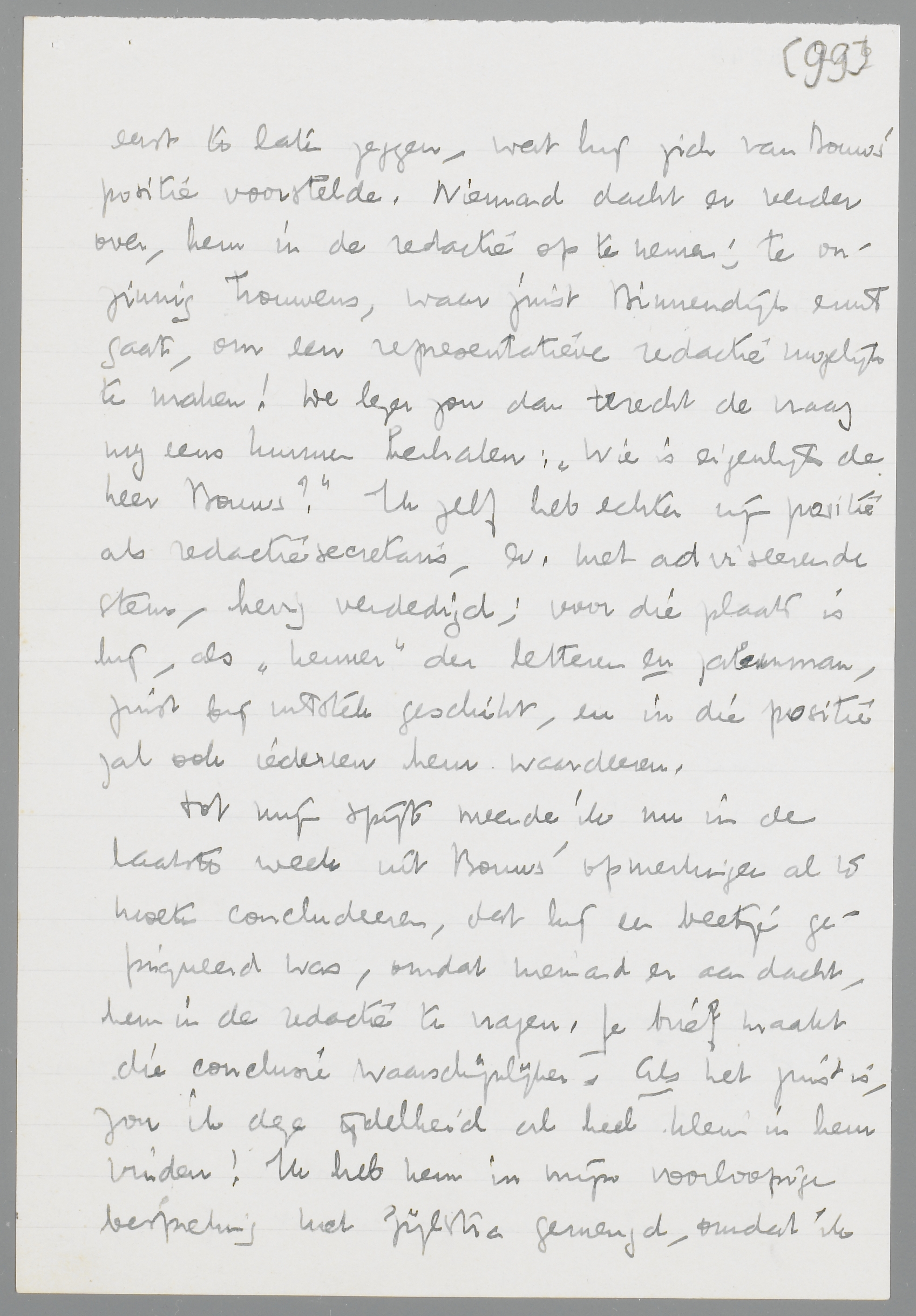 De zaak is zoo gegaan. Marsman verzocht mij, Zijlstra over uitgave Vrije Bladen te polsen (mij, niet Bouws). Aangezien Bouws Zijlstra beter kent dan ik, maakte hij voor mij destijds een rendez-vous in orde, waarbij hij zelf ook aanwezig was. Van dat oogenblik af heeft Bouws het reformatieplan-Vrije Bladen op de bekende (en in vele opzichten te waardeeren) ‘zaken manier’ overgenomen, een plan uitgewerkt, Zijlstra getutoyeerd etc. etc. Hij is zelfs namens Zijlstra met van Wessem gaan praten. Ik heb dit alles, zooals je kunt begrijpen, ‘dankbaar aanvaard’, omdat ik voor zakelijke zaken weinig deug en Bouws' interesse voor de plannen voor onverdacht hield. Ik heb later, in een bijeenkomst met de tegenwoordige redactie, ook voorgesteld, Bouws tot redactie secretaris te maken, als de geëigende schakel tusschen Zijlstra en ons. Daartegen kwam van verschillende zijden bezwaar. Men vroeg: ‘Wie is eigenlijk de heer Bouws?’ Waarop ik een definitie van het begrip Bouws trachtte te geven. Wij hebben toen besloten, Zijlstra eerst te laten zeggen, wat hij zich van Bouws' positie voorstelde. Niemand dacht er verder over, hem in de redactie op te nemen; te onzinnig trouwens, waar juist Binnendijk eruit gaat, om een representatieve redactie mogelijk te maken! De lezer zou dan terecht de vraag nog eens kunnen herhalen: ‘Wie is eigenlijk de heer Bouws?’ Ik zelf heb echter zijn positie als redactie-secretaris, ev. met adviseerende stem, hevig verdedigd; voor die plaats is hij, als ‘kenner’ der letteren en zakenman, juist bij uitstek geschikt, en in die positie zal ook iedereen hem waardeeren.