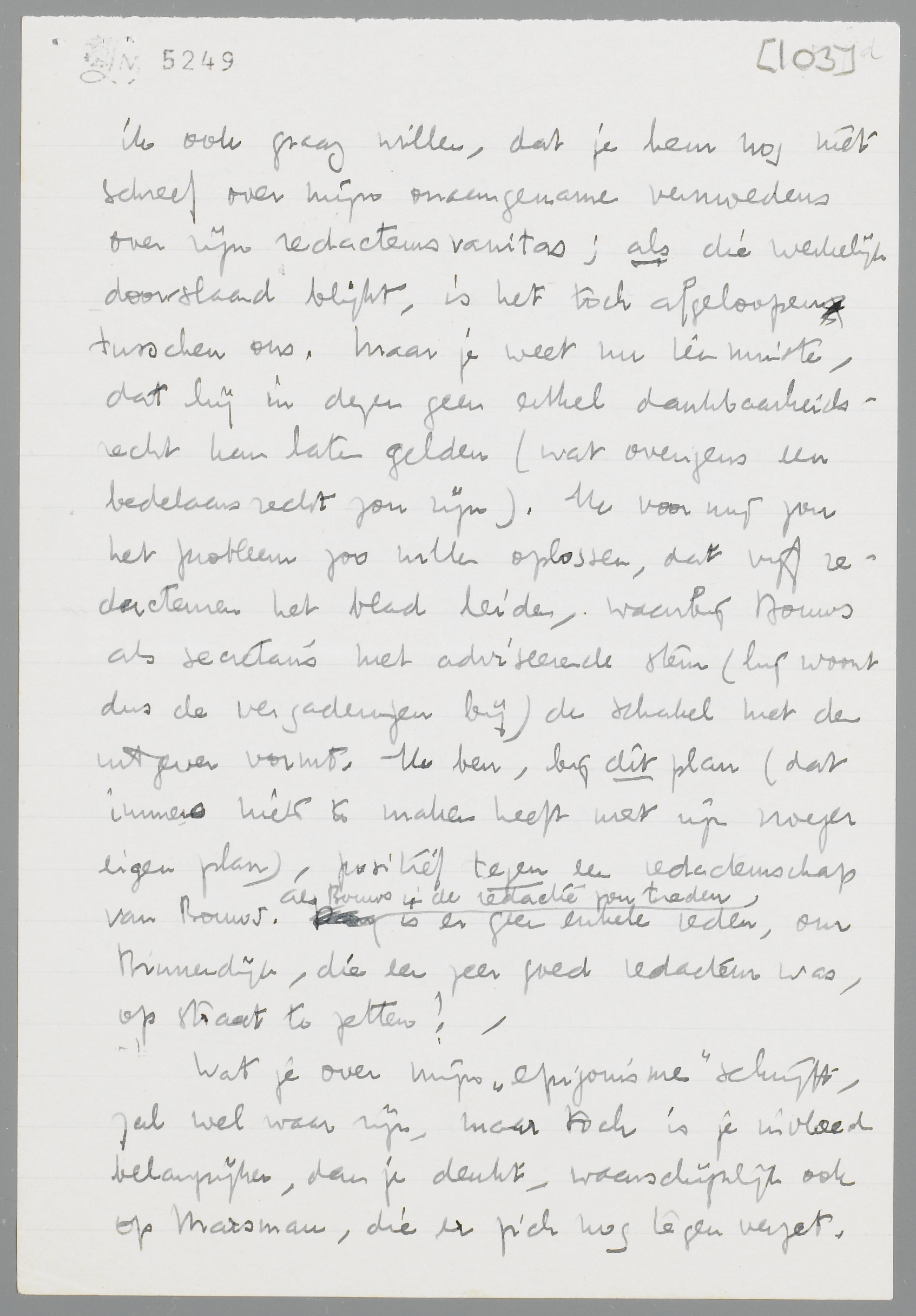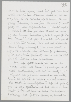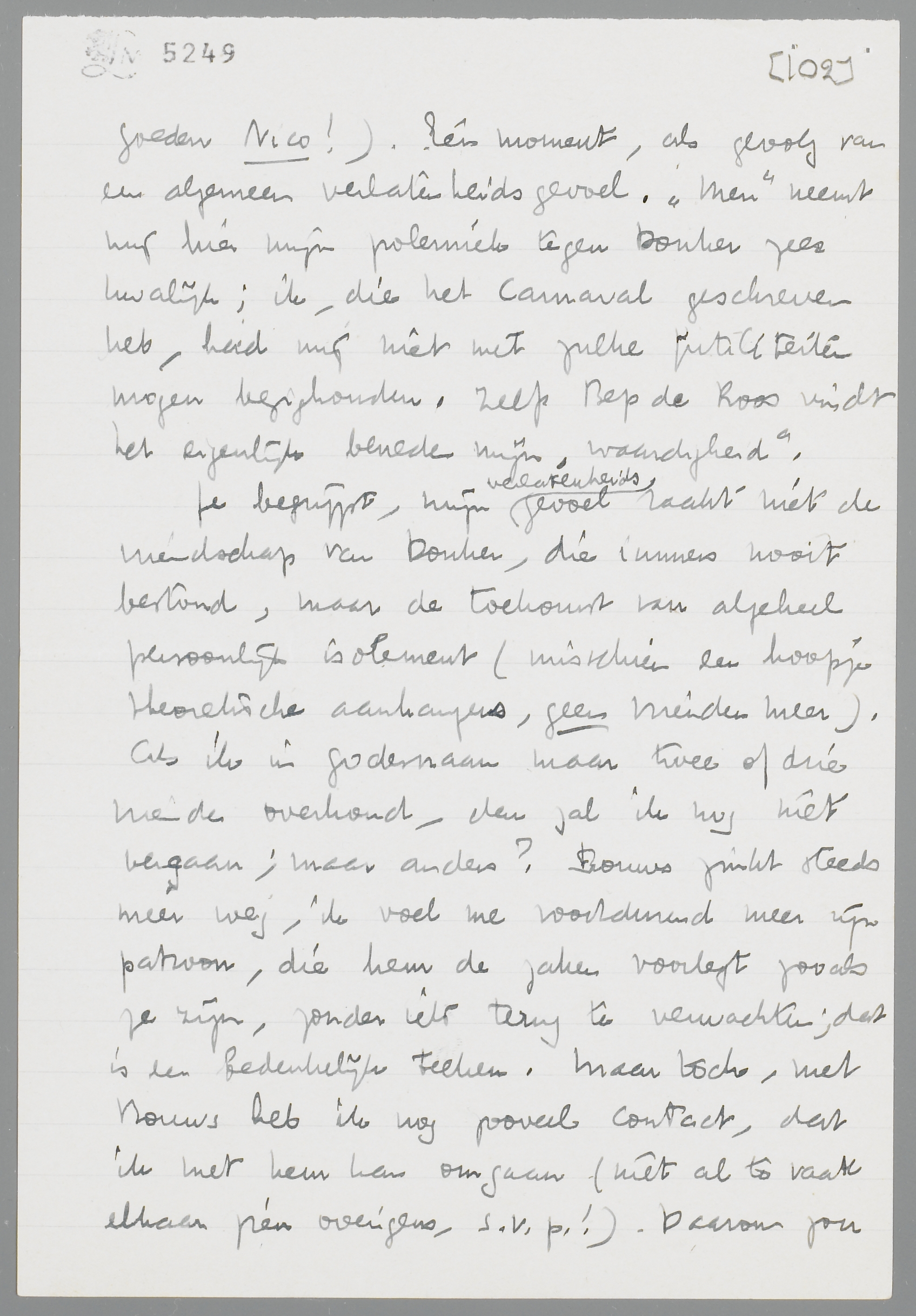 Je begrijpt, mijn verlatenheidsgevoel raakt niet de vriendschap van Donker, die immers nooit bestond, maar de toekomst van algeheel persoonlijk isolement (misschien een hoopje theoretische aanhangers, geen vrienden meer). Als ik in godesnaam maar twee of drie vrienden overhoud, dan zal ik nog niet vergaan; maar anders? Bouws zinkt steeds meer weg, ik voel me voortdurend meer zijn patroon, die hem de zaken voorlegt zooals ze zijn, zonder iets terug te verwachten; dat is een bedenkelijk teeken. Maar toch, met Bouws heb ik nog zooveel contact, dat ik met hem kan omgaan (niet al te vaak elkaar zien overigens, s.v.p.!) Daarom zou ik ook graag willen, dat je hem nog niet schreef over mijn onaangename vermoedens over zijn redacteursvanitas; als die werkelijk doorslaand blijkt, is het toch afgeloopen tusschen ons. Maar je weet nu tenminste, dat hij in dezen geen enkel dankbaarheidsrecht kan laten gelden (wat overigens een bedelaarsrecht zou zijn). Ik voor mij zou het probleem zoo willen oplossen, dat vijf redacteuren het blad leiden, waarbij Bouws als secretaris met adviseerende stem (hij woont dus de vergaderingen bij) de schakel met den uitgever vormt. Ik ben, bij dit plan (dat immers niets te maken heeft met zijn vroeger eigen plan), positief tegen een redacteurschap van Bouws. Als Bouws in de redactie zou treden is er geen enkele reden, om Binnendijk, die een zeer goed redacteur was, op straat te zetten!