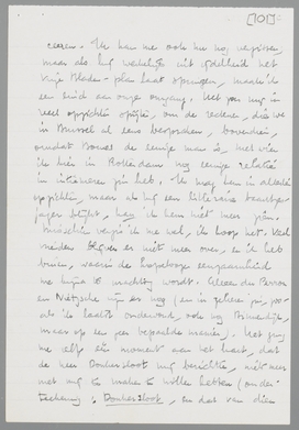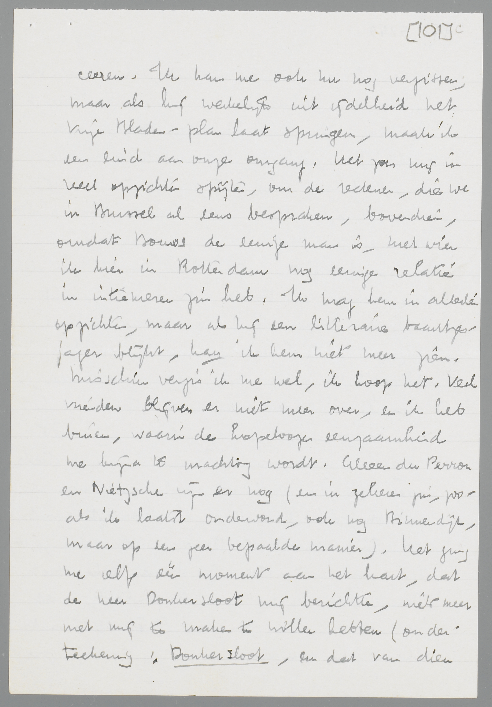 Opzettelijk schreef ik je niet over deze onaangename quaestie, omdat ik Bouws niet wil zwart maken, zonder dat hij kan repliceeren. Ik kan me ook nu nog vergissen, maar als hij werkelijk uit ijdelheid het Vrije Bladen-plan laat springen, maak ik een eind aan onze omgang. Het zou mij in veel opzichten spijten, om de redenen, die we in Brussel al eens bespraken, bovendien, omdat Bouws de eenige man is, met wien ik hier in Rotterdam nog eenige relatie in intiemeren zin heb. Ik mag hem in allerlei opzichten, maar als hij een litteraire baantjesjager blijkt, kan ik hem niet meer zien. Misschien vergis ik me wel, ik hoop het. Veel vrienden blijven er niet meer over, en ik heb buien, waarin de hopelooze eenzaamheid me bijna te machtig wordt. Alleen du Perron en Nietzsche zijn er nog (en in zekere zin, zooals ik laatst ondervond, ook nog Binnendijk, maar op een zeer bepaalde manier). Het ging me zelfs één moment aan het hart, dat de heer Donkersloot mij berichtte, niets meer met mij te maken te willen hebben (onderteekening: Donkersloot, en dat van dien goeden Nico!). Eén moment, als gevolg van een algemeen verlatenheidsgevoel. ‘Men’ neemt mij hier mijn polemiek tegen Donker zeer kwalijk; ik, die het Carnaval geschreven heb, had mij niet met zulke futiliteiten mogen bezighouden. Zelfs Bep de Roos vindt het eigenlijk beneden mijn ‘waardigheid’.