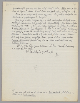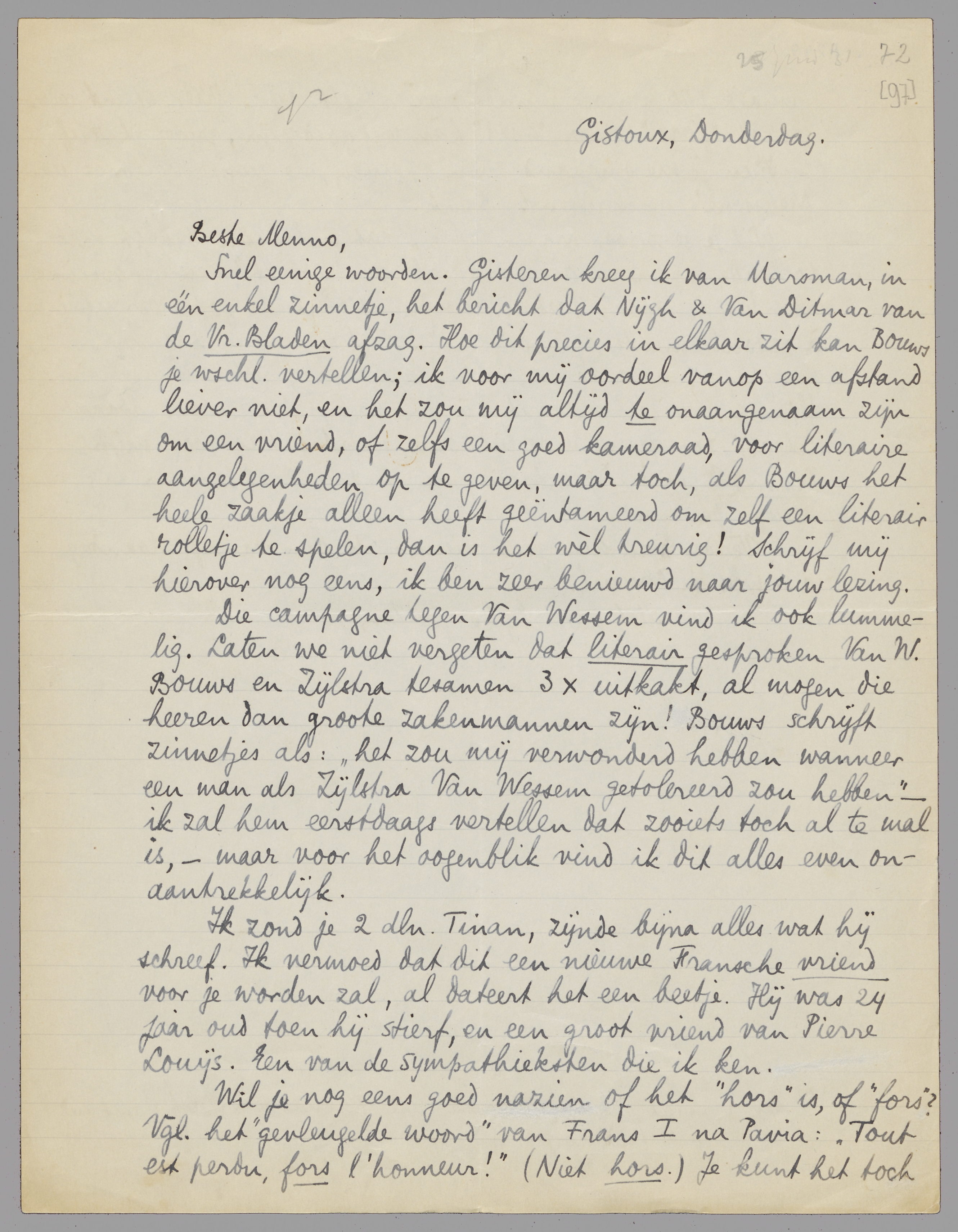 Snel eenige woorden. Gisteren kreeg ik van Marsman, in één enkel zinnetje, het bericht dat Nijgh & Van Ditmar van de Vr. Bladen afzag. Hoe dit precies in elkaar zit kan Bouws je wschl. vertellen; ik voor mij oordeel van op een afstand liever niet, en het zou mij altijd te onaangenaam zijn om een vriend, of zelfs een goed kameraad, voor literaire aangelegenheden op te geven, maar toch, als Bouws het heele zaakje alleen heeft geëntameerd om zelf een literair rolletje te spelen, dan is het wèl treurig! Schrijf mij hierover nog eens, ik ben zeer benieuwd naar jouw lezing.