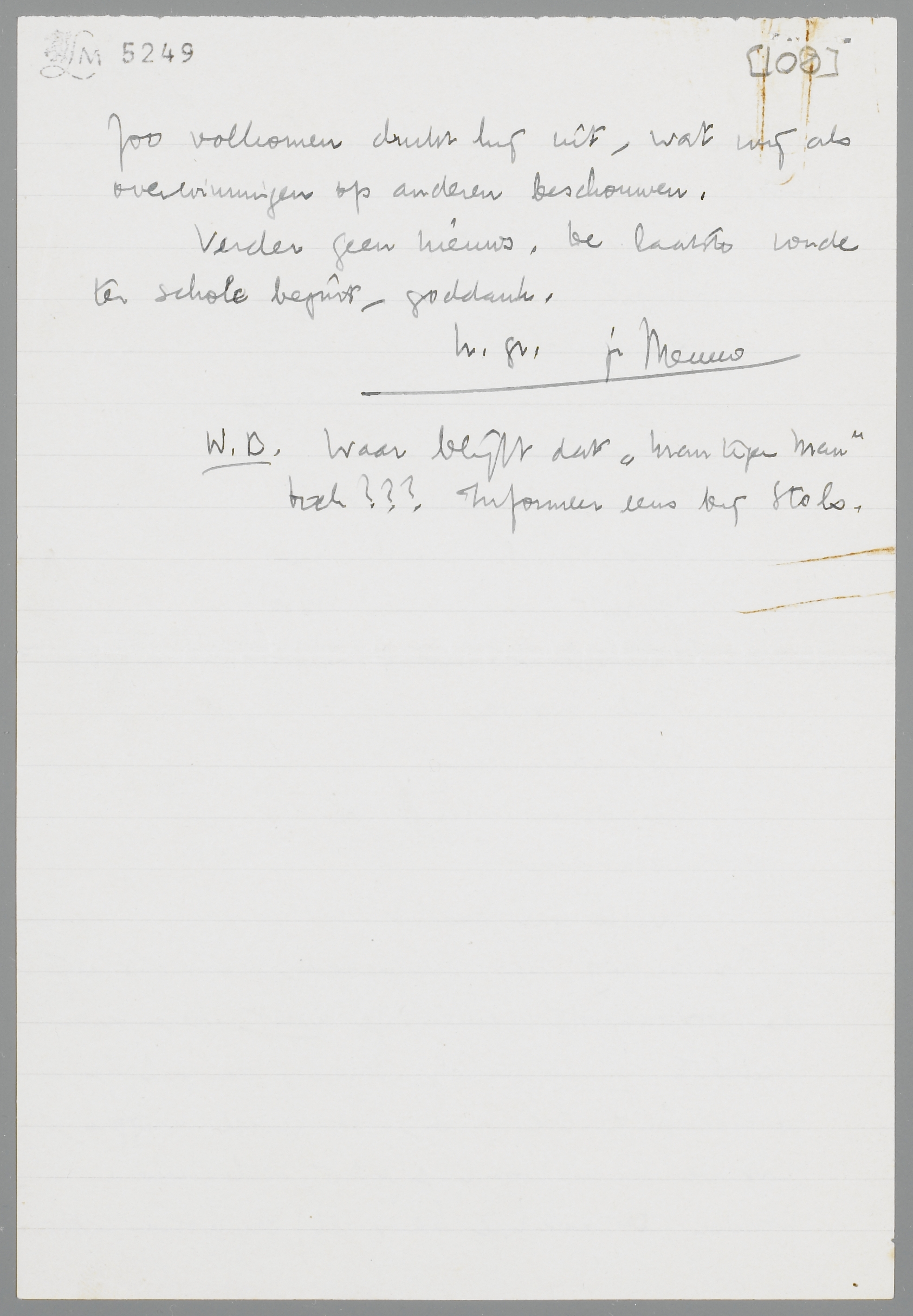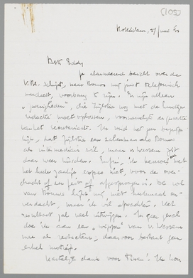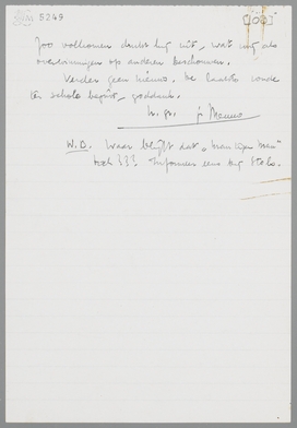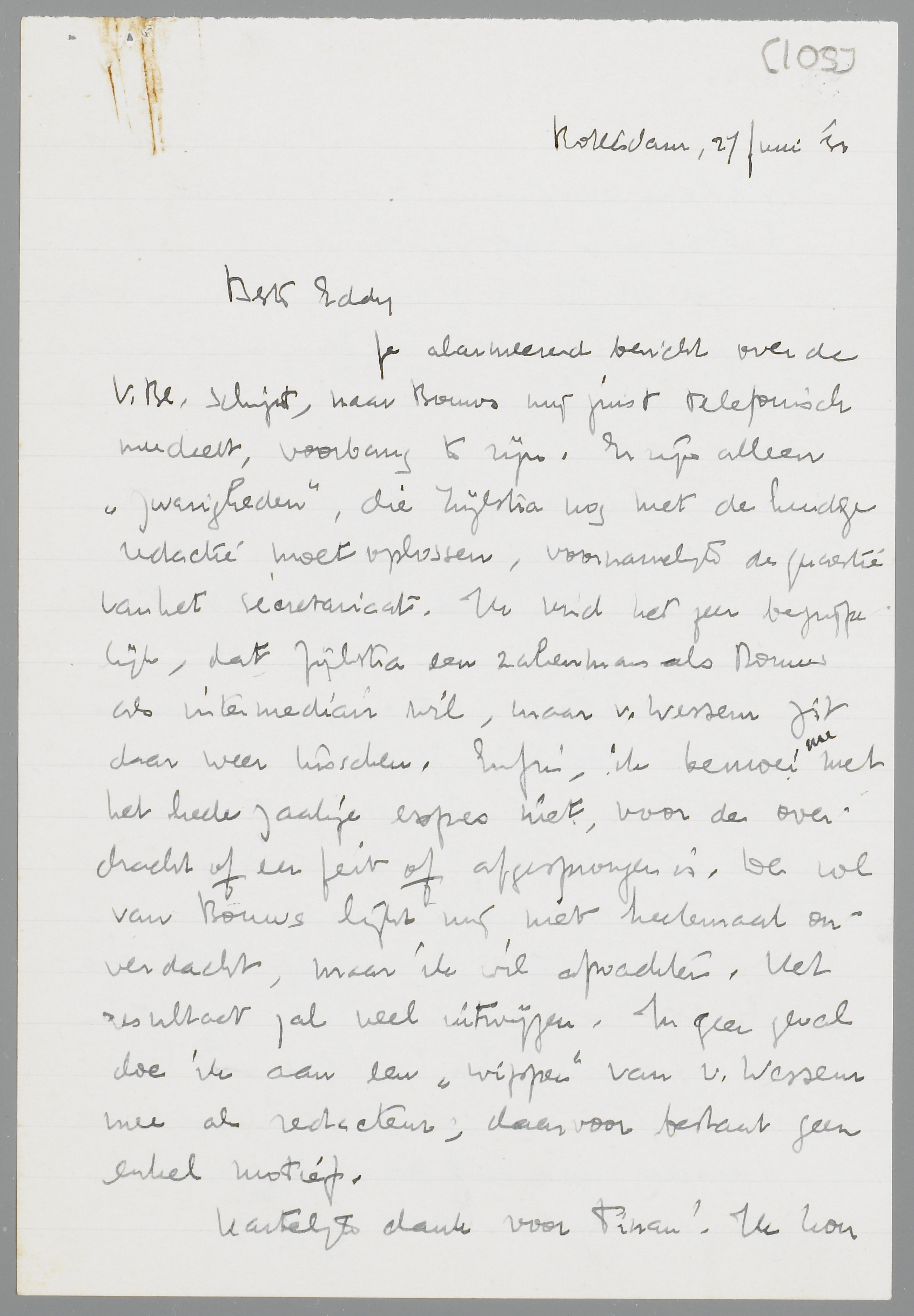 Je alarmeerend bericht over de V.Bl. schijnt, naar Bouws mij juist telefonisch meedeelt, voorbarig te zijn. Er zijn alleen ‘zwarigheden’, die Zijlstra nog met de huidige redactie moet oplossen, voornamelijk de quaestie van het secretariaat. Ik vind het zeer begrijpelijk, dat Zijlstra een zakenman als Bouws als intermediair wil, maar v. Wessem zit daar weer tusschen. Enfin, ik bemoei me met het heele zaakje expres niet, voor de overdracht of een feit of afgesprongen is. De rol van Bouws lijkt mij niet heelemaal onverdacht, maar ik wil afwachten. Het resultaat zal veel uitwijzen. In geen geval doe ik aan een ‘wippen’ van v. Wessem mee als redacteur, daarvoor bestaat geen enkel motief.