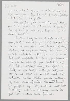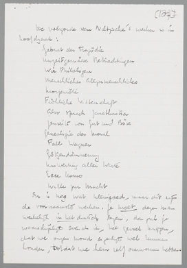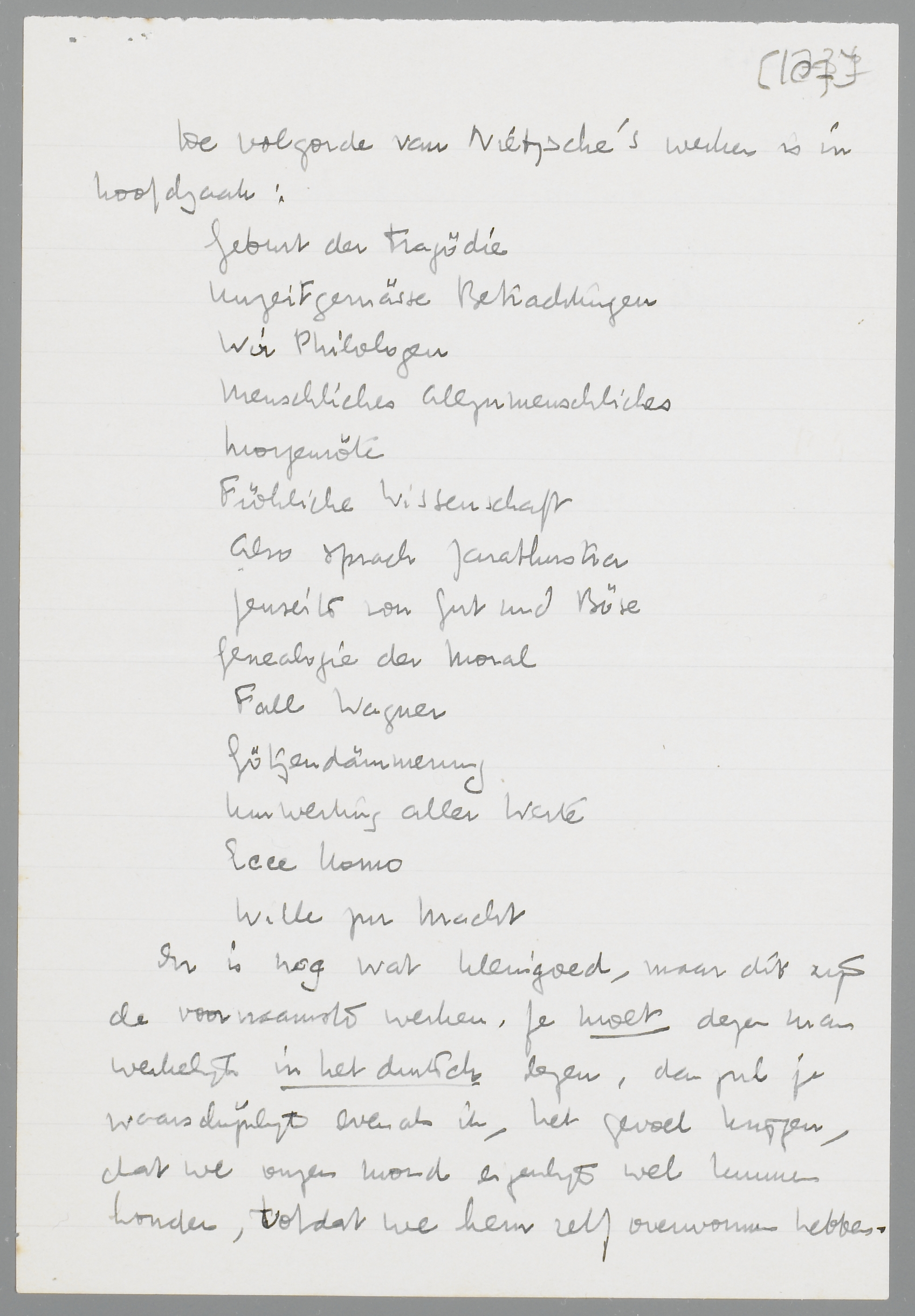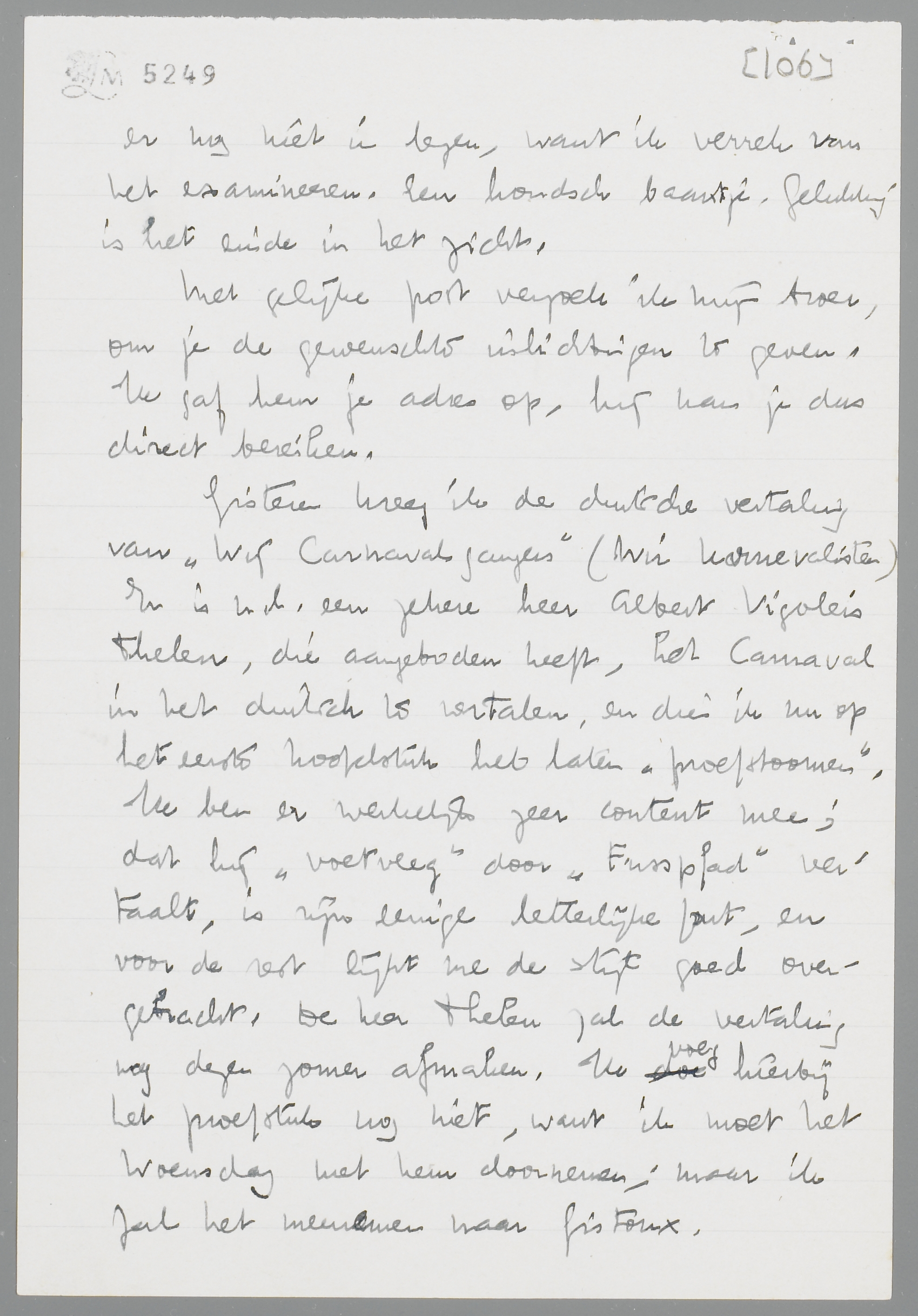 Gisteren kreeg ik de duitsche vertaling van Wij Carnavalsgangers (Wir Karnevalisten). Er is n.l. een zekere heer Albert Vigoleis Thelen, die aangeboden heeft, het Carnaval in het duitsch te vertalen, en dien ik nu op het eerste hoofdstuk heb laten ‘proefstoomen’. Ik ben er werkelijk zeer content mee; dat hij ‘voetveeg’ door ‘Fusspfad’ vertaalt, is zijn eenige letterlijke fout, en voor de rest lijkt me de stijl goed overgebracht. De heer Thelen zal de vertaling nog dezen zomer afmaken. Ik voeg hierbij het proefstuk nog niet, want ik moet het Woensdag met hem doornemen; maar ik zal het meenemen naar Gistoux. De volgorde van Nietzsche's werken is in hoofdzaak:
