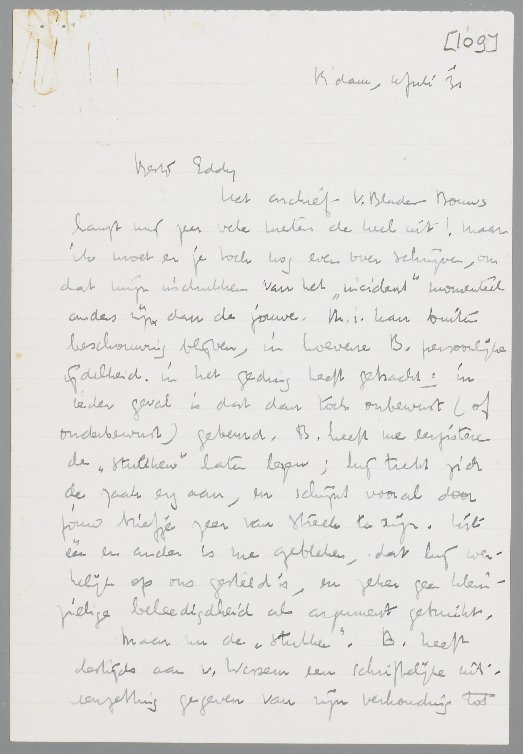 Het archief V. Bladen-Bouws hangt mij zeer vele meters de keel uit! Maar ik moet er je toch nog even over schrijven, omdat mijn indrukken van het ‘incident’ momenteel anders zijn dan de jouwe. M.i. kan buiten beschouwing blijven, in hoeverre B. persoonlijke ijdelheid in het geding heeft gebracht; in ieder geval is dat dan toch onbewust (of onderbewust) gebeurd. B. heeft me eergisteren de ‘stukken’ laten lezen; hij trekt zich de zaak erg aan, en schijnt vooral door jouw briefje zeer van streek te zijn. Uit één en ander is me gebleken, dat hij werkelijk op ons gesteld is, en zeker geen kleinzielige beleedigdheid als argument gebruikt.