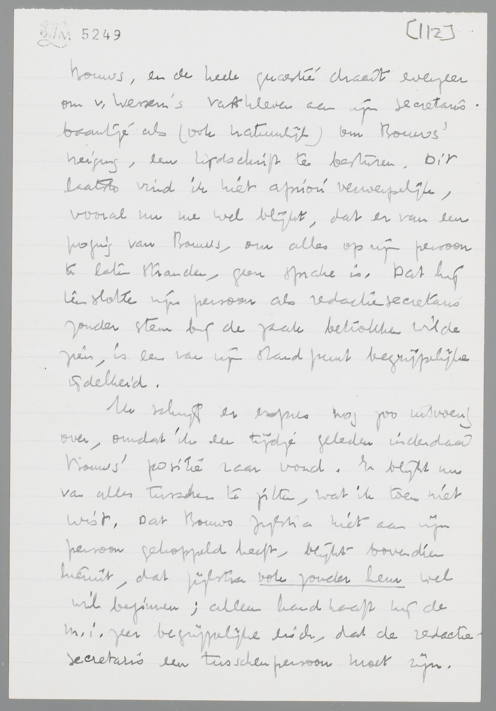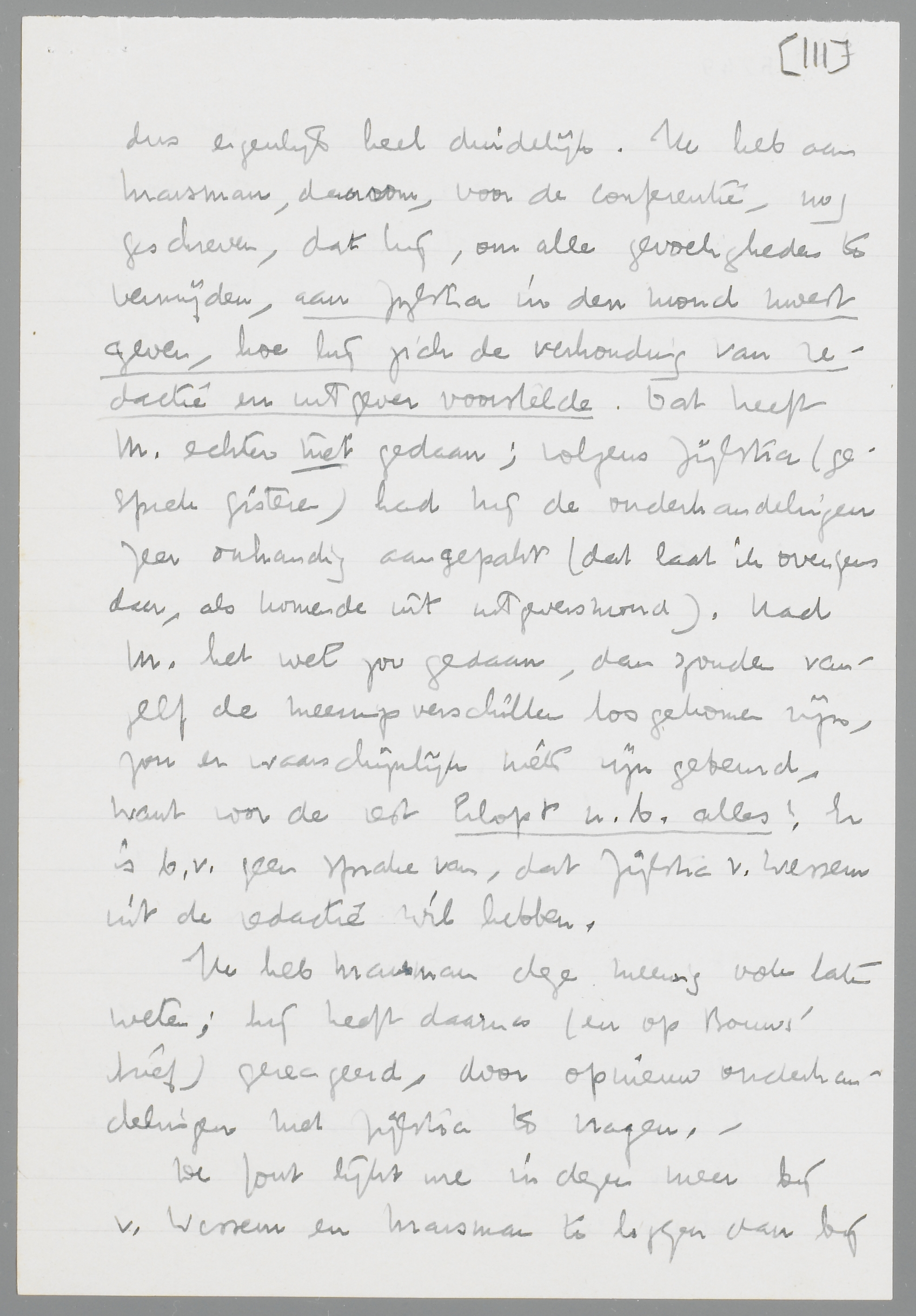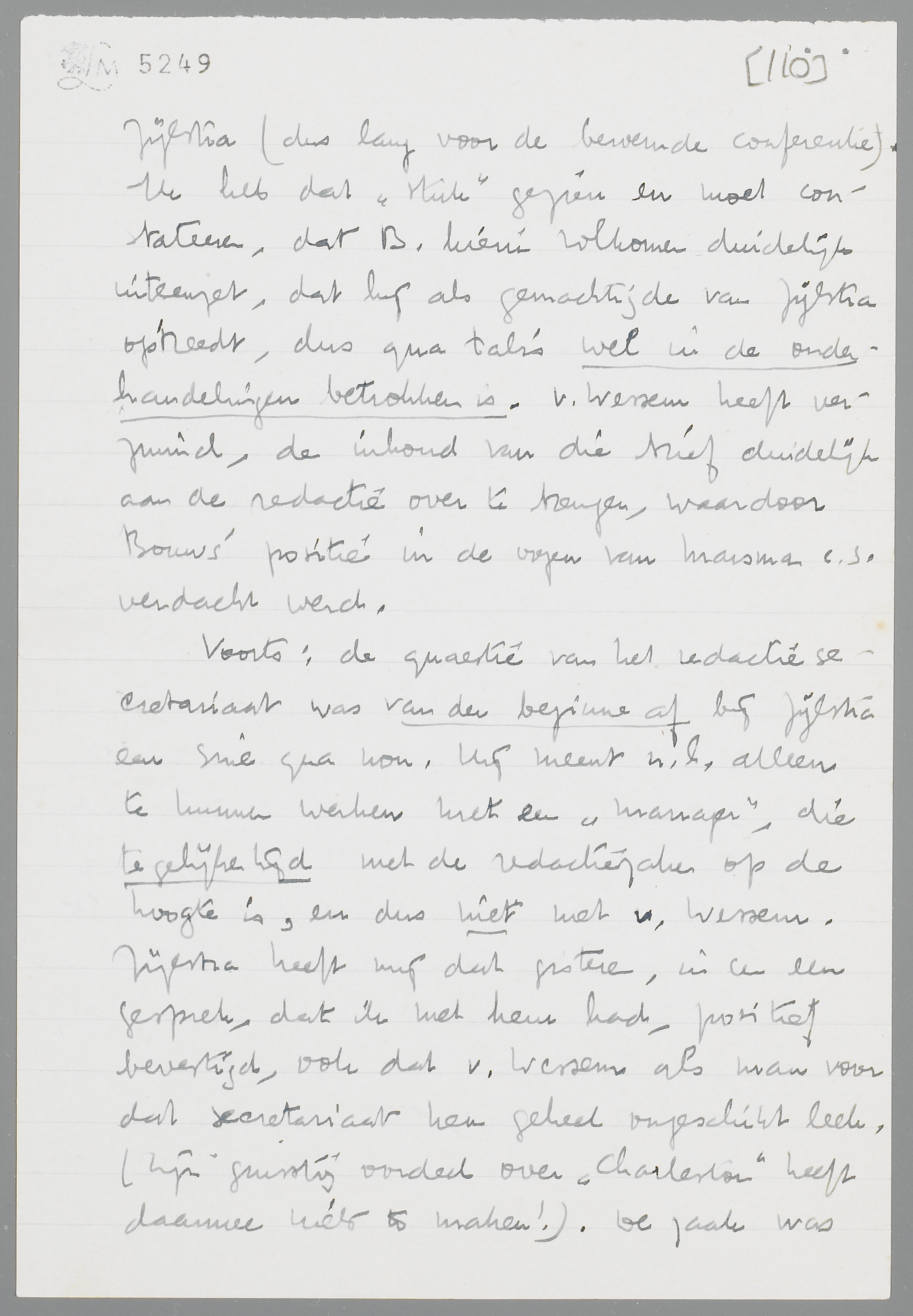 Voorts: de quaestie van het redactie-secretariaat was van den beginne af bij Zijlstra een sine qua non. Hij meent n.l. alleen te kunnen werken met een ‘manager’, die tegelijkertijd met de redactiezaken op de hoogte is, en dus niet met v. Wessem. Zijlstra heeft mij dat gisteren, in een gesprek, dat ik met hem had, positief bevestigd, ook dat v. Wessem als man voor dat secretariaat hem geheel ongeschikt leek. (Zijn gunstig oordeel over Charleston heeft daarmee niets te maken!). De zaak was dus eigenlijk heel duidelijk. Ik heb aan Marsman, daarom, voor de conferentie, nog geschreven, dat hij, om alle gevoeligheden te vermijden, aan Zijlstra in den mond moest geven, hoe hij zich de verhouding van redactie en uitgever voorstelde. Dat heeft M. echter niet gedaan; volgens Zijlstra (gesprek gisteren) had hij de onderhandelingen zeer onhandig aangepakt (dat laat ik overigens daar, als komende uit uitgeversmond). Had M. het wel zoo gedaan, dan zouden vanzelf de meeningsverschillen los gekomen zijn, zou er waarschijnlijk niets zijn gebeurd, want voor de rest klopt n.b. alles! Er is b.v. geen sprake van, dat Zijlstra v. Wessem uit de redactie wil hebben.