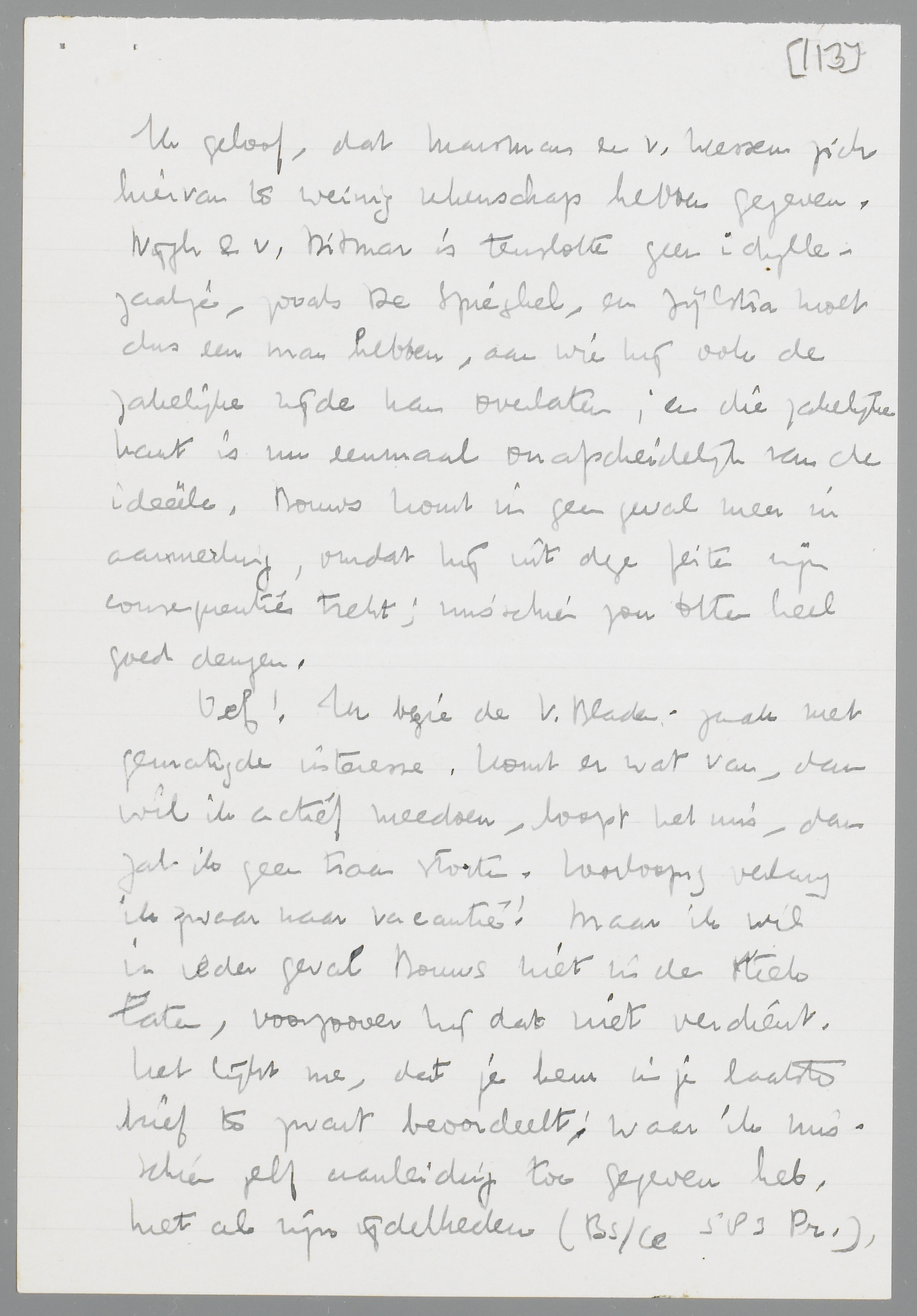 Oef! Ik bezie de V. Bladen-zaak met gematigde interesse. Komt er wat van, dan wil ik actief meedoen, loopt het mis, dan zal ik geen traan storten. Voorloopig verlang ik zwaar naar vacantie! Maar ik wil in ieder geval Bouws niet in de steek laten, voorzoover hij dat niet verdient. Het lijkt me, dat je hem in je laatste brief te zwart beoordeelt; waar ik misschien zelf aanleiding toe gegeven heb, met al zijn ijdelheden (Bs/ce 583 Pr.), die wij tenslotte evengoed hebben, staat hij in dit geval m.i. niet ‘schuldig’, of tenminste niet alleen. Zijn antwoord aan Marsman vind ik ook zeer loyaal.