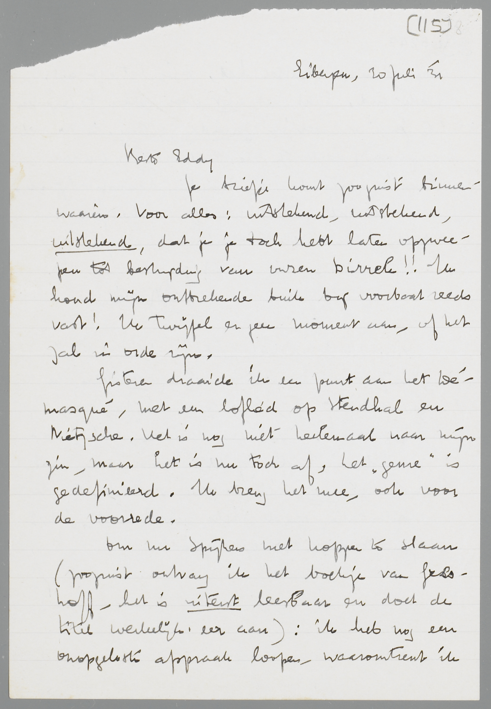 Om nu spijkers met koppen te slaan (zoojuist ontvang ik het boekje van Greshoff, het is uiterst leesbaar en doet de titel werkelijk eer aan): ik heb nog een onopgeloste afspraak loopen, waaromtrent ik nog geen uitsluitsel heb. Die betreft a.s. weekend. Gaat het niet door, dan telegrafeer ik je, wanneer ik Zaterdag 1 Aug. in Brussel aankom (denkelijk de Pullman). Anders kom ik Maandag of Dinsdag daarop volgend.