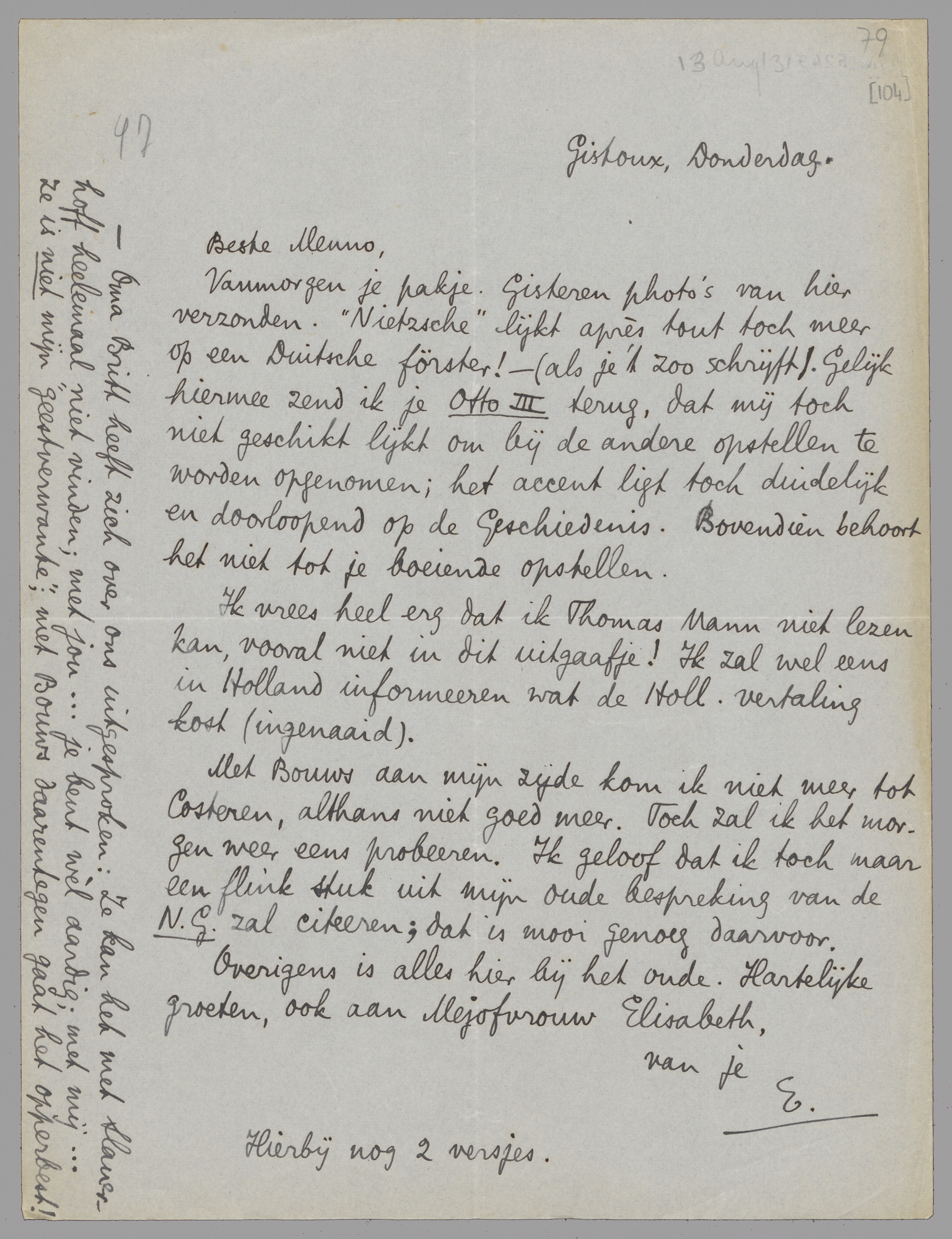 Vanmorgen je pakje. Gisteren photo's van hier verzonden. ‘Nietzsche’ lijkt après tout toch meer op een Duitsche förster! - (als je 't zoo schrijft). Gelijk hiermee zend ik je Otto III terug, dat mij toch niet geschikt lijkt om bij de andere opstellen te worden opgenomen; het accent ligt toch duidelijk en doorloopend op de Geschiedenis. Bovendien behoort het niet tot je boeiende opstellen.