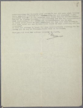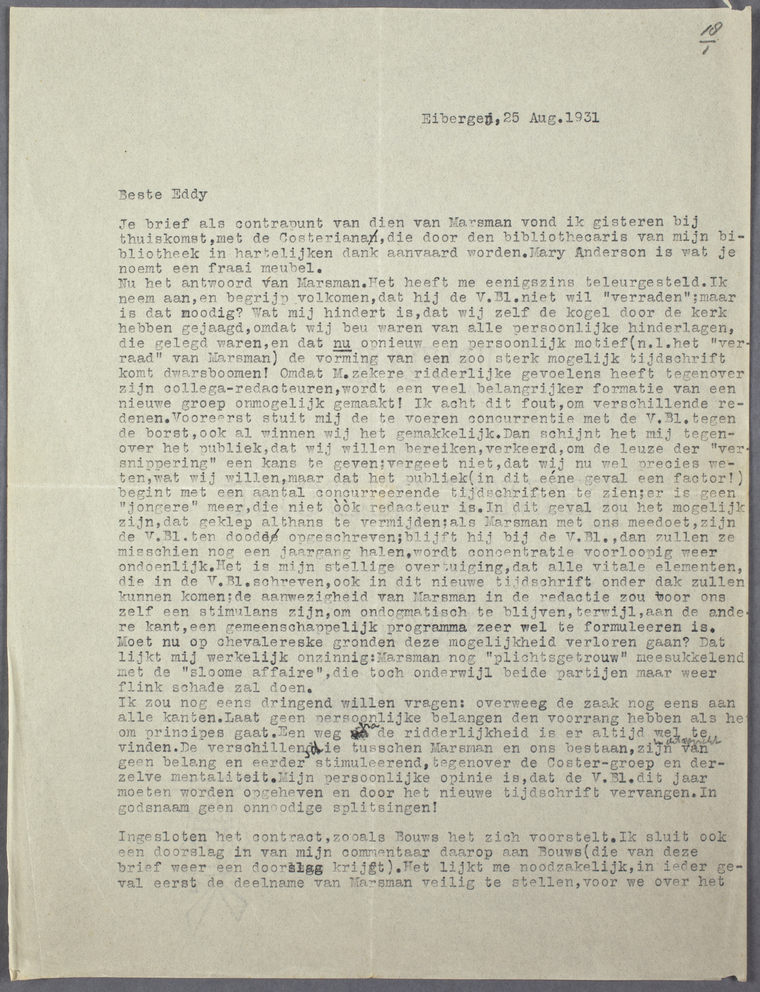 Ik zou nog eens dringend willen vragen: overweeg de zaak nog eens aan alle kanten. Laat geen persoonlijke belangen den voorrang hebben als het om principes gaat. Een weg [via] de ridderlijkheid is er altijd wel te vinden. De verschillen, die tussen Marsman en ons bestaan, zijn in dit opzicht van geen belang en eerder stimuleerend, tegenover de Coster-groep en derzelve mentaliteit. Mijn persoonlijke opinie is, dat de V.Bl. dit jaar moeten worden opgeheven en door het nieuwe tijdschrift vervangen. In godsnaam geen onnoodige splitsingen!