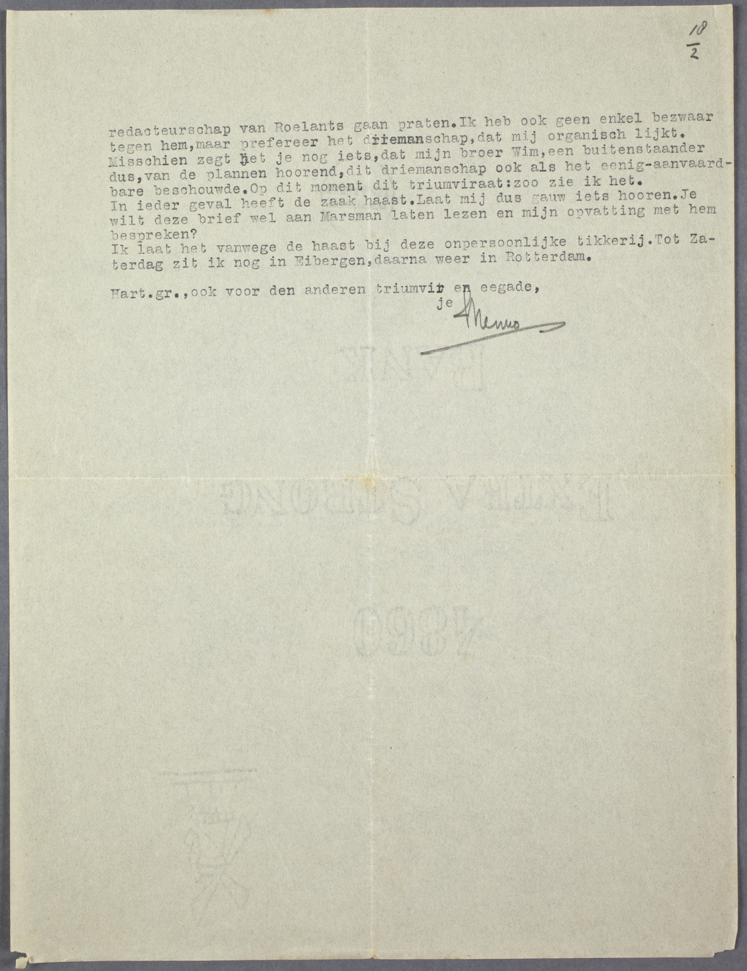 Ingesloten het contract, zooals Bouws het zich voorstelt. Ik sluit ook een doorslag in van mijn commentaar daarop aan Bouws (die van deze brief weer een doorslag krijgt). Het lijkt me noodzakelijk, in ieder geval eerst de deelname van Marsman veilig te stellen, voor we over het redacteurschap van Roelants gaan praten. Ik heb ook geen enkel bezwaar tegen hem, maar prefereer het driemanschap, dat mij organisch lijkt. Misschien zegt het je nog iets, dat mijn broer Wim, een buitenstaander dus, van de planner hoorend, dit driemanschap ook als het eenig-aanvaardbare beschouwde. Op dit moment dit triumviraat: zoo zie ik het.