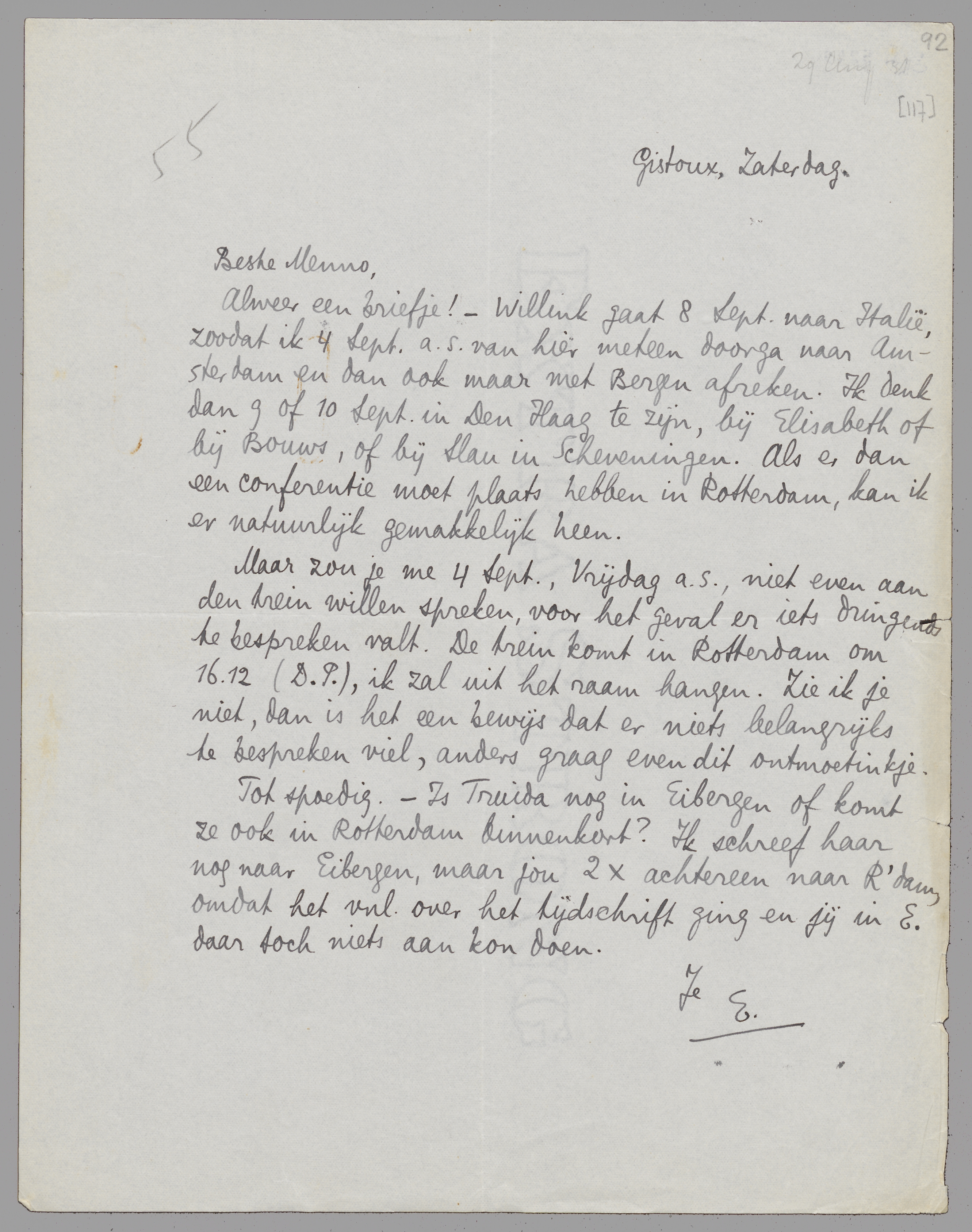 Alweer een briefje! - Willink gaat 8 Sept. naar Italië, zoodat ik 4 Sept. a.s. van hier meteen doorga naar Amsterdam en dan ook maar met Bergen afreken. Ik denk dan 9 of 10 Sept. in Den Haag te zijn, bij Elisabeth of bij Bouws, of bij Slau in Scheveningen. Als er dan een conferentie moet plaats hebben in Rotterdam, kan ik er natuurlijk gemakkelijk heen.