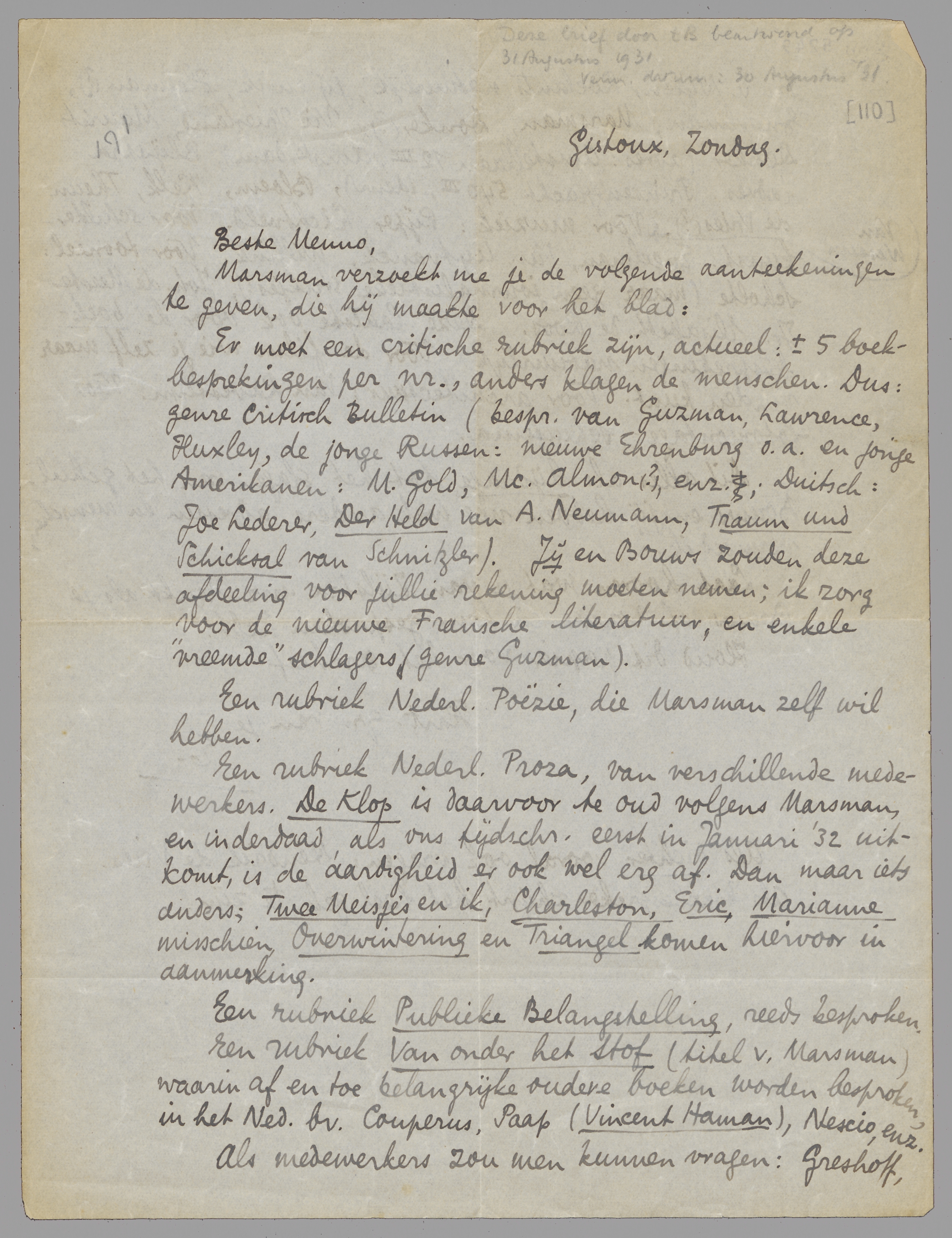 Er moet een critische rubriek zijn, actueel: ± 5 boekbesprekingen per nr., anders klagen de menschen. Dus: genre Critisch Bulletin (bespr. van Guzman, Lawrence, Huxley, de jonge Russen: nieuwe Ehrenburg o.a. en jonge Amerikanen: M. Gold, Mc. Almon(?), enz.; Duitsch: Joe Lederer, Der Held van A. Neumann, Traum und Schicksal van Schnitzler). Jij en Bouws zouden deze afdeeling voor jullie rekening moeten nemen; ik zorg voor de nieuwe Fransche literatuur, en enkele ‘vreemde’ schlagers (genre Guzman).