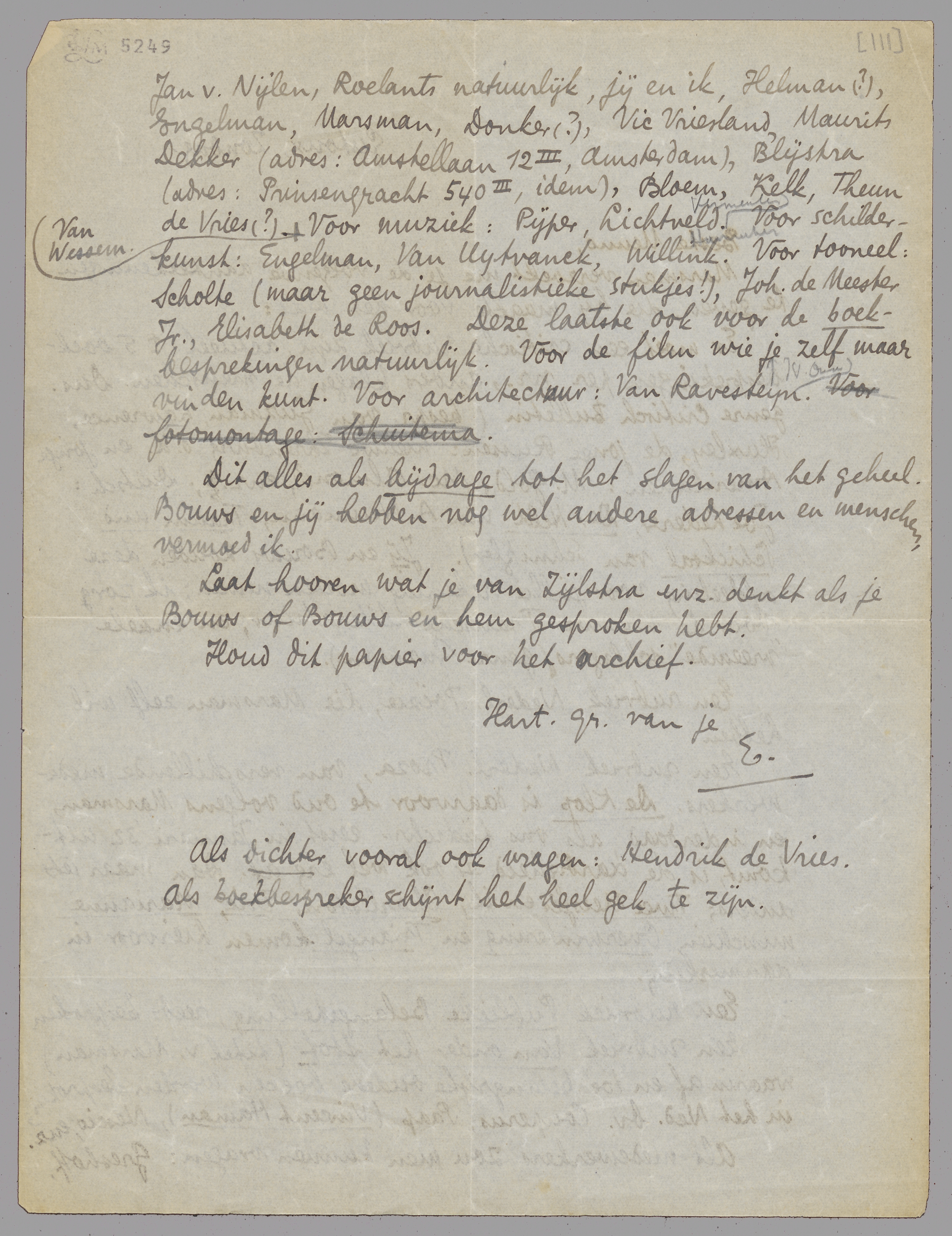 Als medewerkers zou men kunnen vragen: Greshoff, Jan v. Nijlen, Roelants natuurlijk, jij en ik, Helman(?), Engelman, Marsman, Donker(?), Vic Vriesland, Maurits Dekker (adres: Amstellaan 12III, Amsterdam), Blijstra (adres: Prinsengracht 540III, idem), Bloem, Kelk, Theun de Vries(?), Van Wessem. Voor muziek: Pijper, Lichtveld. Voor schilderkunst: Engelman, Van Uytvanck, Willink. Voor tooneel: Scholte (maar geen journalistieke stukjes!), Joh. de Meester Jr., Elisabeth de Roos. Deze laatste ook voor de boekbesprekingen natuurlijk. Voor de film wie je zelf maar vinden kunt. Voor architectuur: Van Ravesteijn. Voor fotomontage: Schuitema.